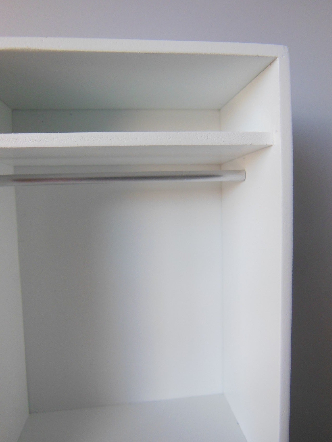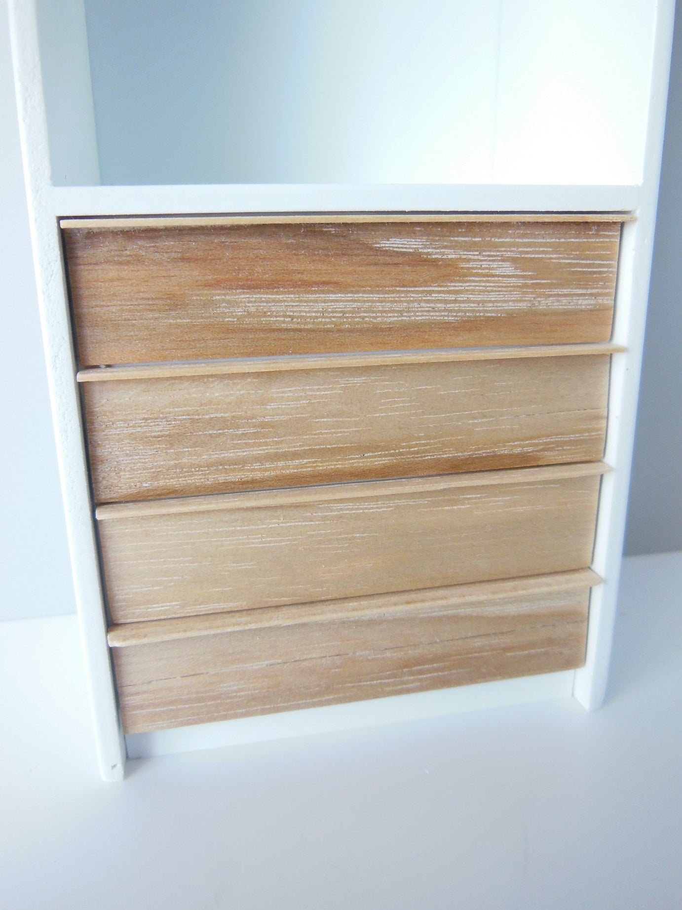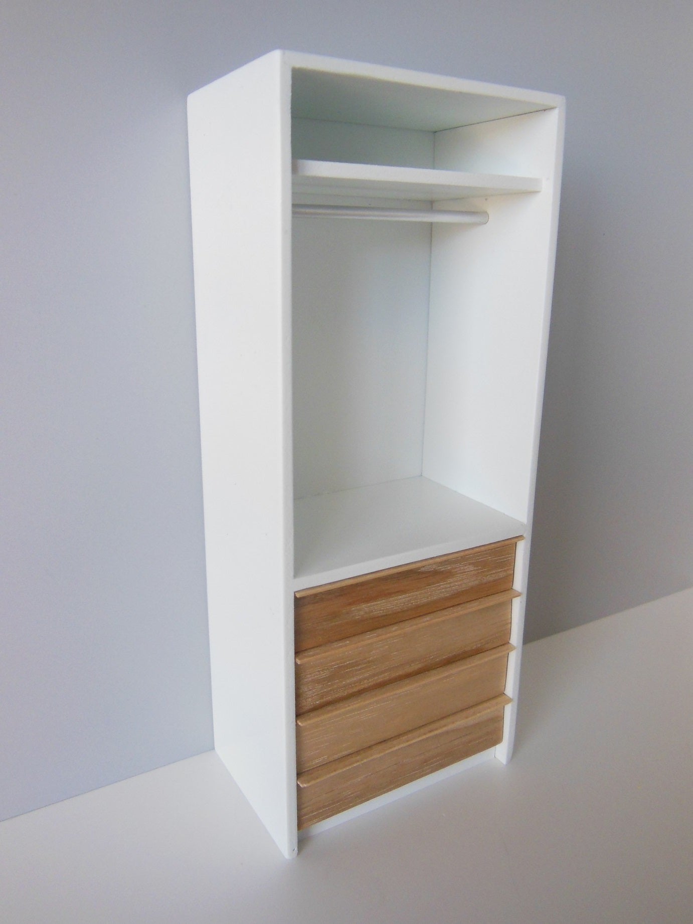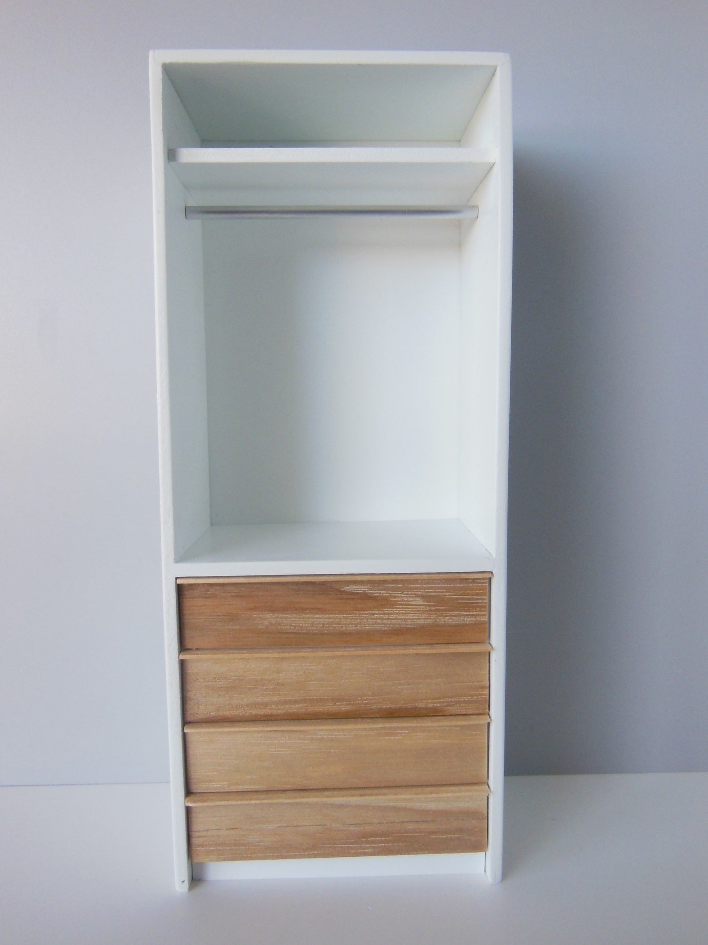 The cabinet exterior is made of white plastic. Each of the drawer fronts is made of solid wood and are carefully selected for their grain pattern. No two are exactly the same, but I come as close as I can to the original picture. There is a polished aluminum garment bar in the upper part of the cabinet. Drawers do not open.