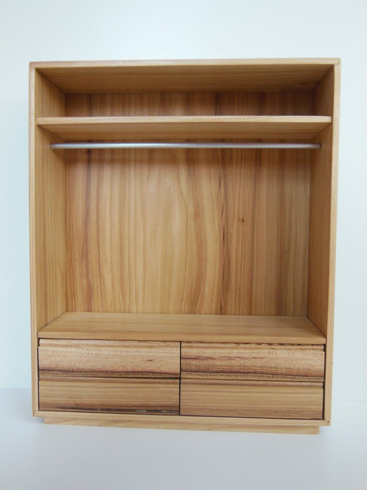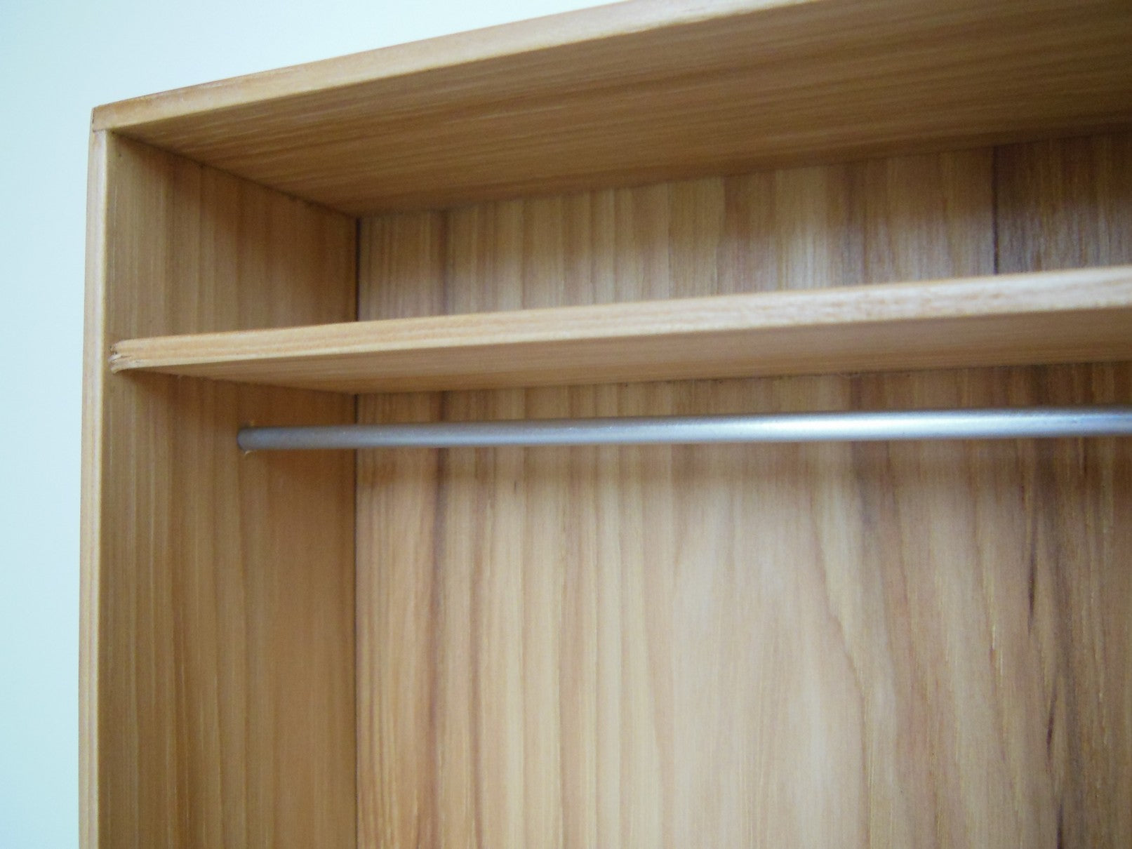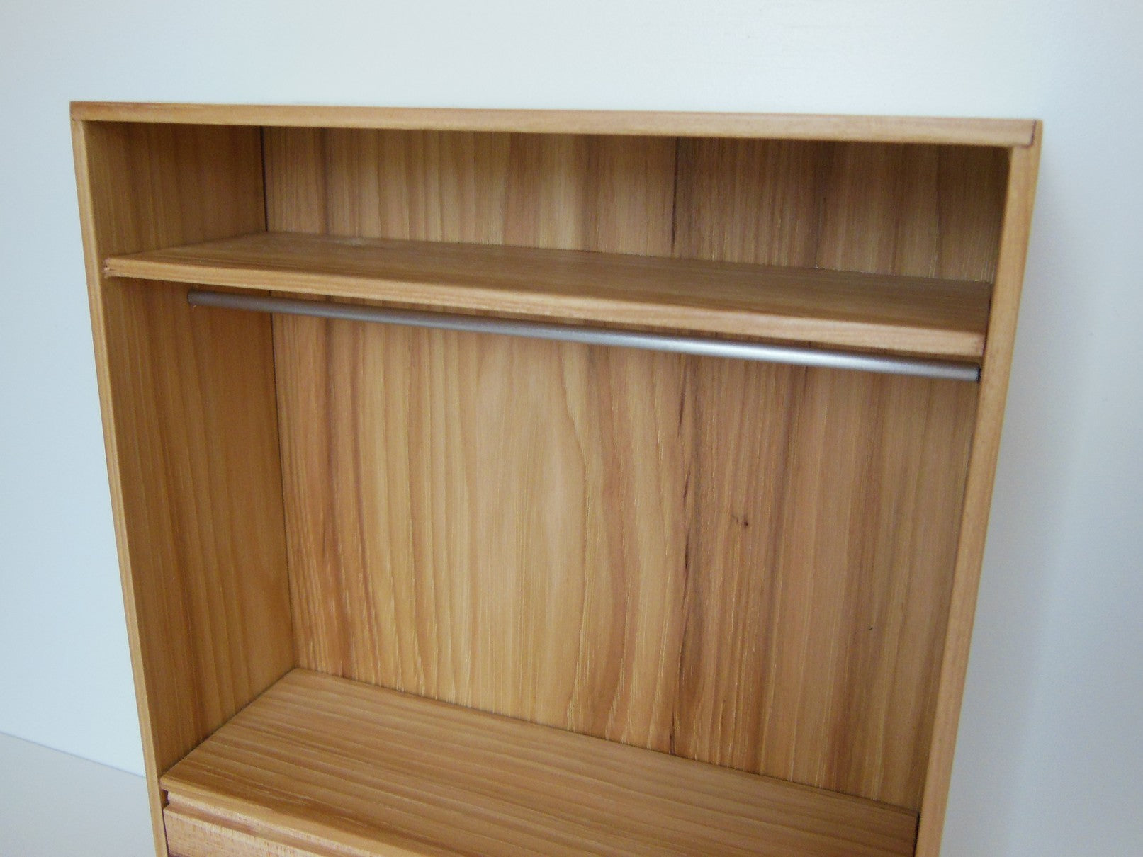 Made of solid wood, each of the drawer fronts are carefully selected for their grain pattern. No two are exactly the same, but I come as close as I can to the original picture. There is a polished aluminum garment bar in the upper part of the cabinet. Drawers do not open.