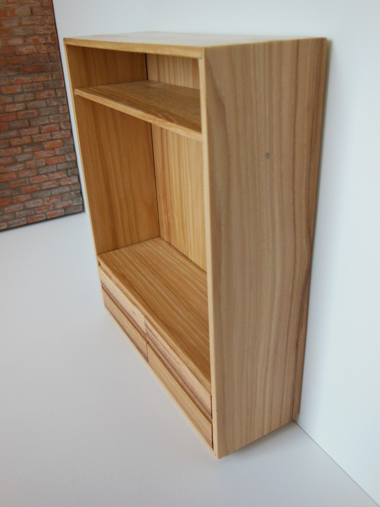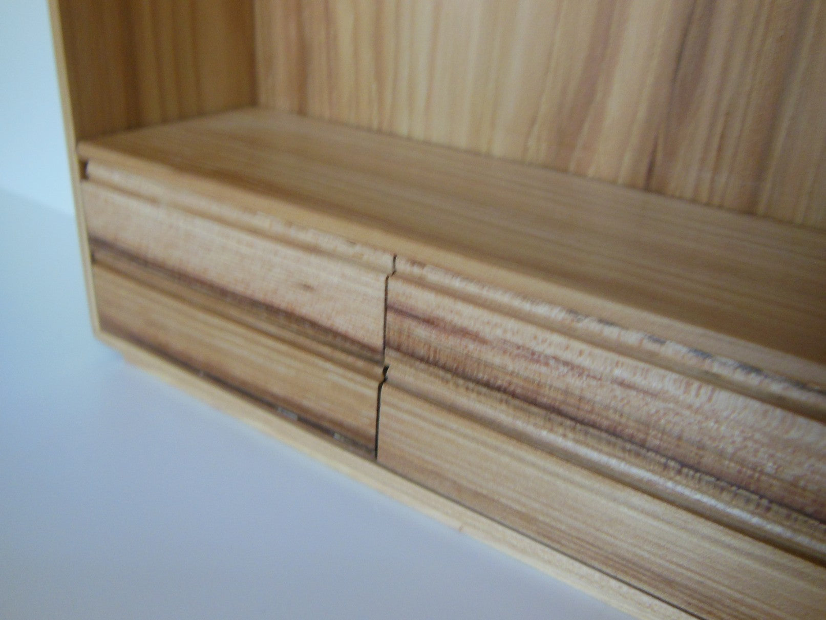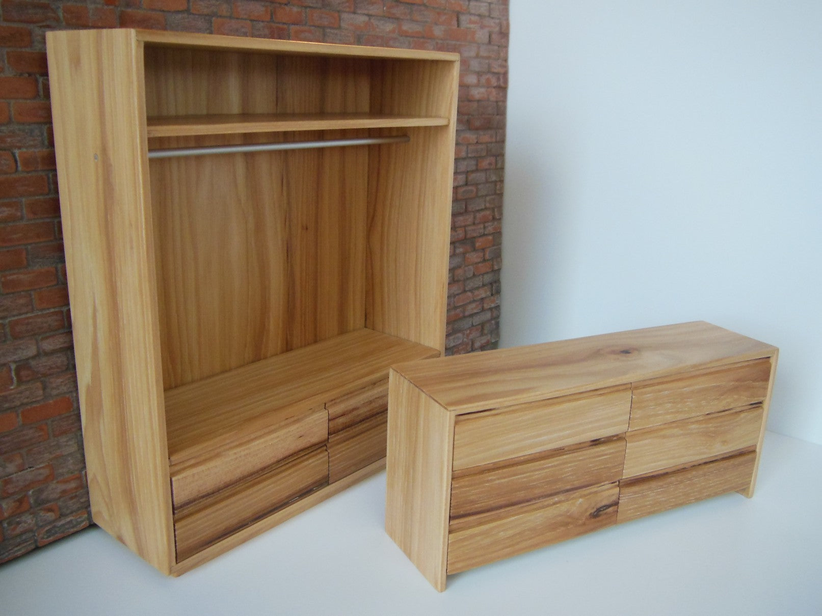 Made of solid wood, each of the drawer fronts are carefully selected for their grain pattern. No two are exactly the same, but I come as close as I can to the original picture. There is a polished aluminum garment bar in the upper part of the cabinet. Drawers do not open.