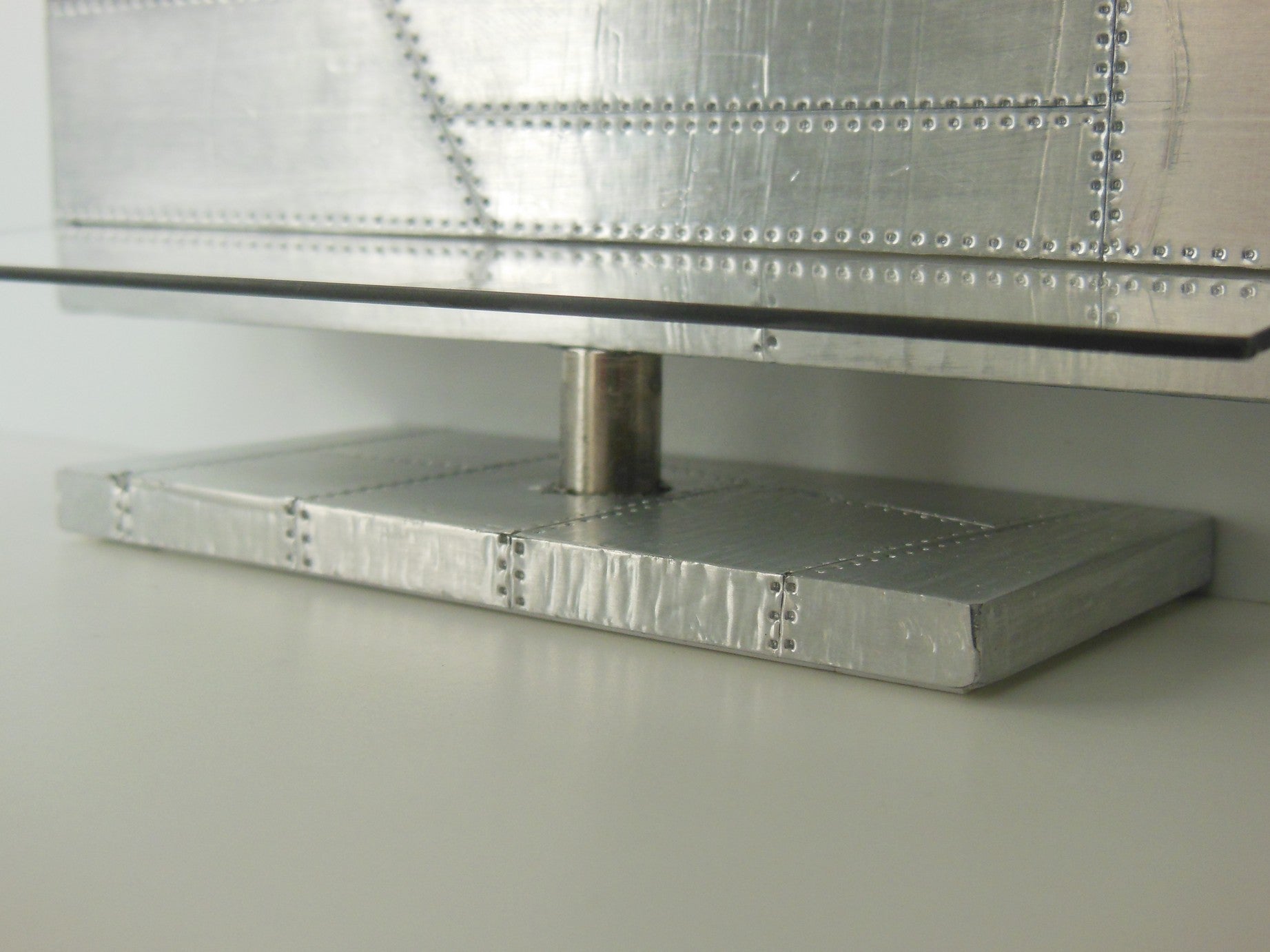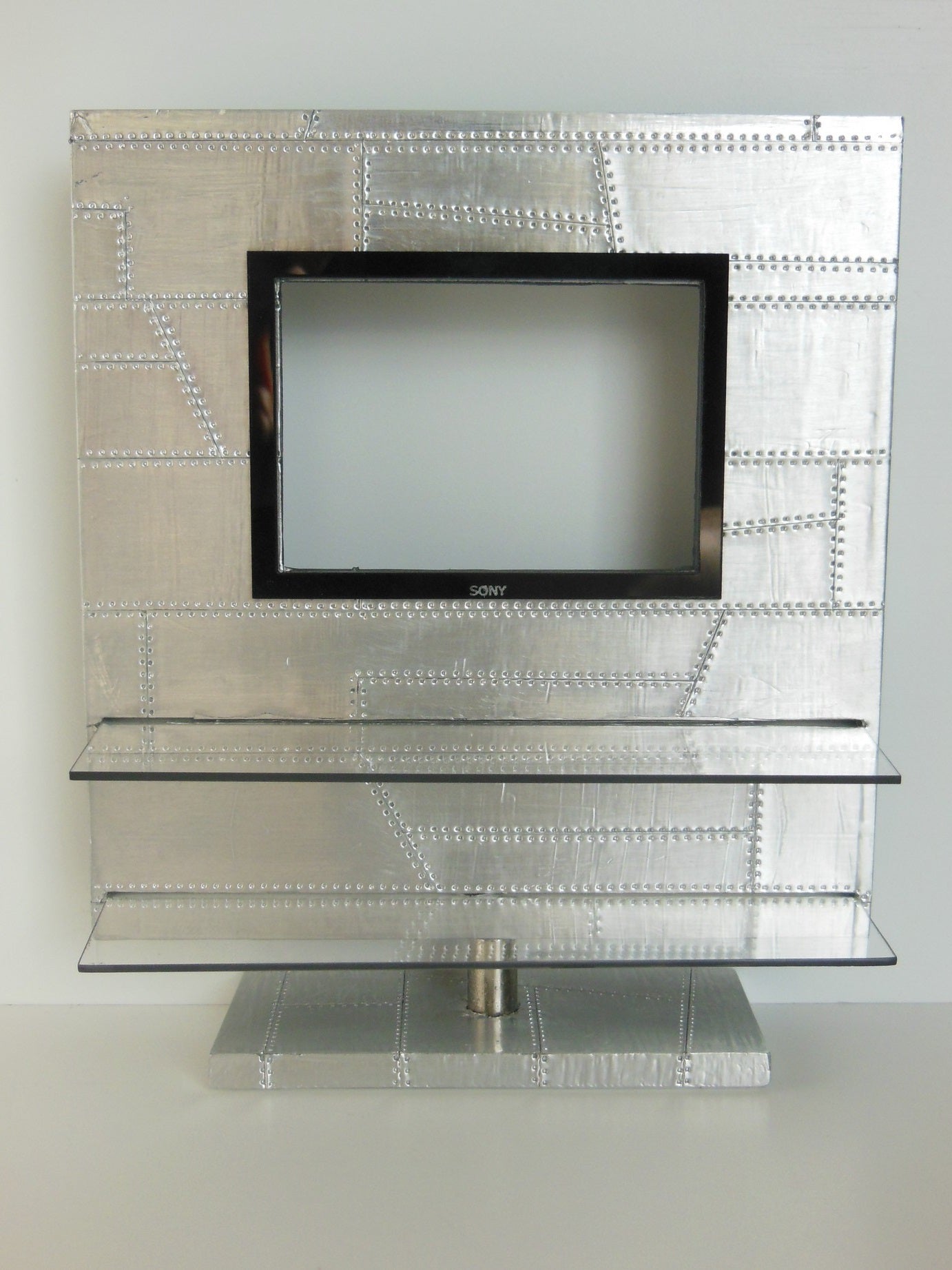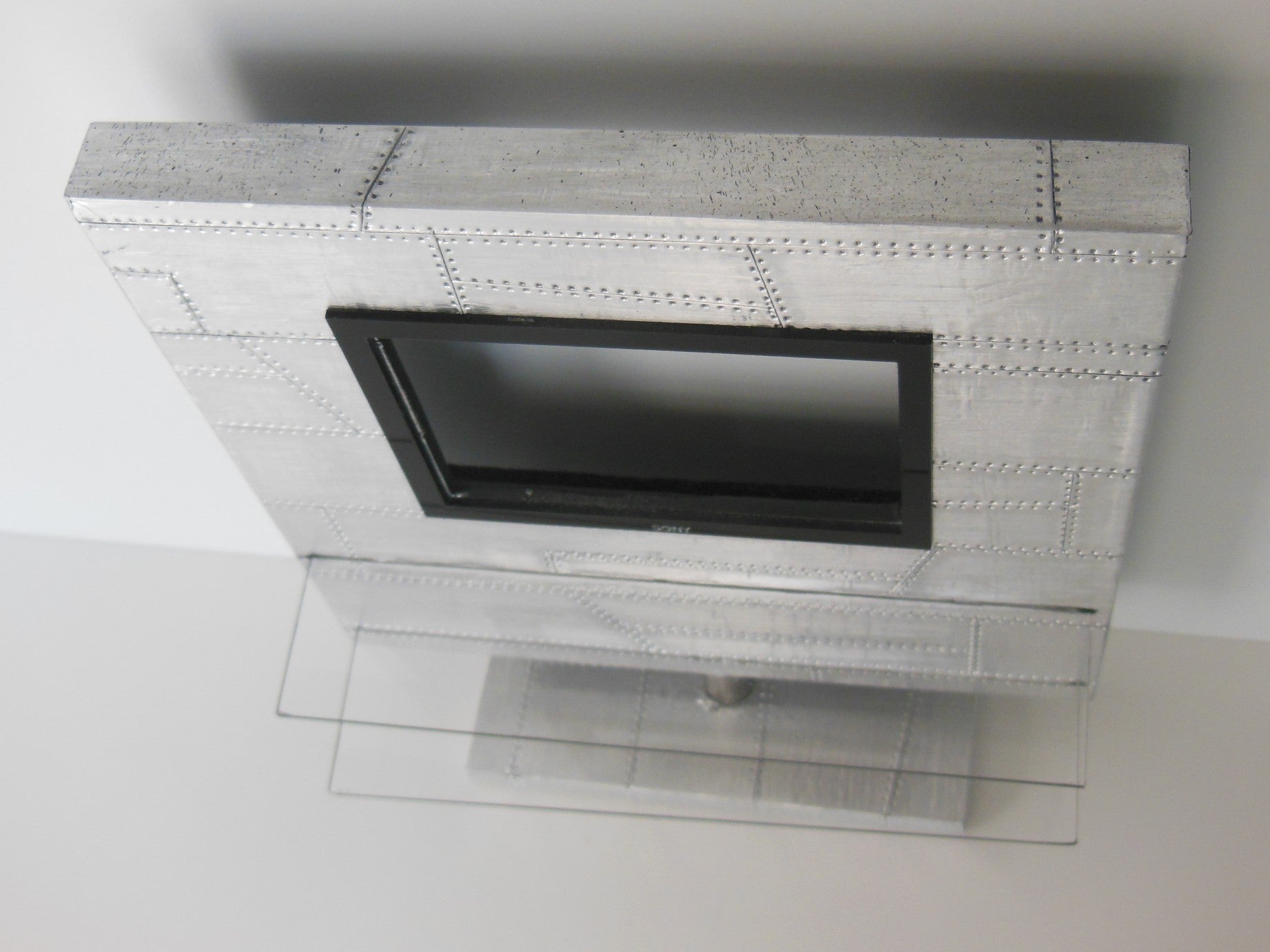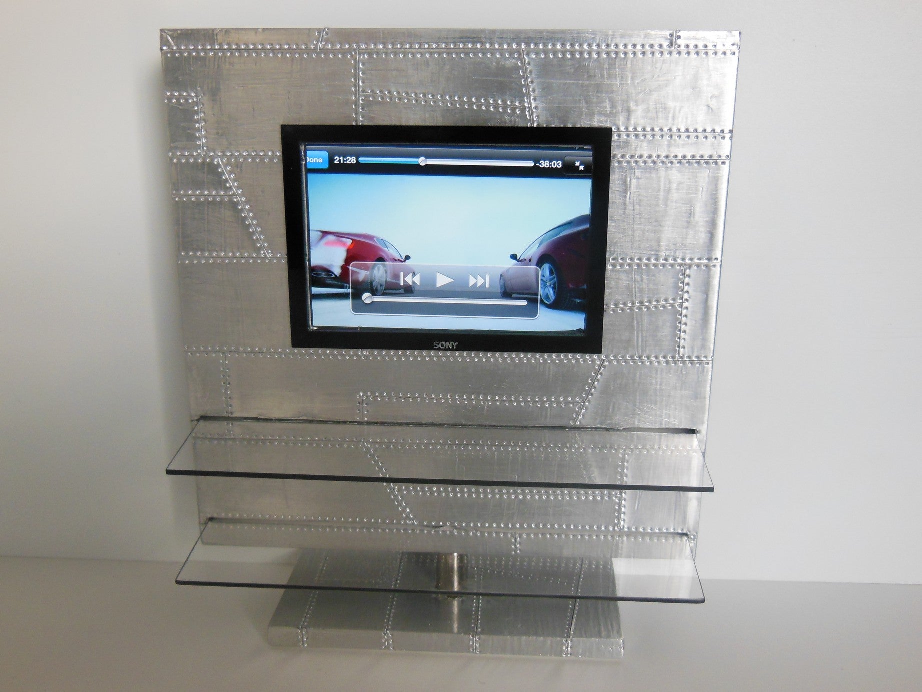 The Aviator Entertainment Unit is part of our vintage collection featuring a polished aluminum patchwork exterior accented with two glass shelves. This unit has the option of an opening where you can insert your iPhone from the back to play actual videos (as shown).