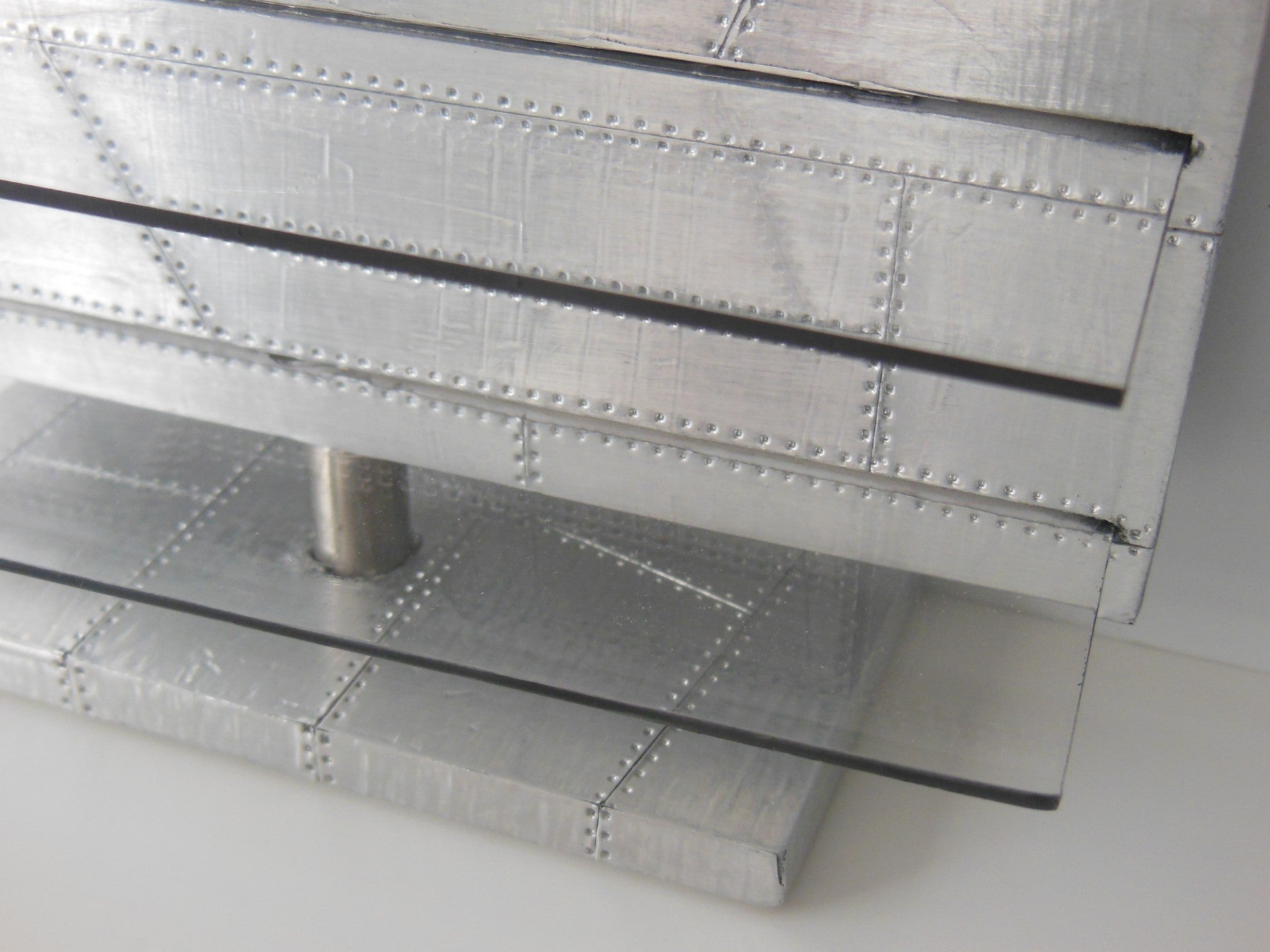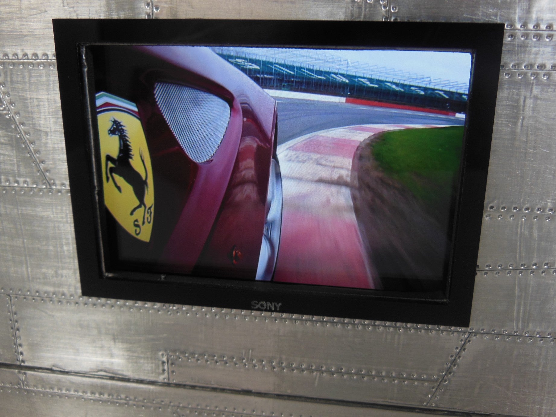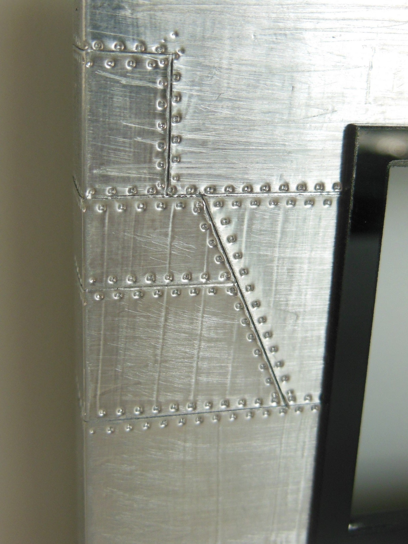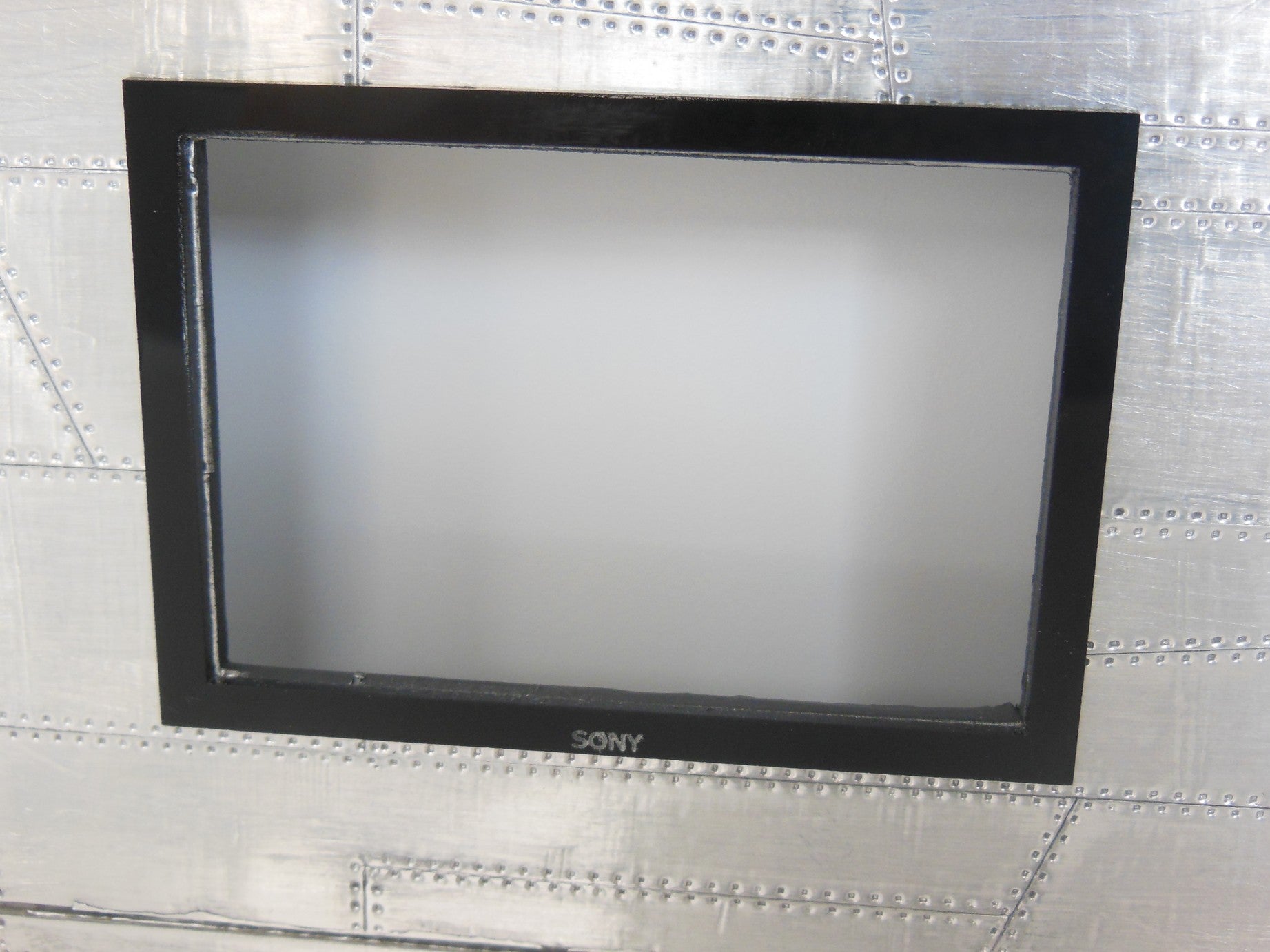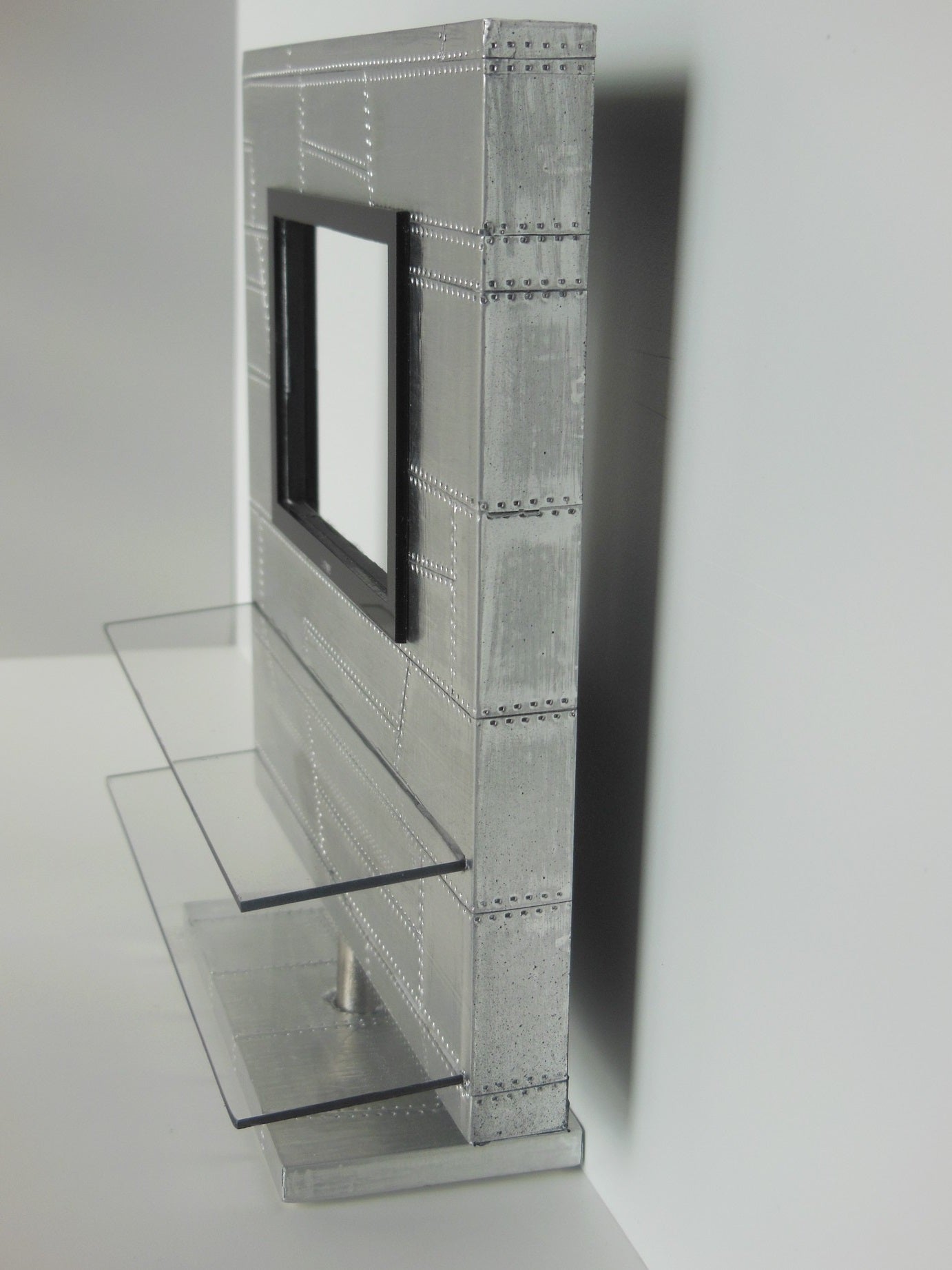 The Aviator Entertainment Unit is part of our vintage collection featuring a polished aluminum patchwork exterior accented with two glass shelves. This unit has the option of an opening where you can insert your iPhone from the back to play actual videos (as shown).