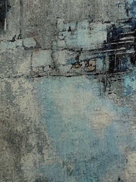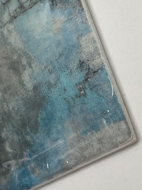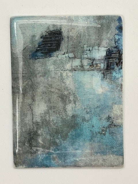 Blue and gray abstract frameless art with a high gloss epoxy finish; no frame. Can be hung horizontally or vertically.