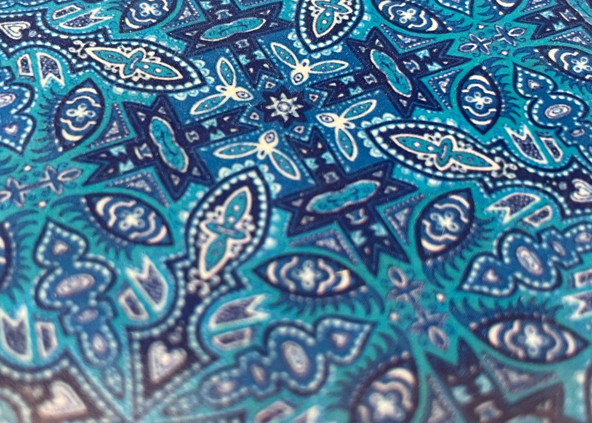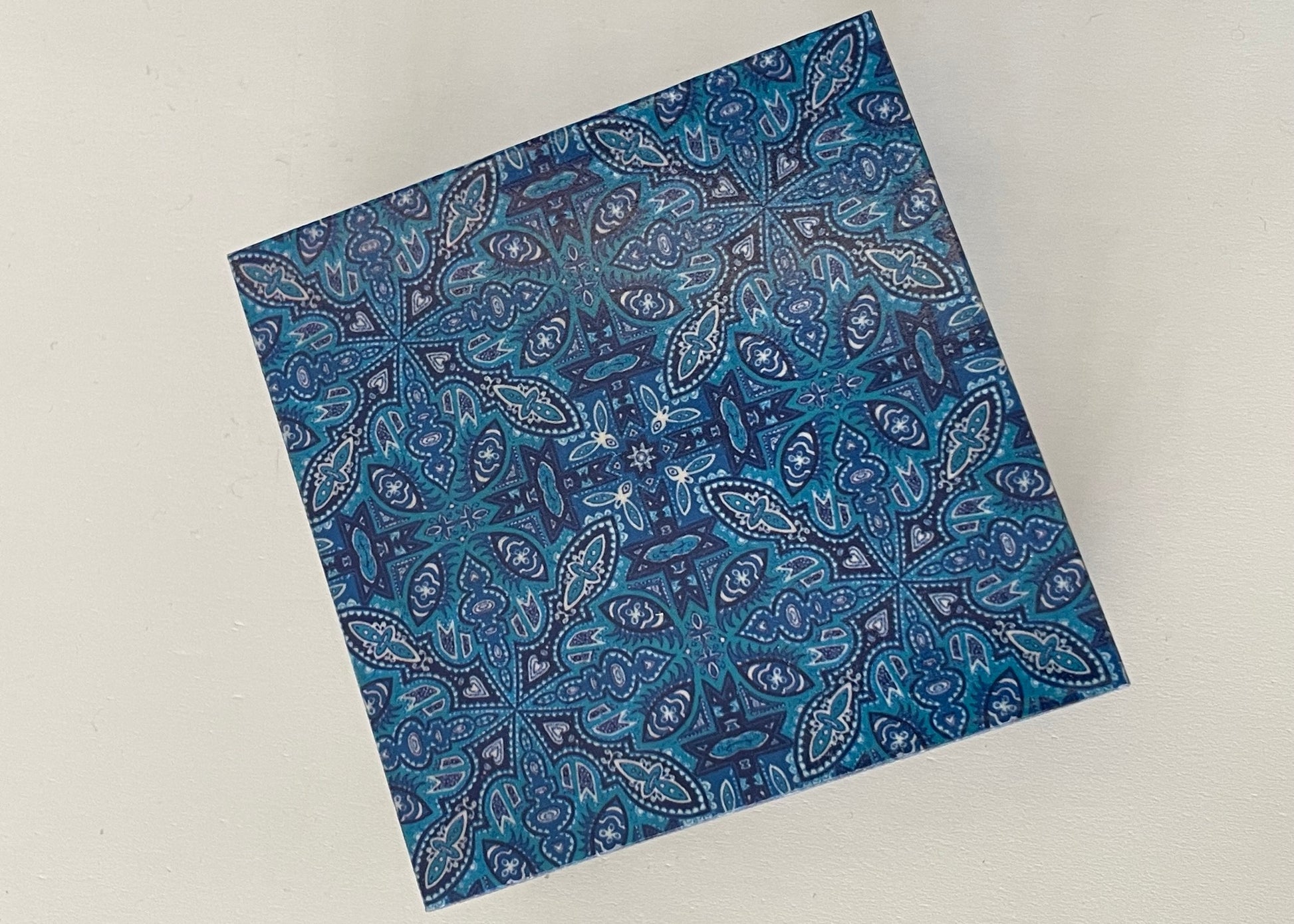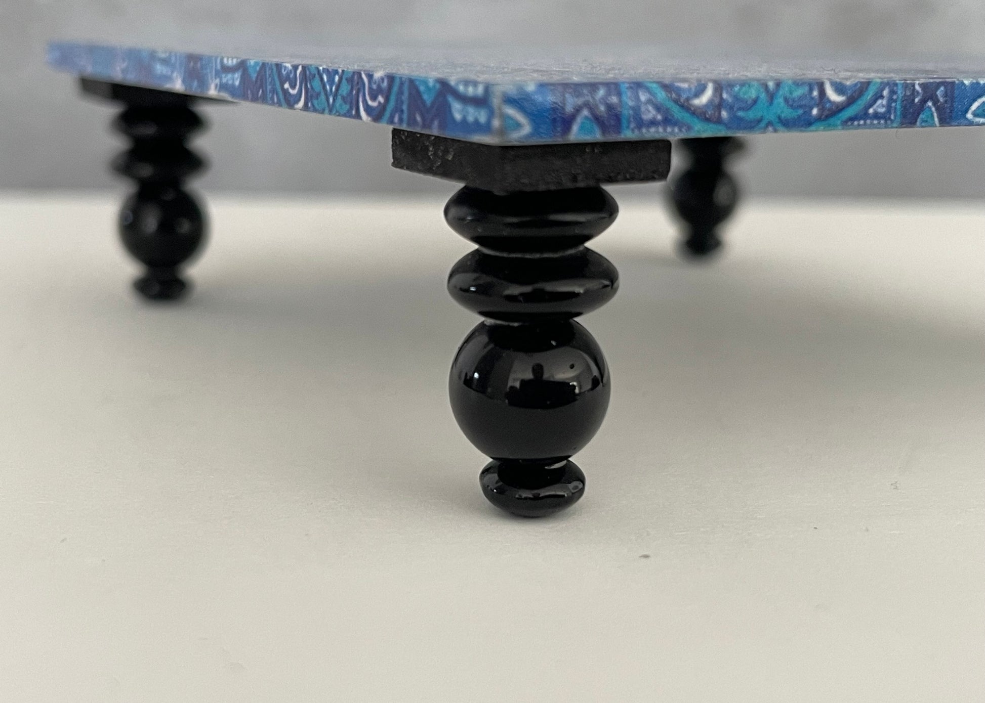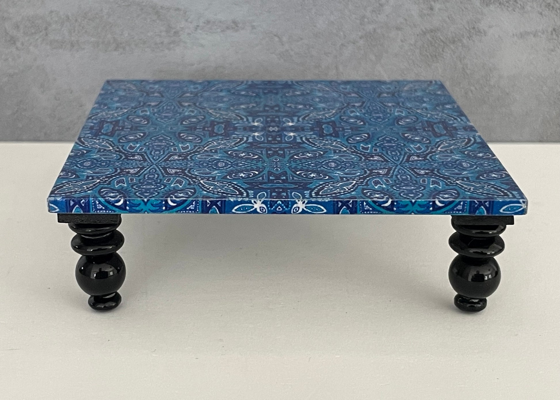 This square coffee table features a striking blue geometric-patterned top, beautifully paired with a sleek black lacquered spool leg. Perfect for adding a bold pop of color and contemporary style to your family room or living space.