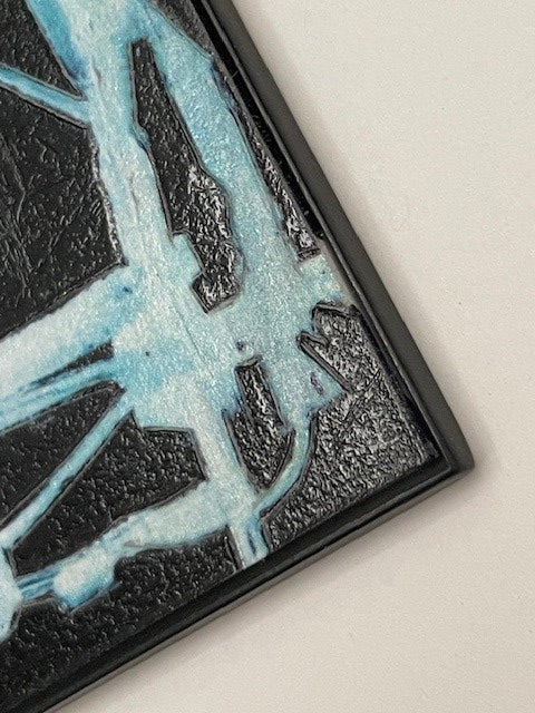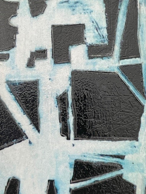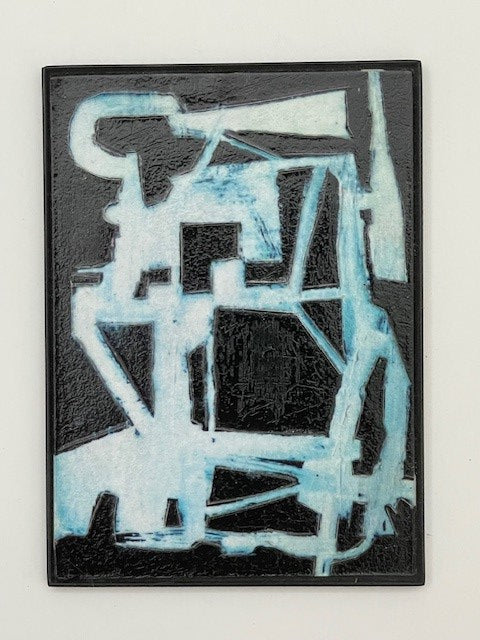 Blue, white and black abstract artwork with black frame. Can be hung horizontally or vertically.