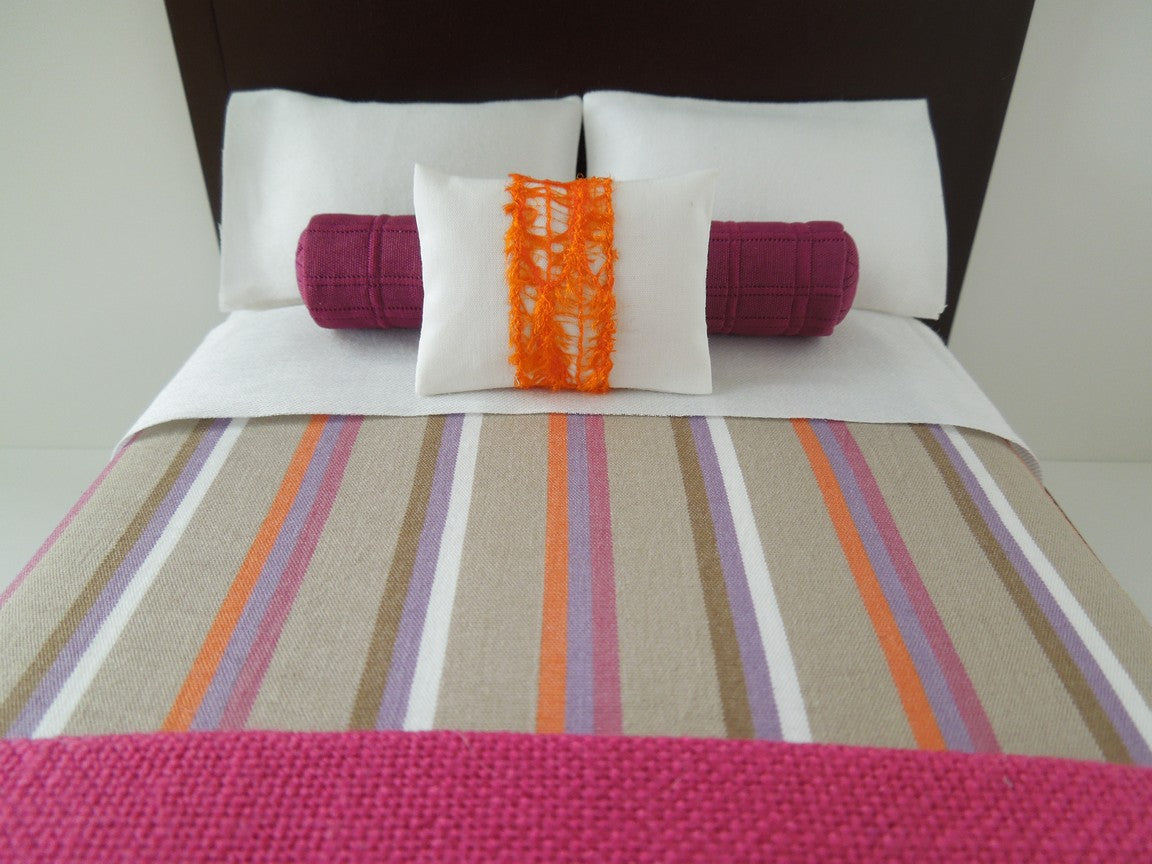 This Bon Bon Stripe duvet features beige, brown, white, lavender, orange, and pink stripes. The duvet pulls over the entire mattress and can either be folded down to expose one of our coordinating sheet sets or fully pulled up for a more finished look. Designed to fit our Essentials queen mattress.