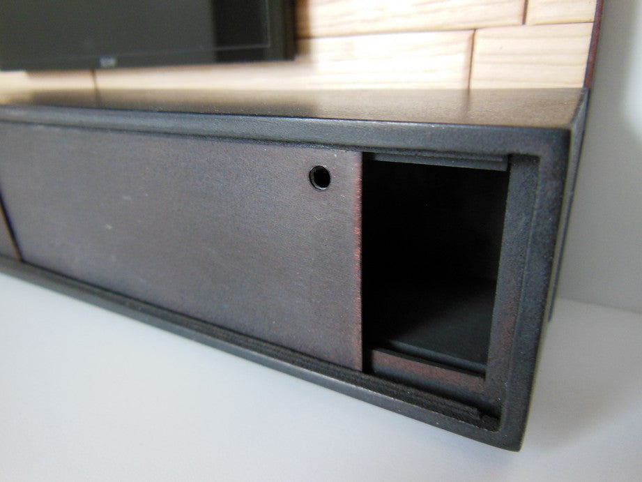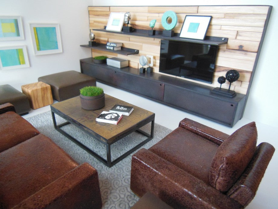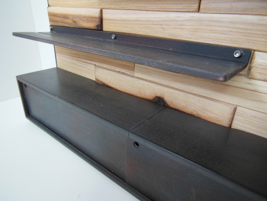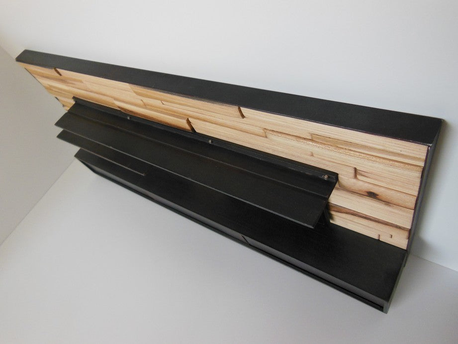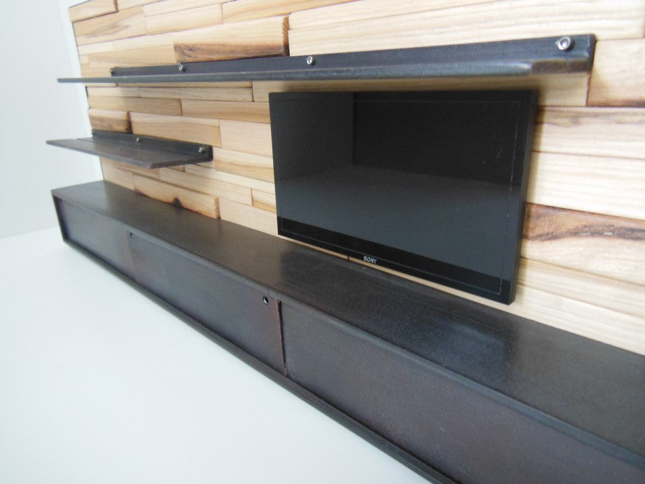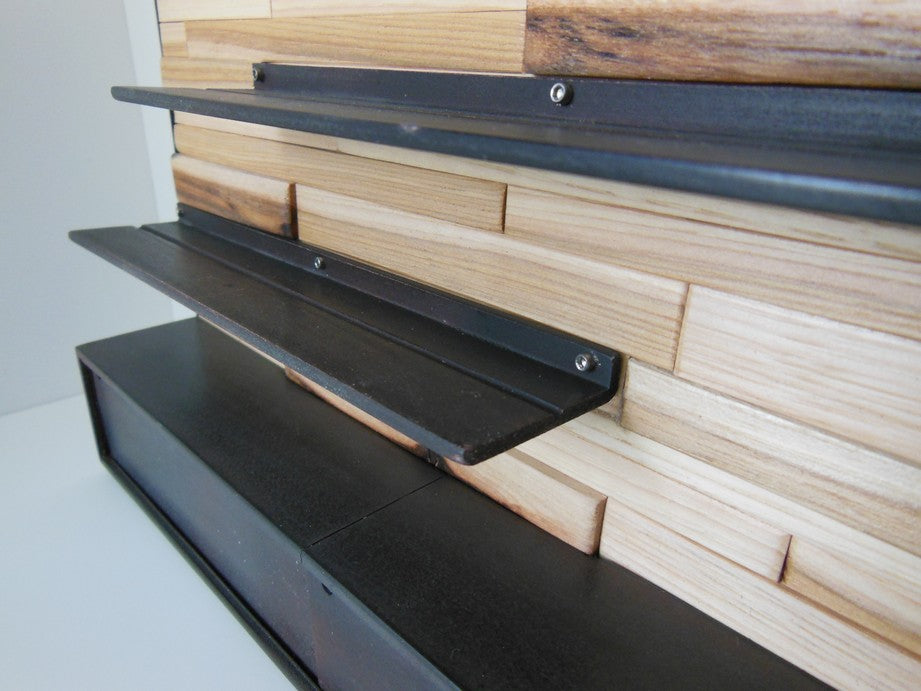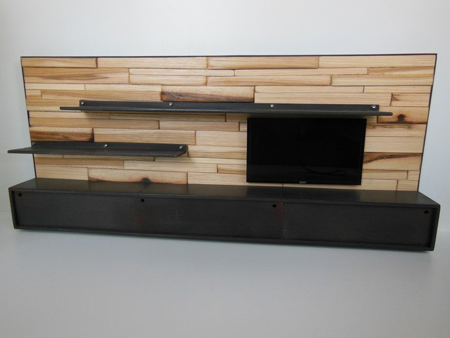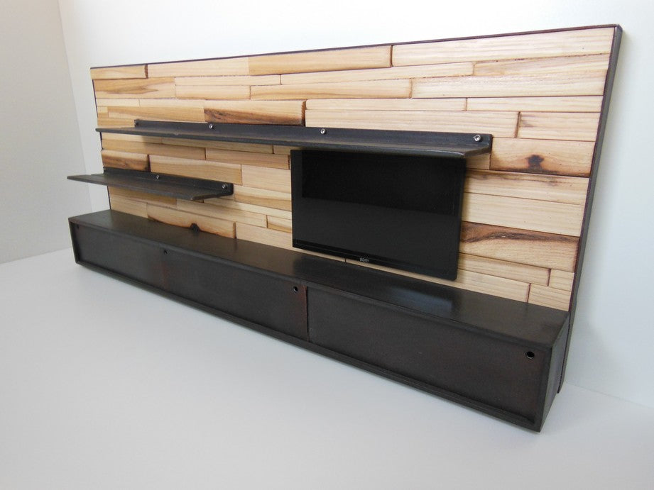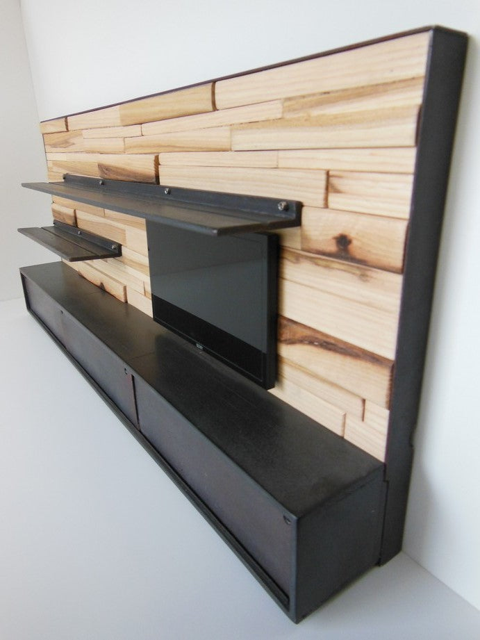 One of my favorites, the Brooklyn entertainment unit is inspired by the Industrial warehouses and loft spaces in the Art and Design district of Brooklyn, New York. With a cold rolled steel base and shelves, and a contoured plank wood back wall. An iPhone mount is available as an upgrade.