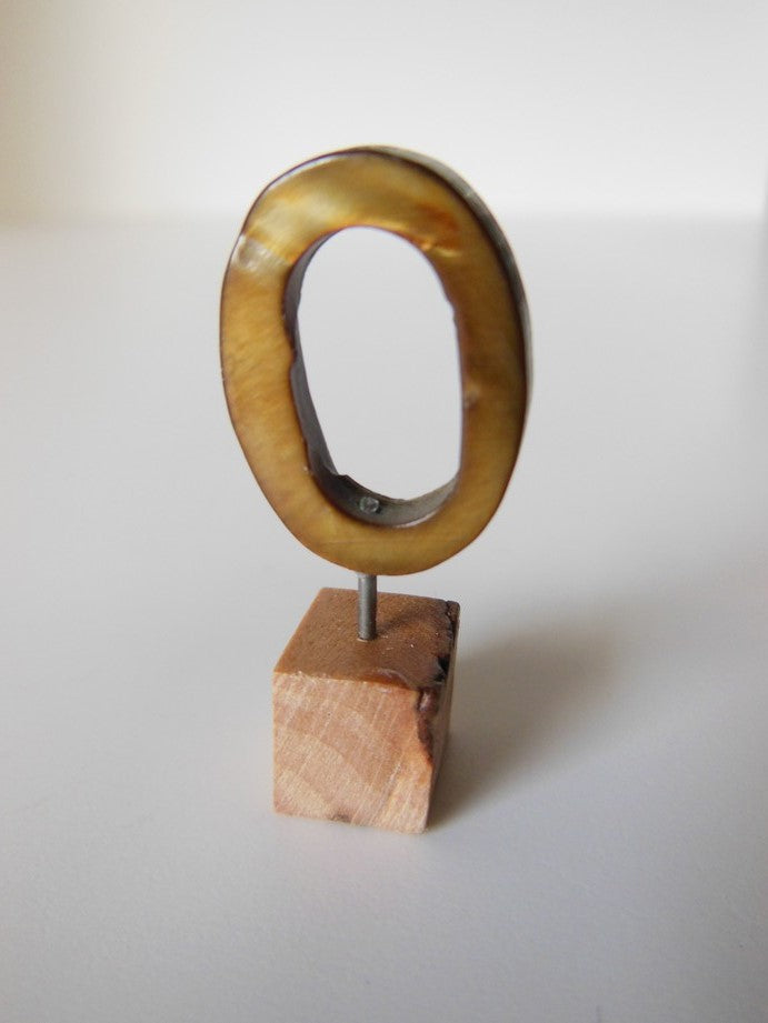Brown oblong ring is mounted on a natural wood base.