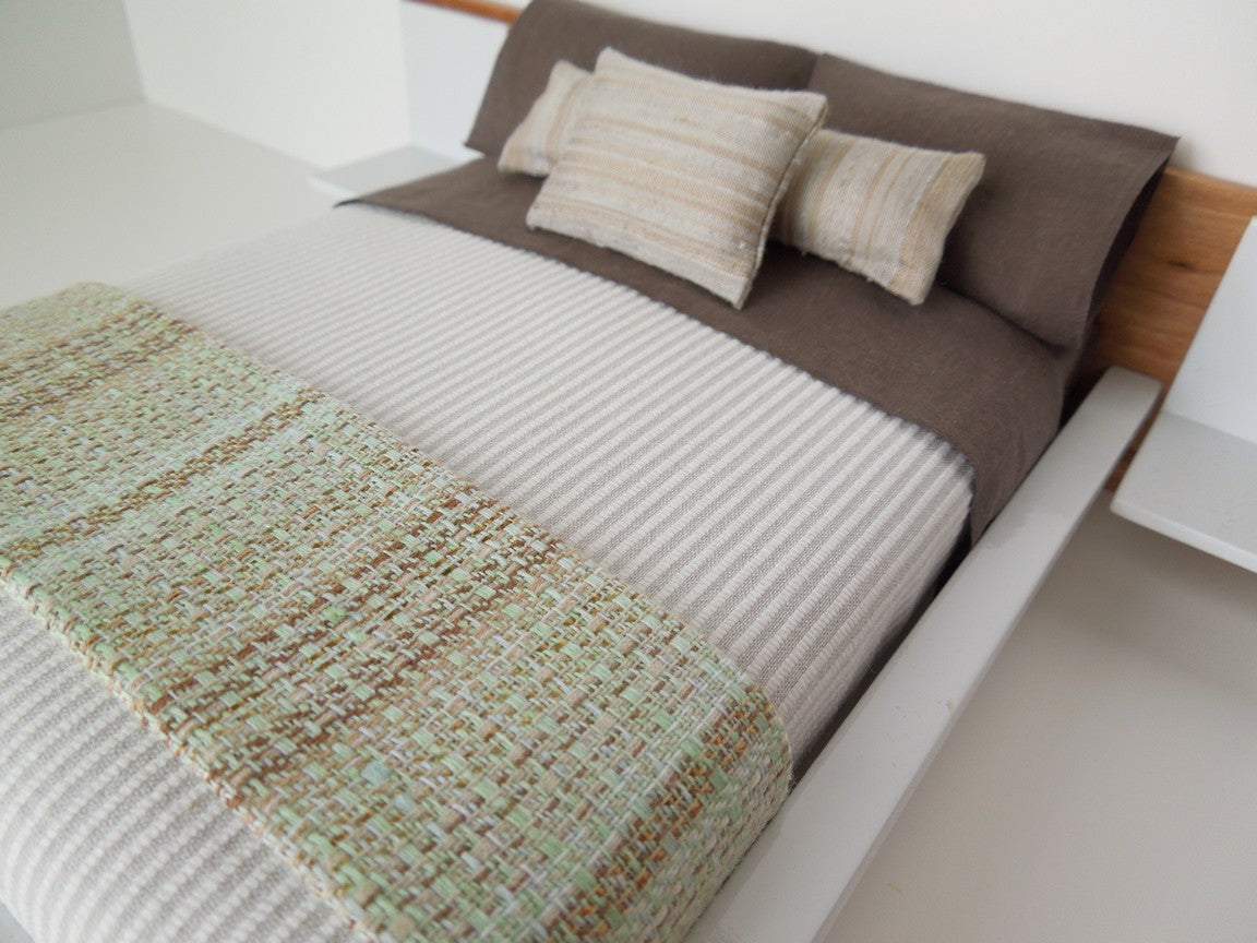 Our Cayman Collection includes our cream stripe duvet, brushed brown sheet set, one cafe stripe long oblong pillow, one cafe stripe medium rectangle pillow, and green/gold throw. Mattress, standard pillows and bed frame sold separately.