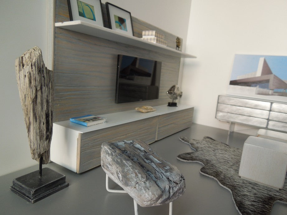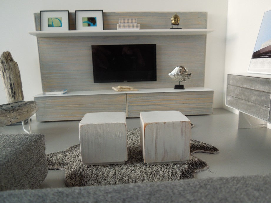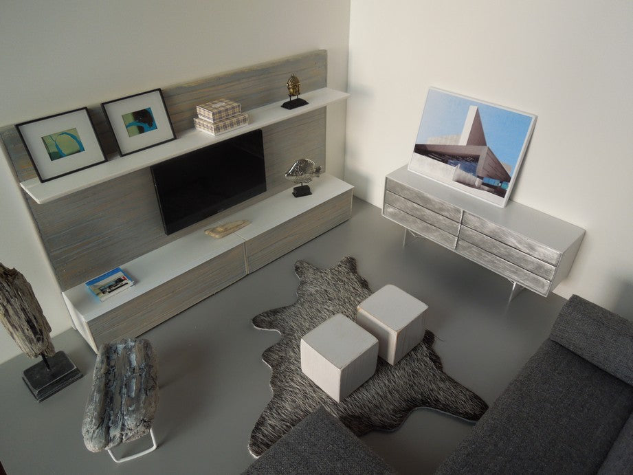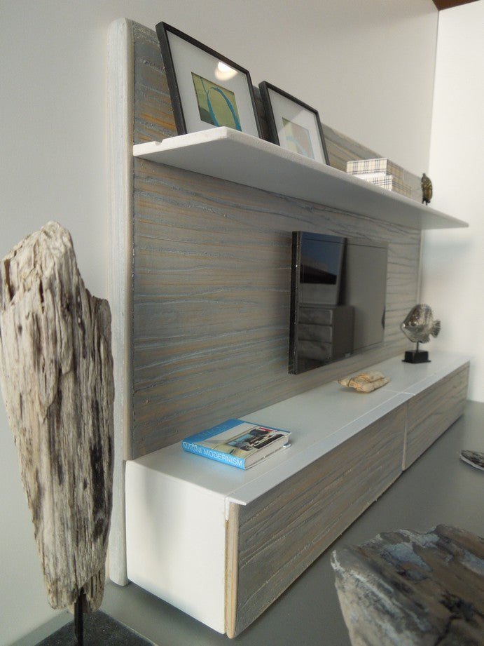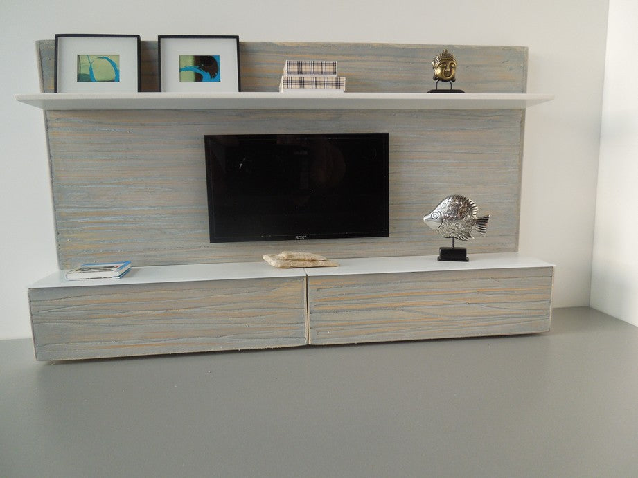 The Chelsea entertainment unit is constructed of gray washed wood cabinetry and back wall accented by a white shelf on top to display accessories (NOTE: cabinets do not open and accessories shown are not included).The Chelsea unit has an insert in the back of the unit to place an iPhone to play live video. Once the iPhone is in place it looks just like an actual TV! Custom lengths/widths/heights are available, be sure to measure the space before ordering to ensure the custom unit will fit properly.