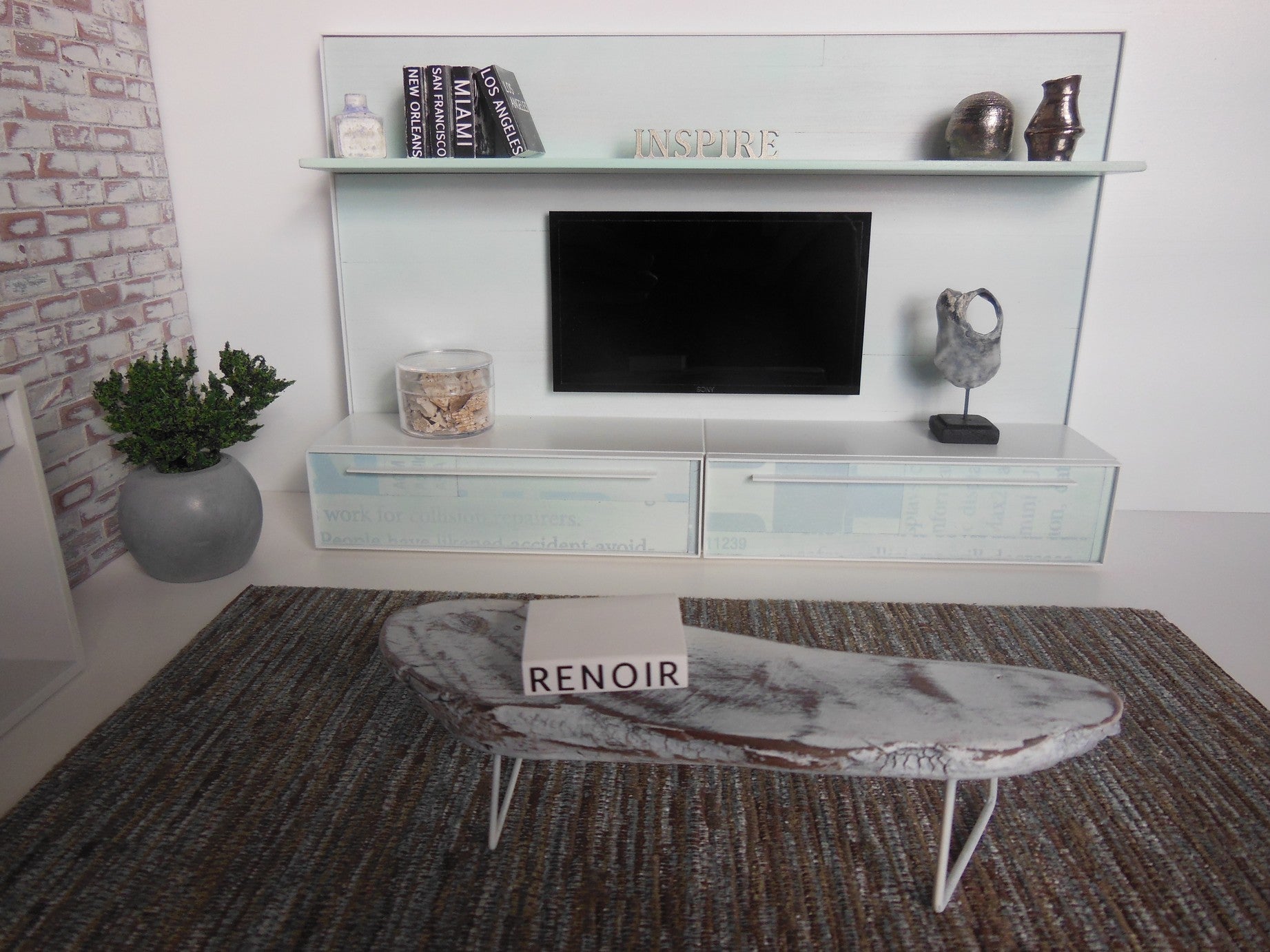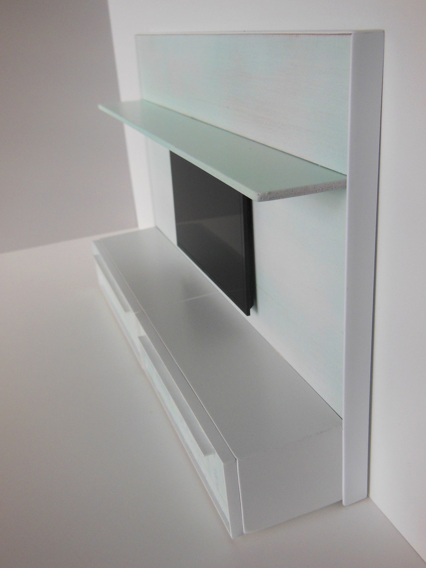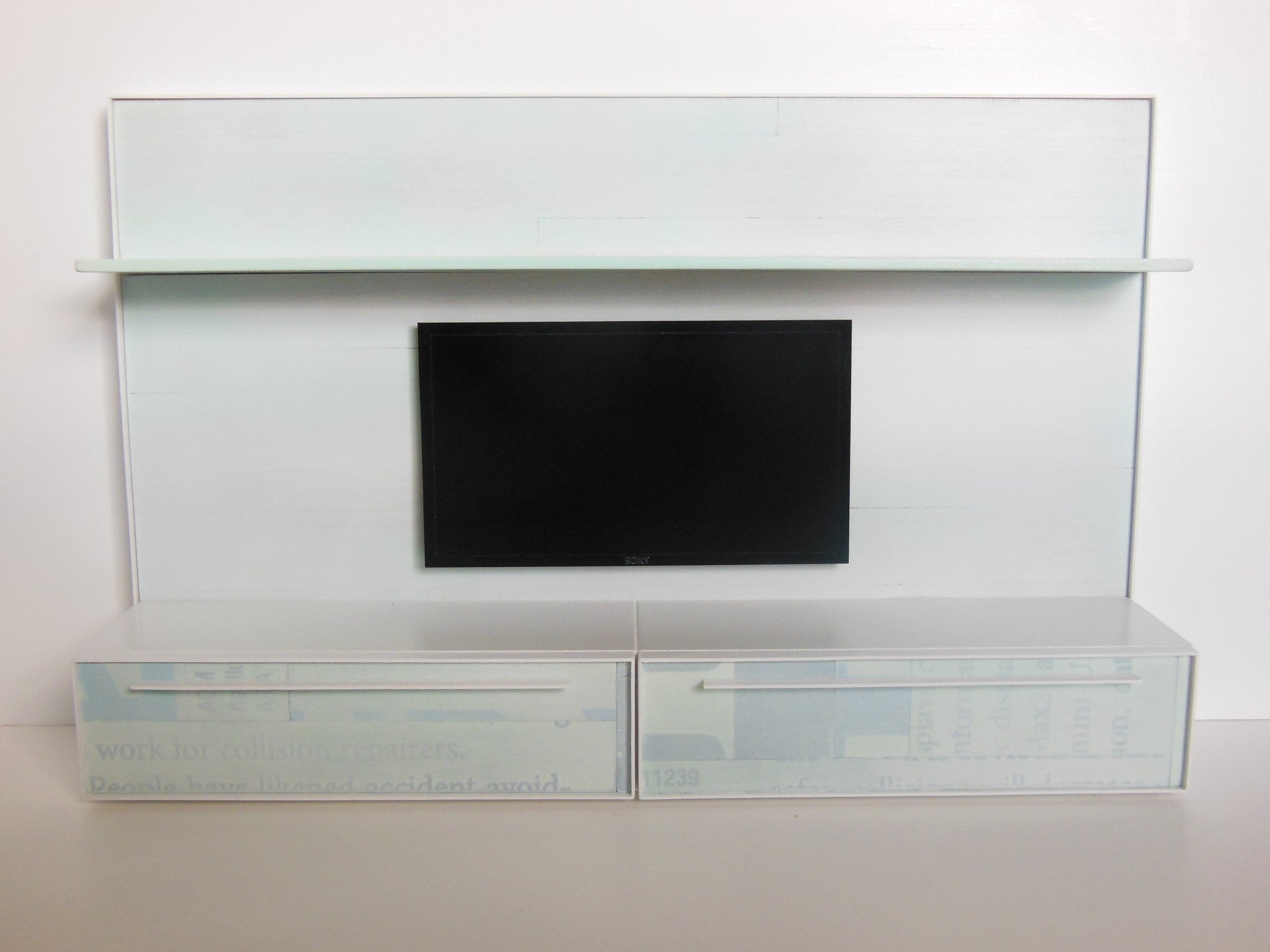 The Chelsea entertainment unit is constructed of aqua blue white washed wood/plastic cabinetry and back wall accented by a shelf on top to display accessories (NOTE: cabinets do not open and accessories shown are not included). The Chelsea unit has an insert in the back of the unit to place an iPhone to play live video. Once the iPhone is in place it looks just like an actual TV! Custom lengths/widths/heights are available, be sure to measure the space before ordering to ensure the custom unit will fit properly.