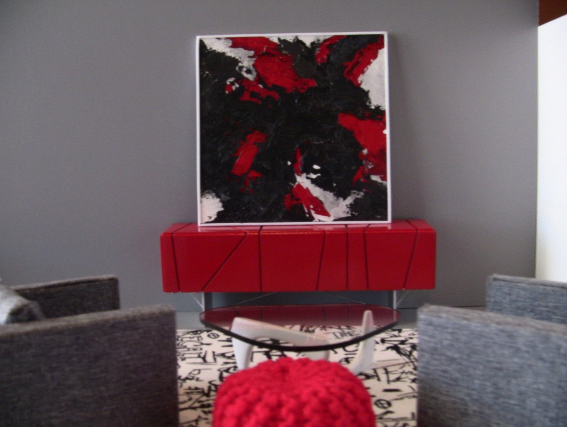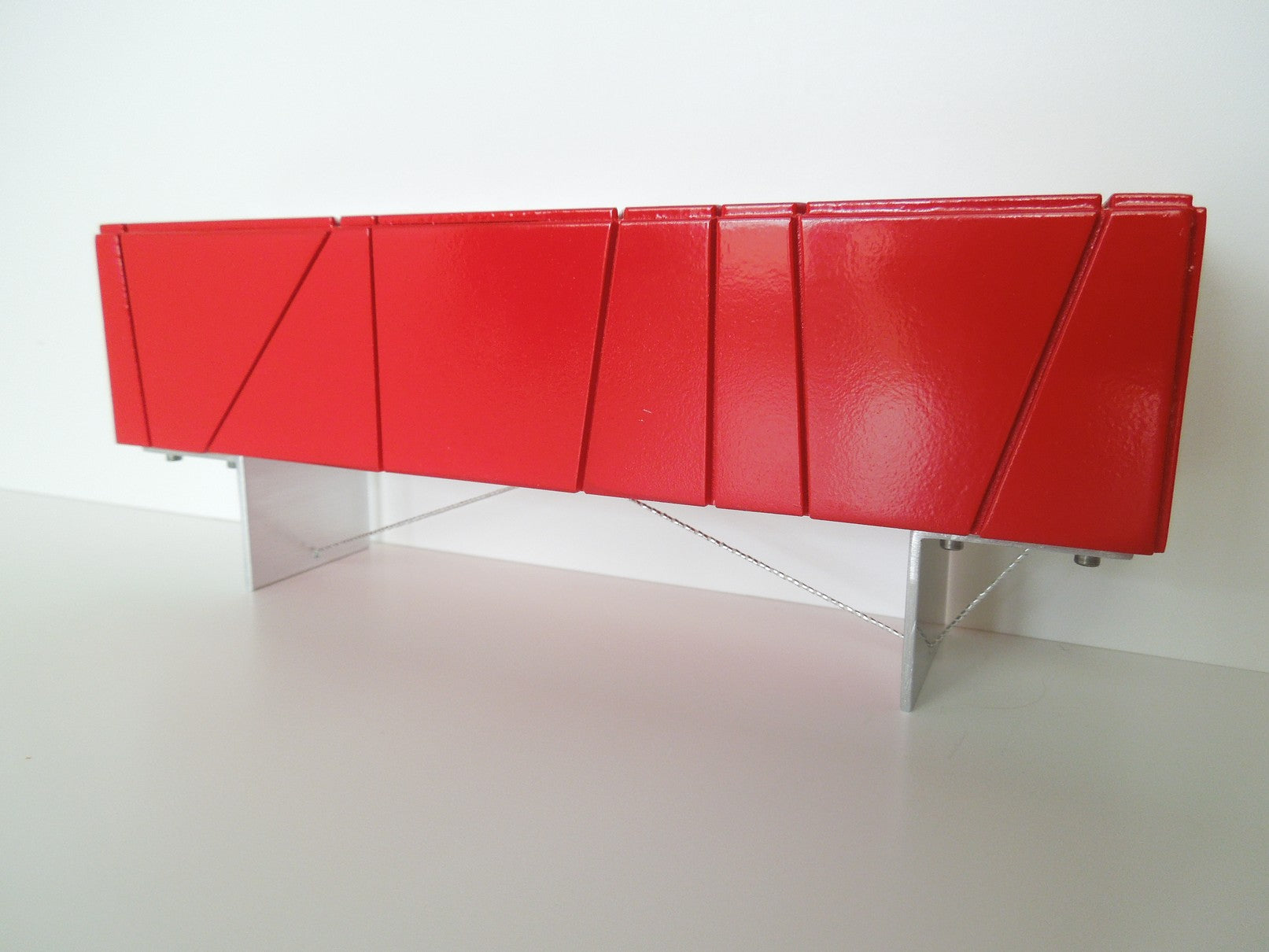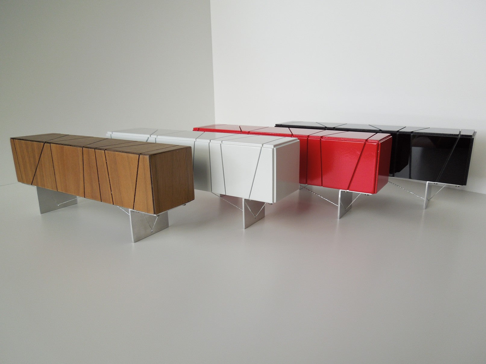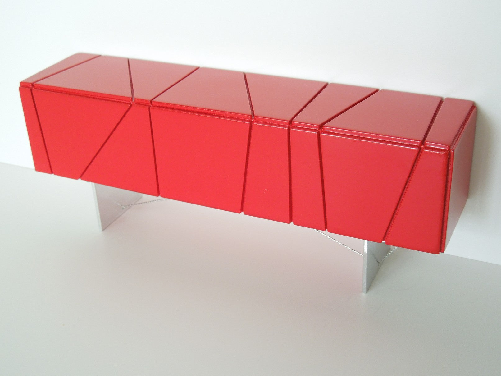 The Cole Entertainment Console combines an industrial look with elegance. The bold red finish on the cabinet accents the artistic panels. The base is constructed of metal with suspended wire detail. The console can be used as a TV stand, buffet or storage display. (NOTE: the cabinet panel doors do not open) Available in red, white, black and walnut.