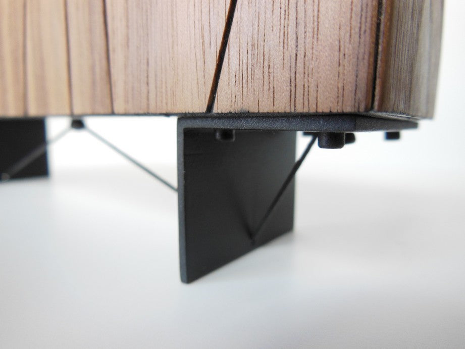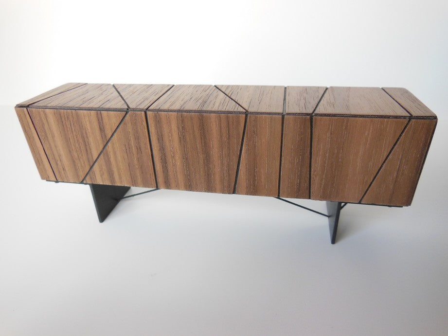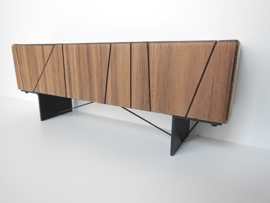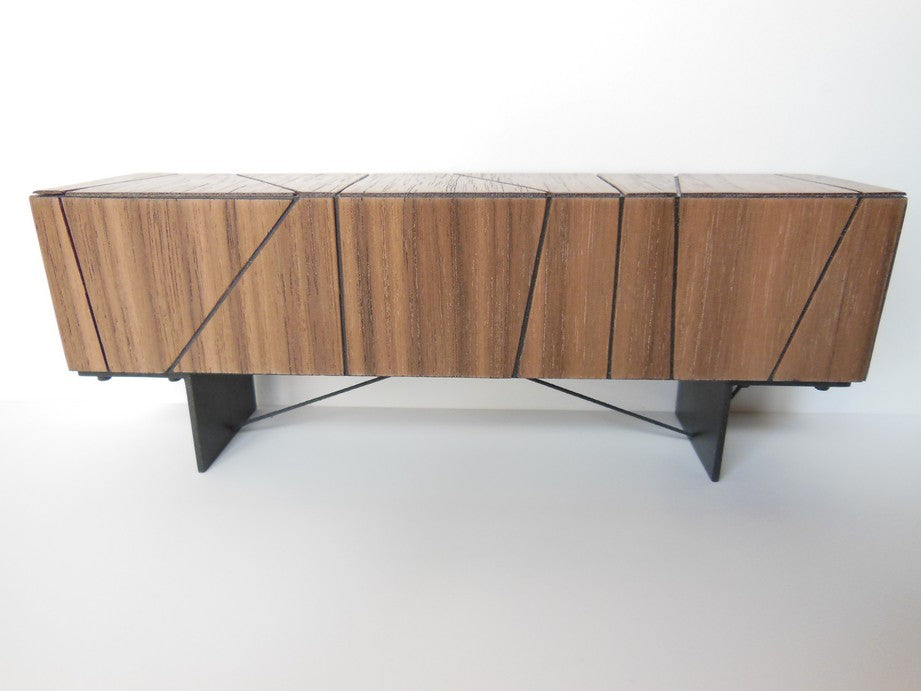 The Cole Entertainment Console combines an industrial look with elegance. The walnut finish on the cabinet accents the artistic panels. The base is constructed of black metal with suspended wire detail. The console can be used as a TV stand, buffet or storage display. (NOTE: the cabinet panel doors do not open) Also available in red, white, black, light blueand cherry with metal or black bases.