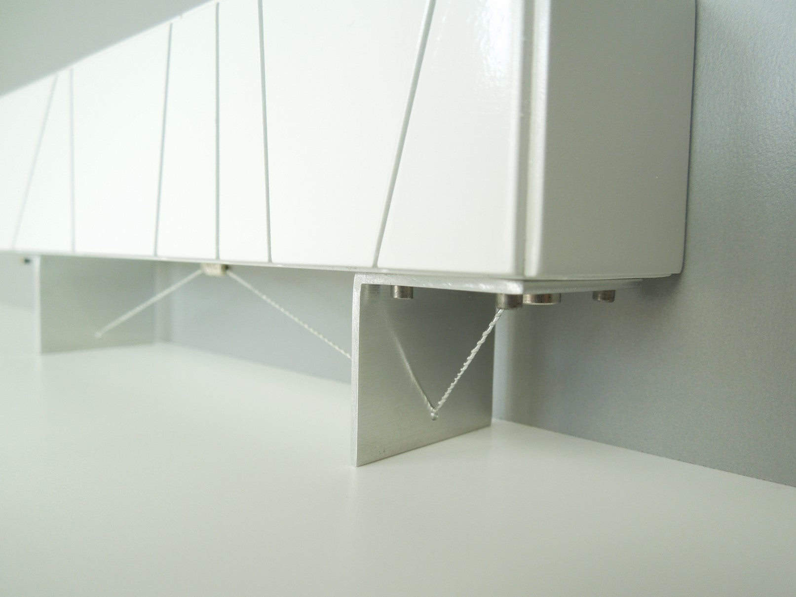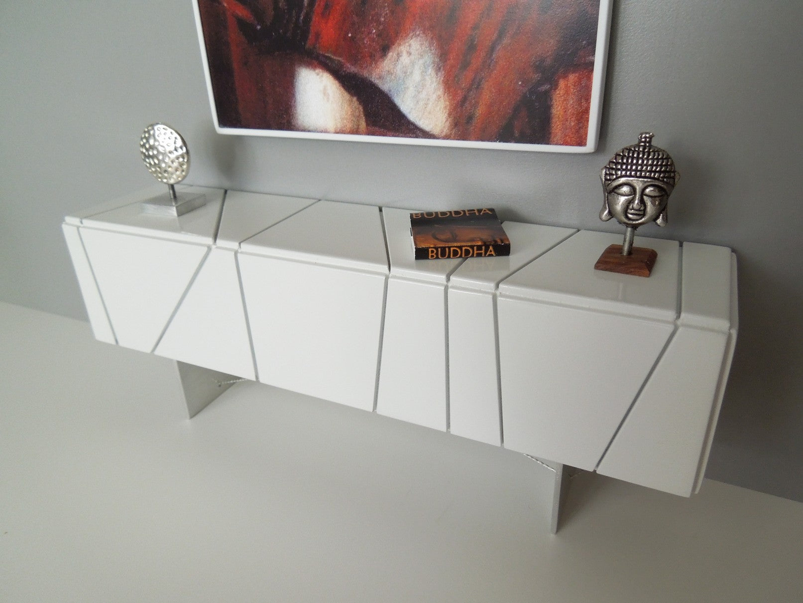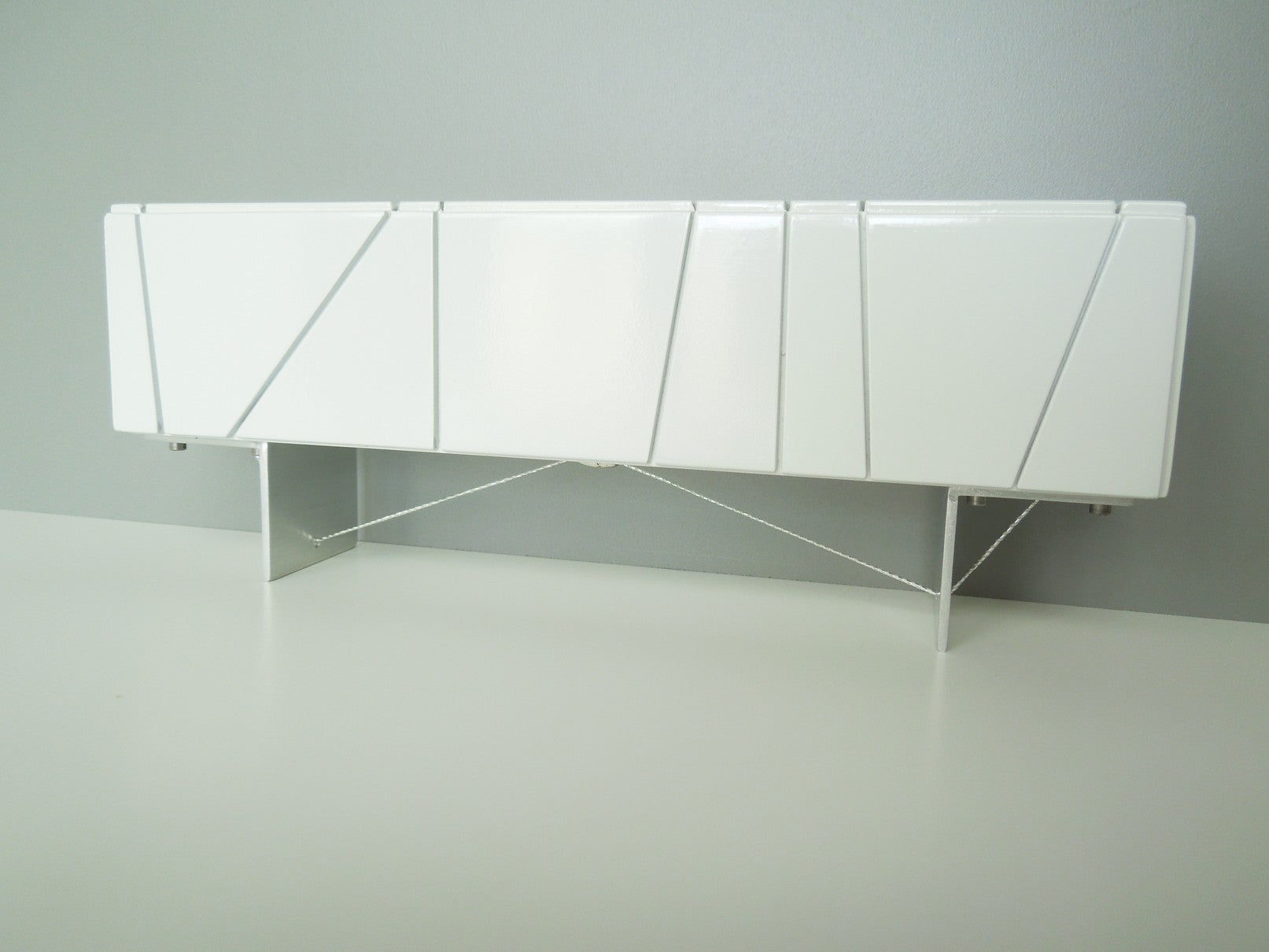 The Cole Entertainment Console combines an industrial look with elegance. The bright white finish on the cabinet accents the artistic panels. The base is constructed of metal with suspended wire detail. The console can be used as a TV stand, buffet or storage display. (NOTE: the cabinet panel doors do not open) Available in red, white, black and walnut.