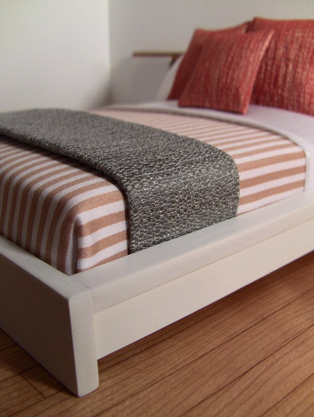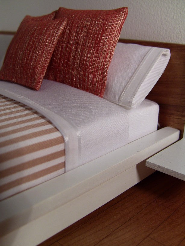 Our Coral Collection features shades of the Mediterranean and includes a caramel and white stripe duvet cover with white sheet set featuring wide white satin edge, 2 medium and 1 small mandarin metallic square pillows and platinum throw. Mattress, standard pillows and bed frame sold separately.