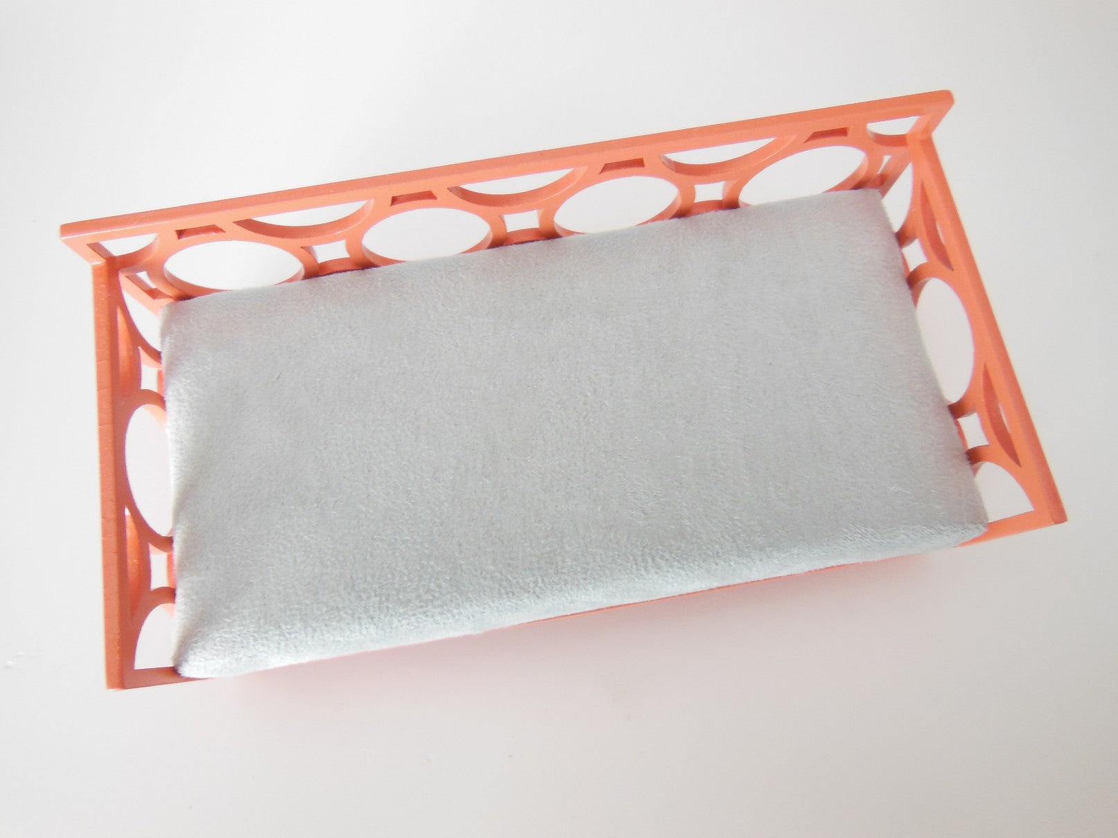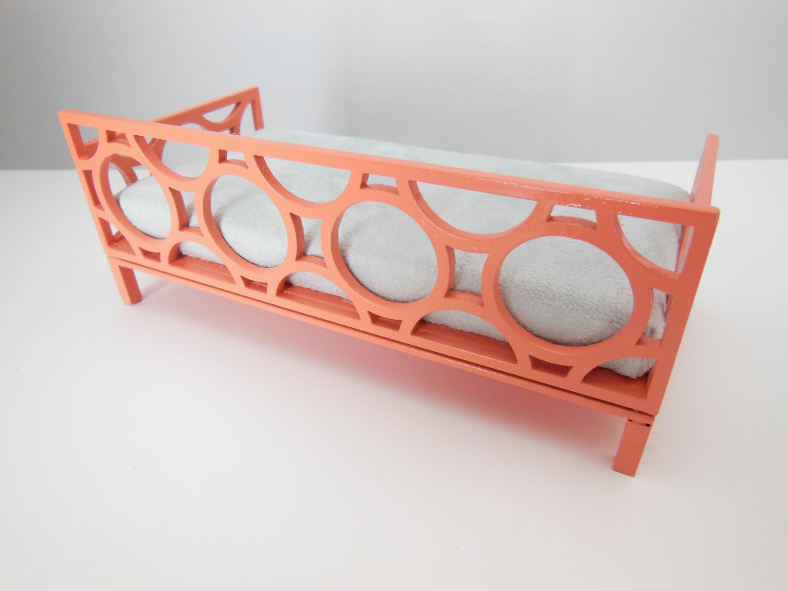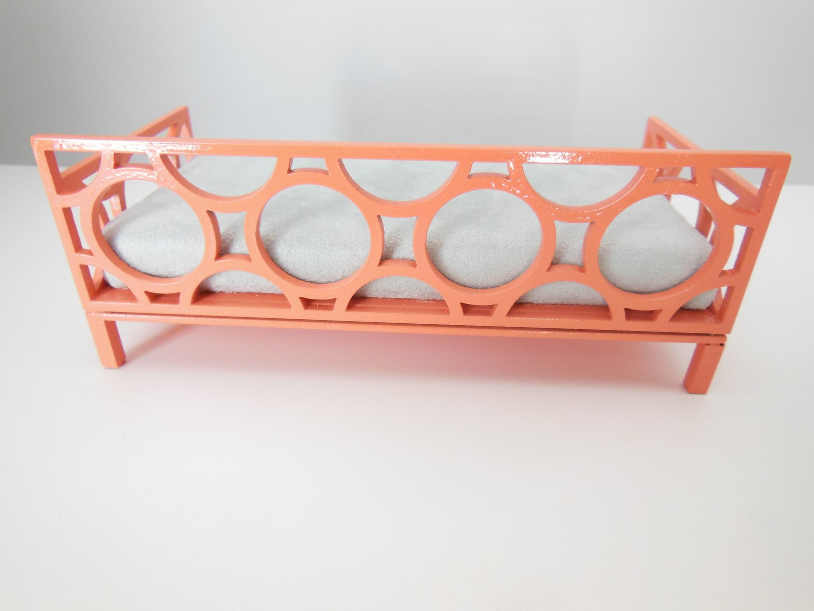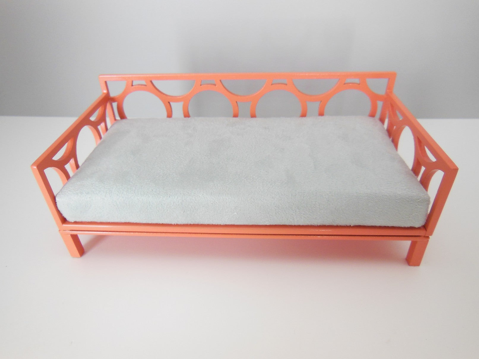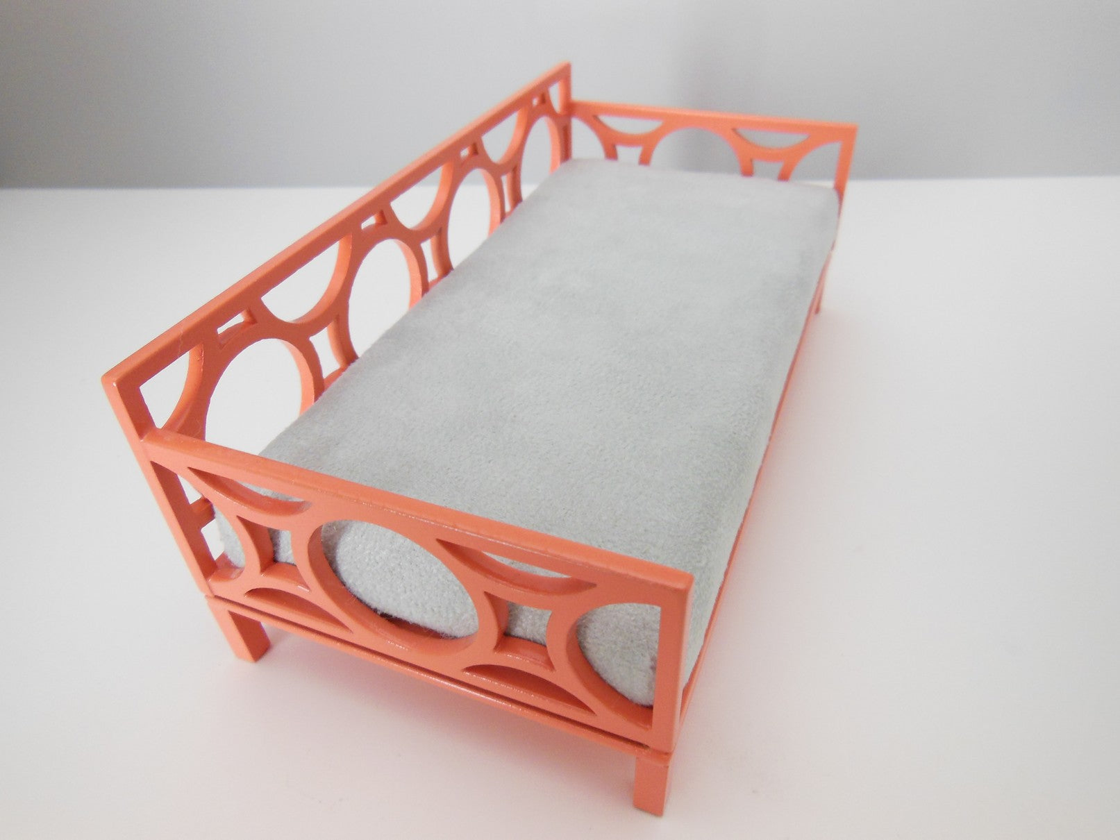The Cortez Daybed is constructed of a coral frame with a circle design. The mattress is covered in a light gray micro suede. Accent pillows are not included but can be purchased separately (see our Bedding, Pillows for options - we recommend Medium Square size).