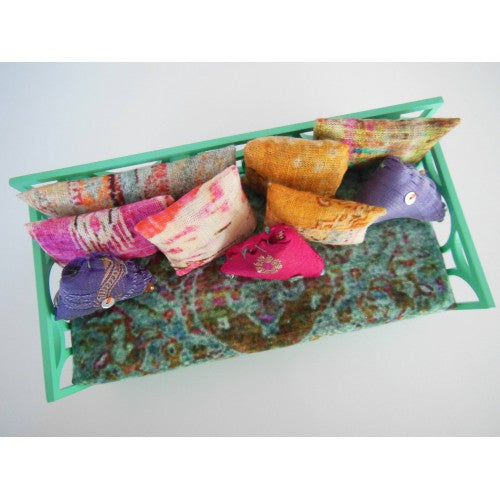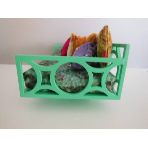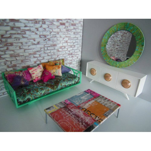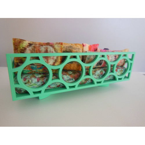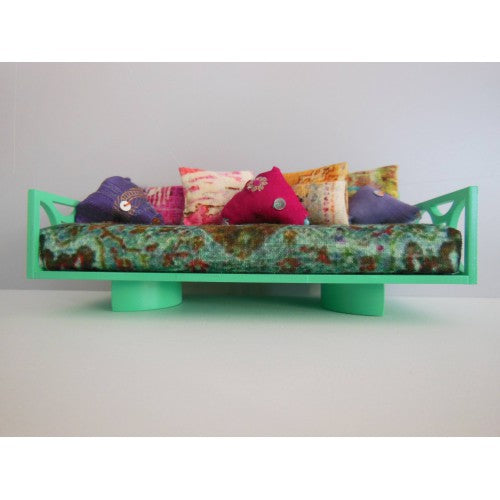The Cortez Daybed is constructed of a teal frame with a circle design. The mattress is covered in a vibrant green print fabric with coordinating multi-colored accent pillows.