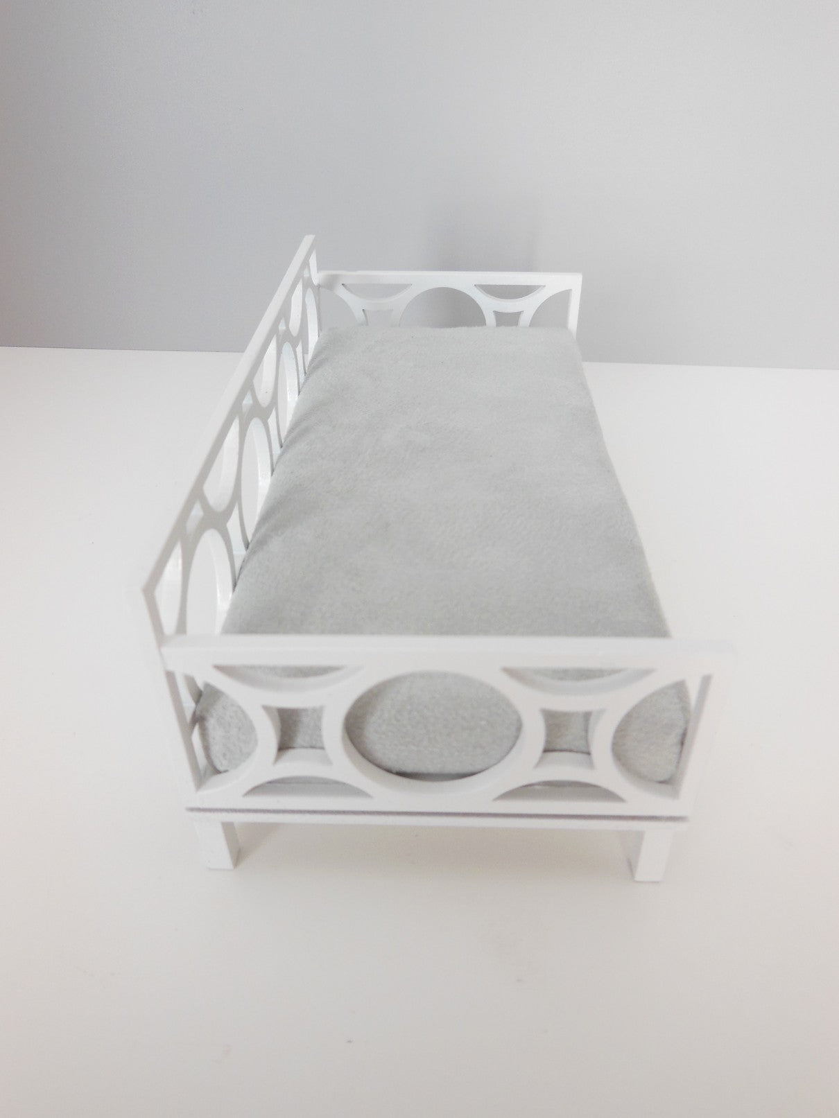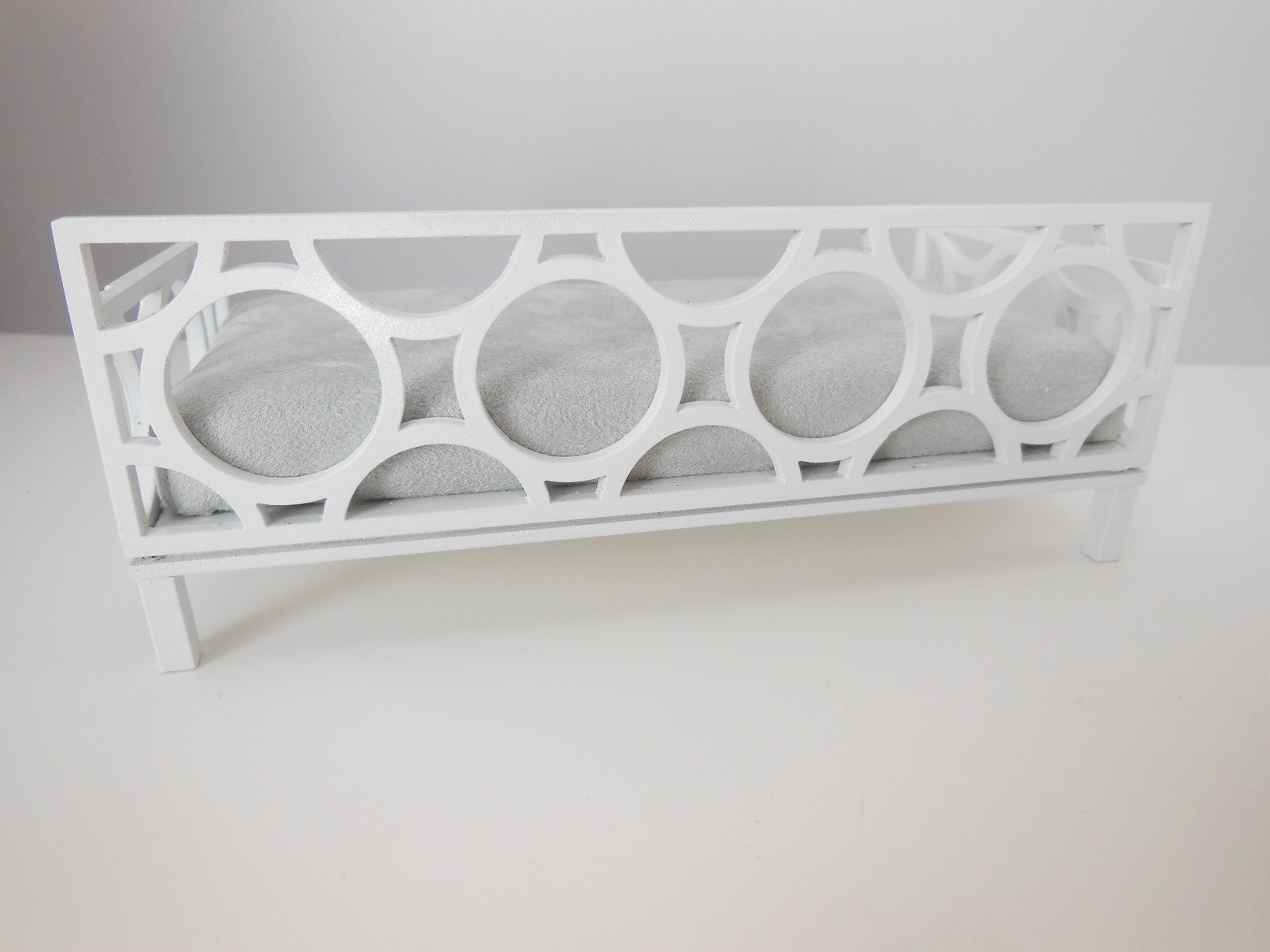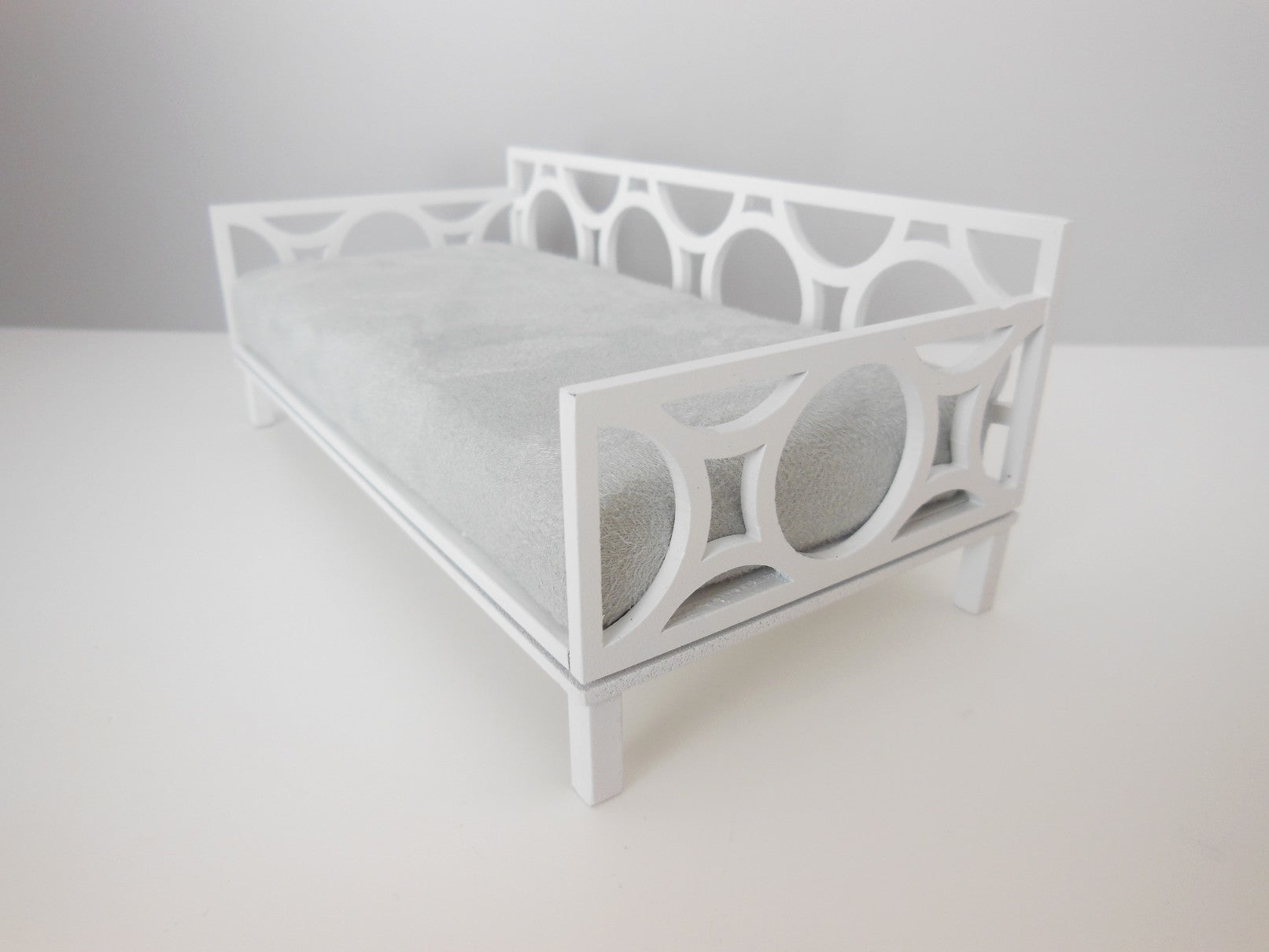 The Cortez Daybed is constructed of a white frame with a circle design. The mattress is covered in a light gray micro suede. Accent pillows are not included but can be purchased separately (see our Bedding, Pillows for options - we recommend Medium Square size).