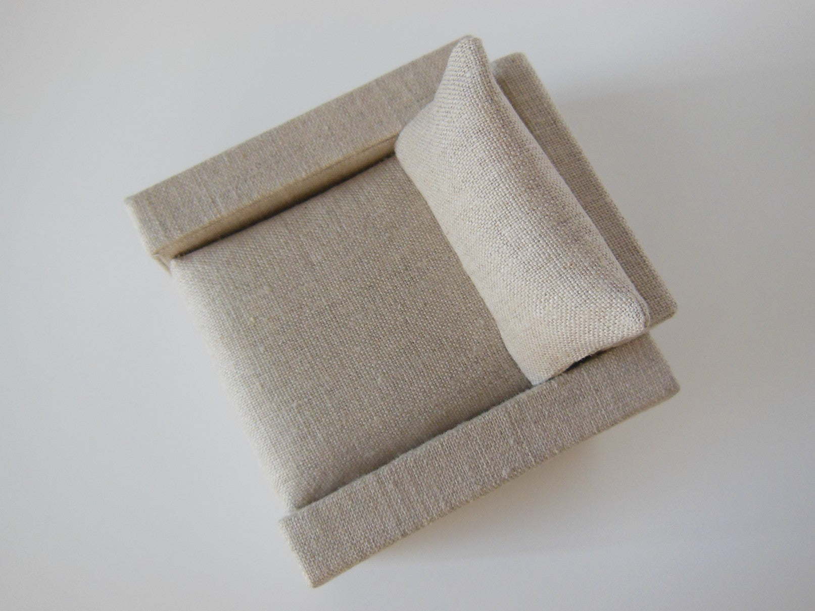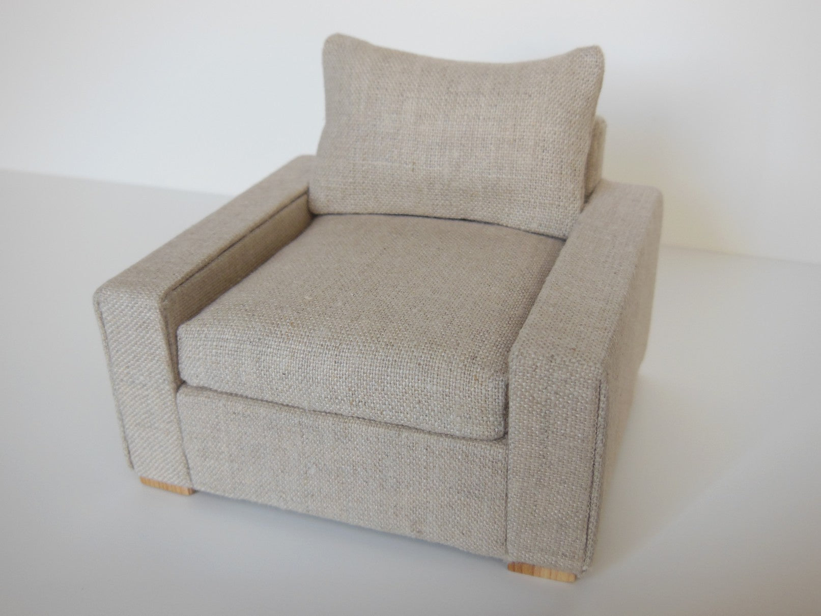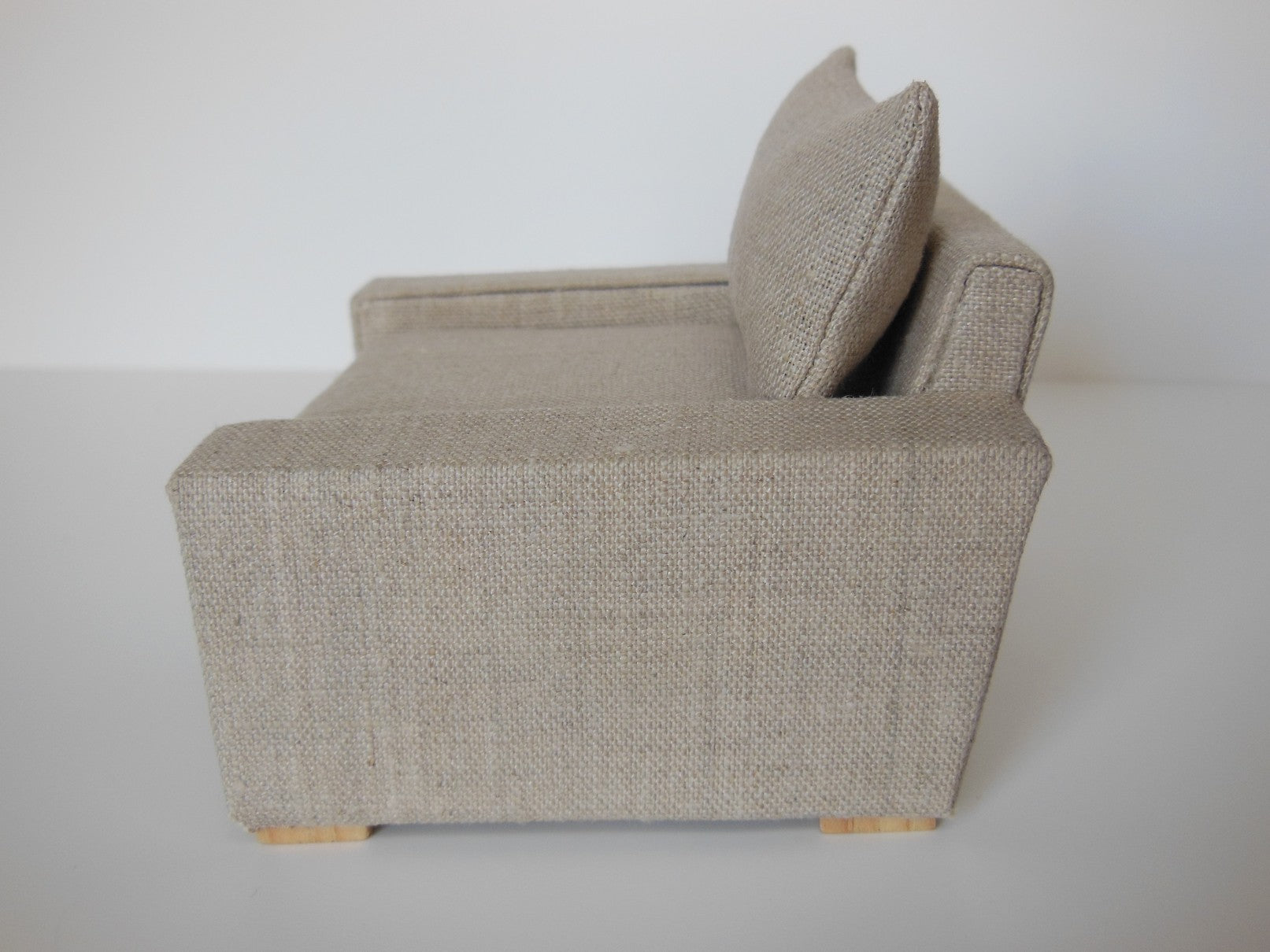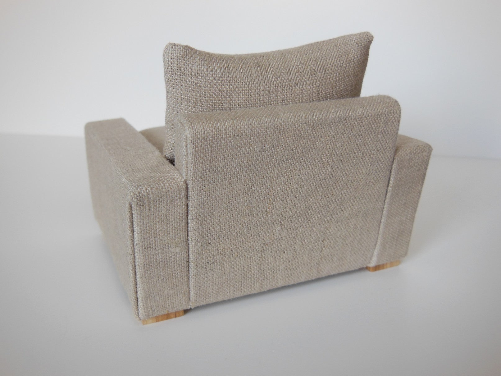 The Davis Chair is a modern classic style with an angled back. Covered in a linen wheat colored fabric with light wood block feet. Includes single back pillow in matching fabric.