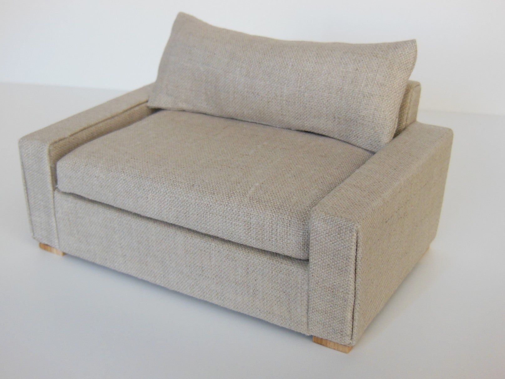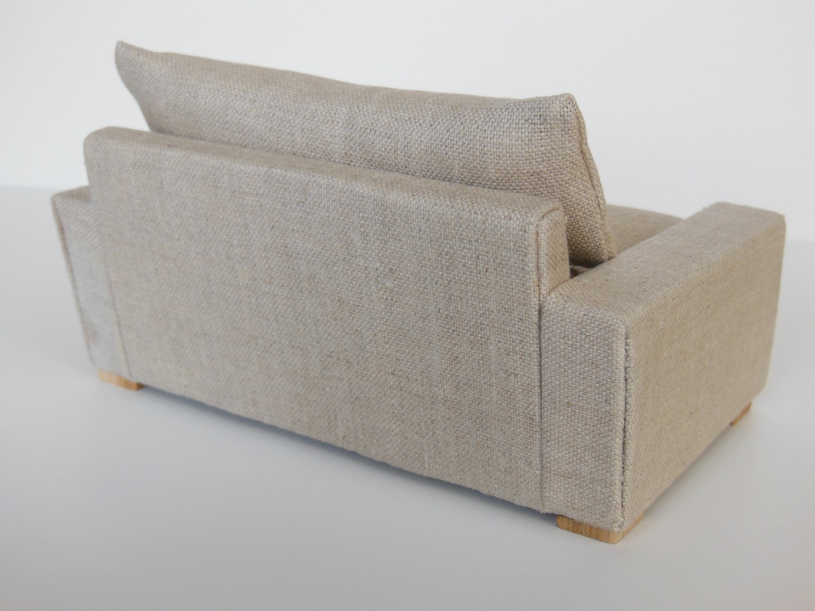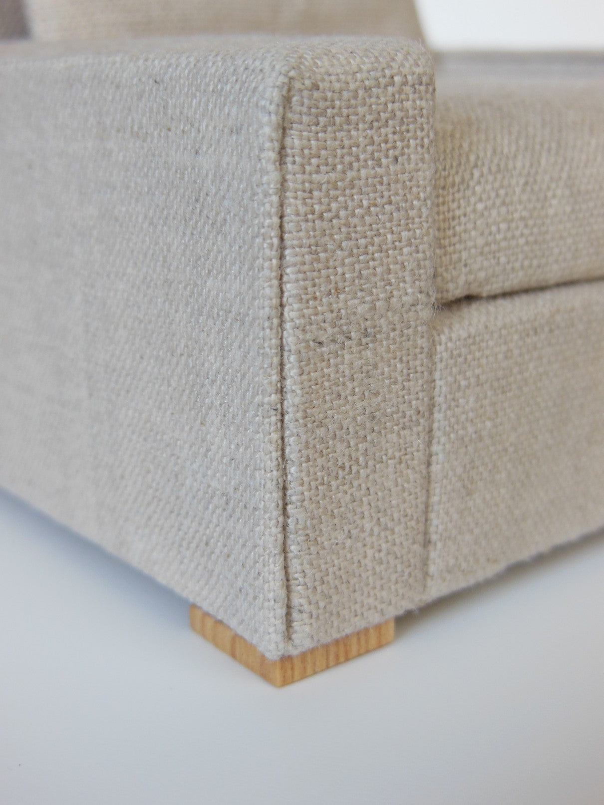 The Davis Loveseat is a modern classic style with a angled back. Covered in a linen wheat colored fabric with light wood block feet. Includes single back pillow in matching fabric.