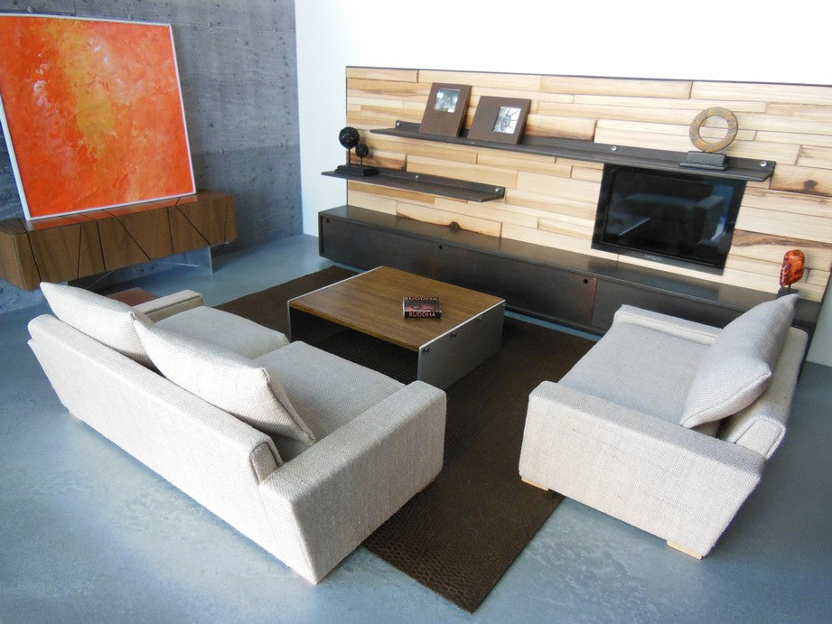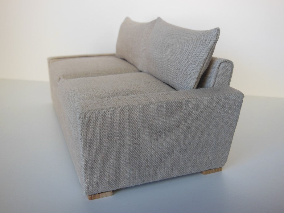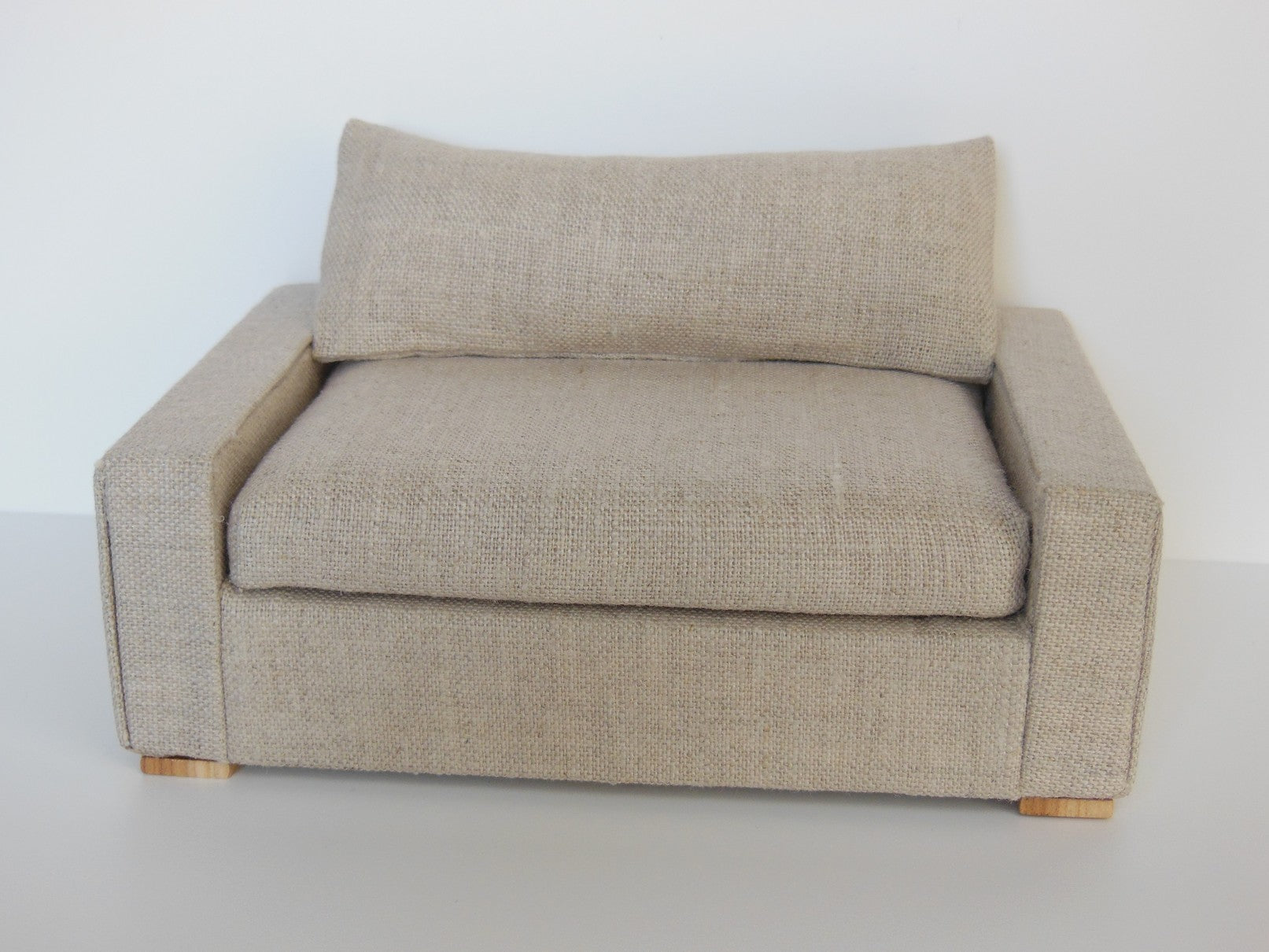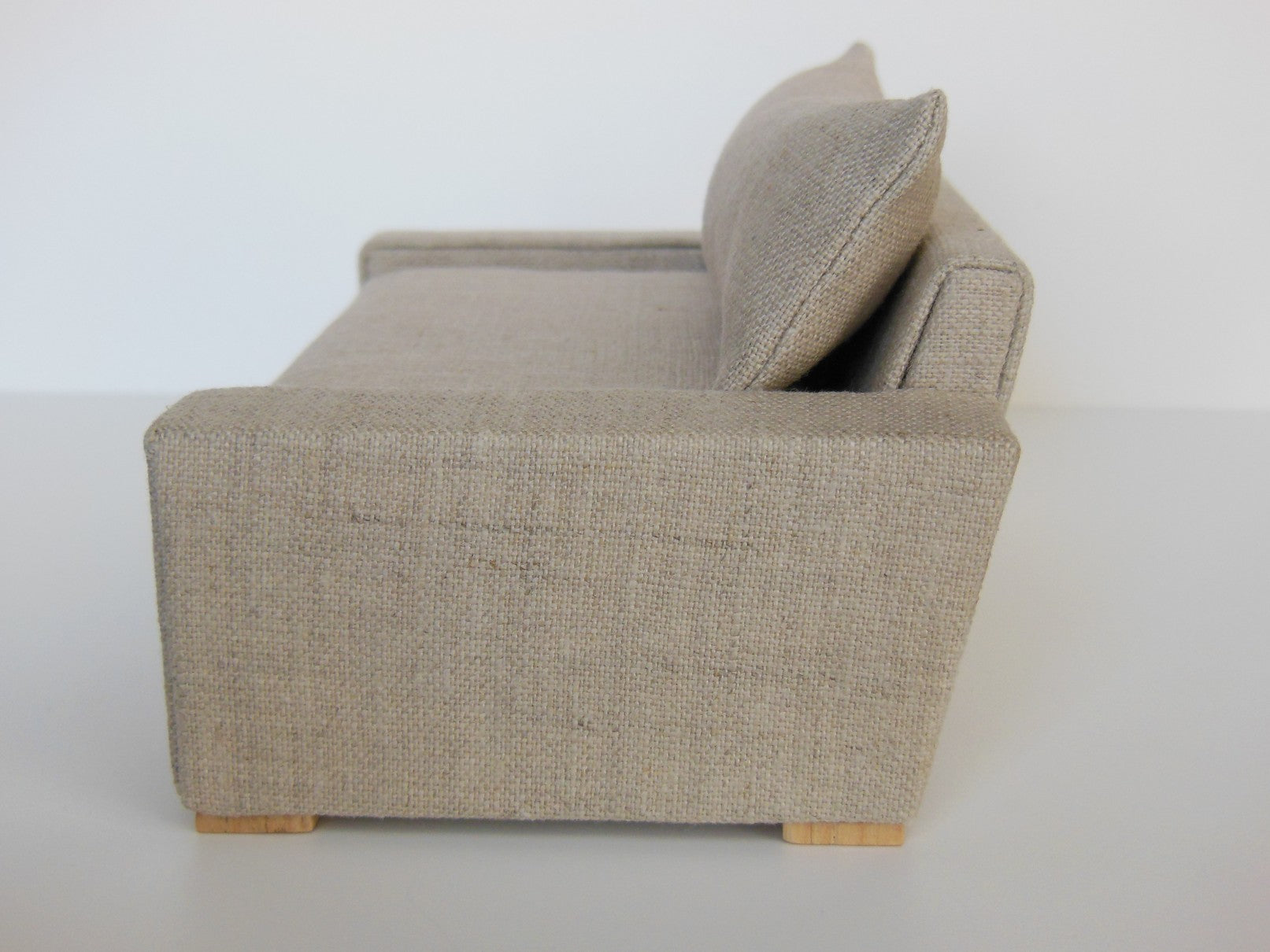 The Davis Loveseat is a modern classic style with a angled back. Covered in a linen wheat colored fabric with light wood block feet. Includes single back pillow in matching fabric.