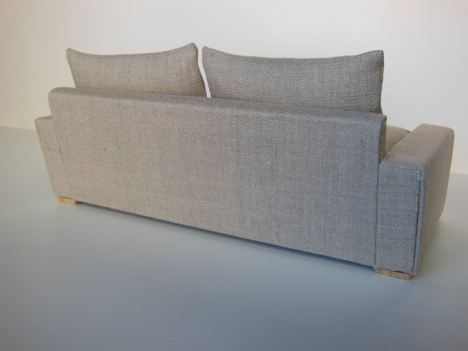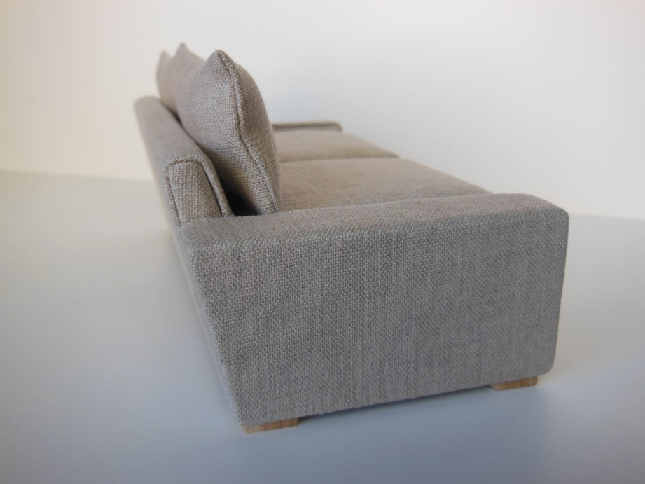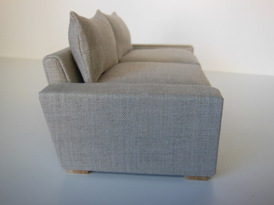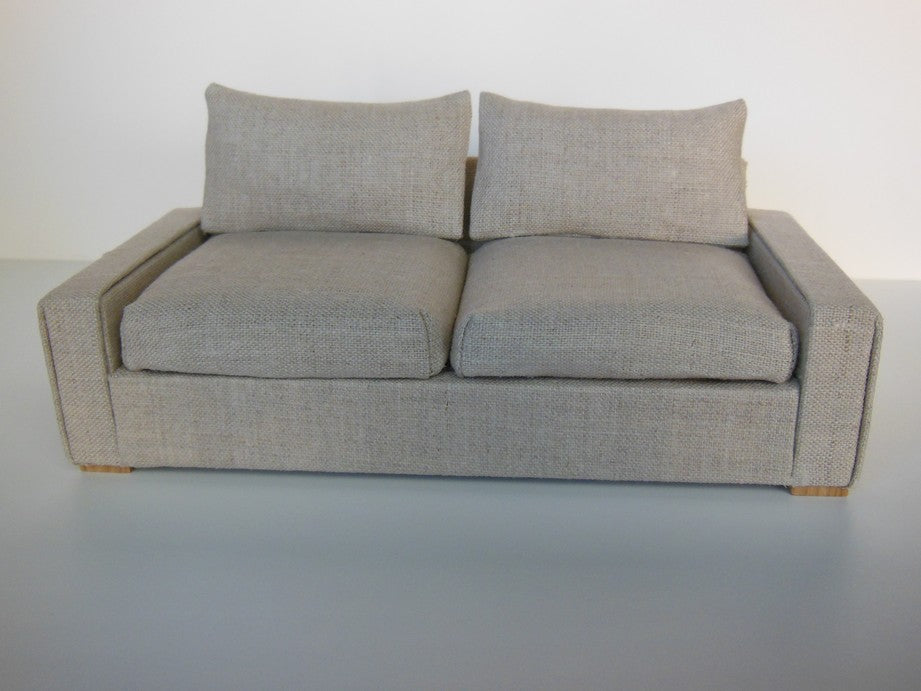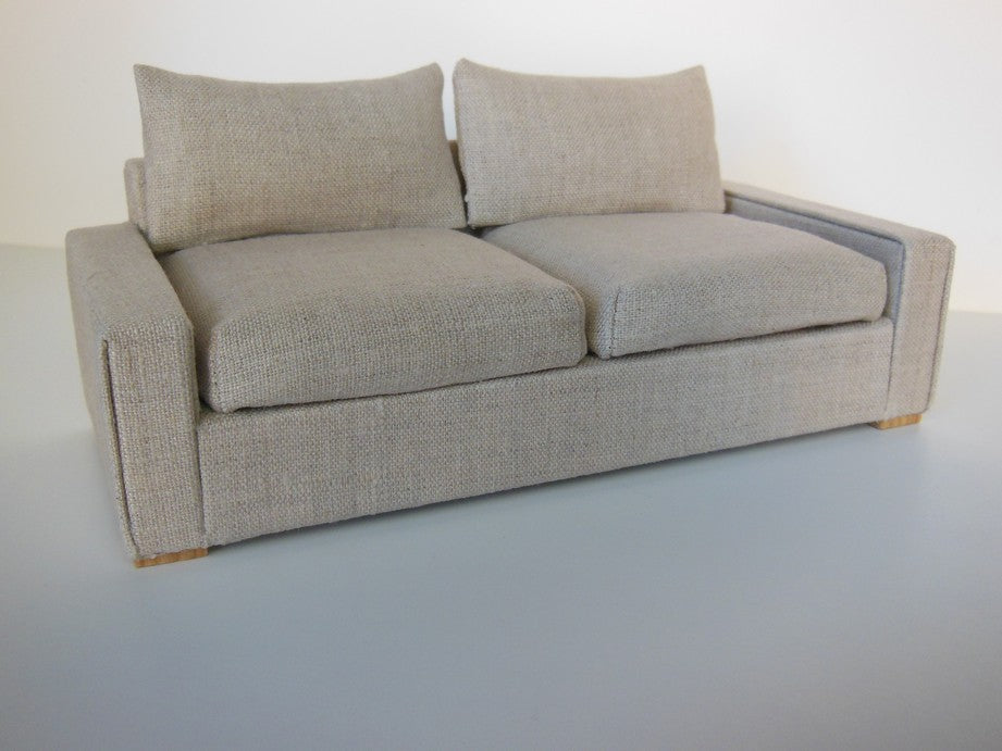 The Davis Sofa is a modern classic style with an angled back. Covered in a linen wheat colored fabric with light wood block feet. Includes two back pillows in matching fabric.