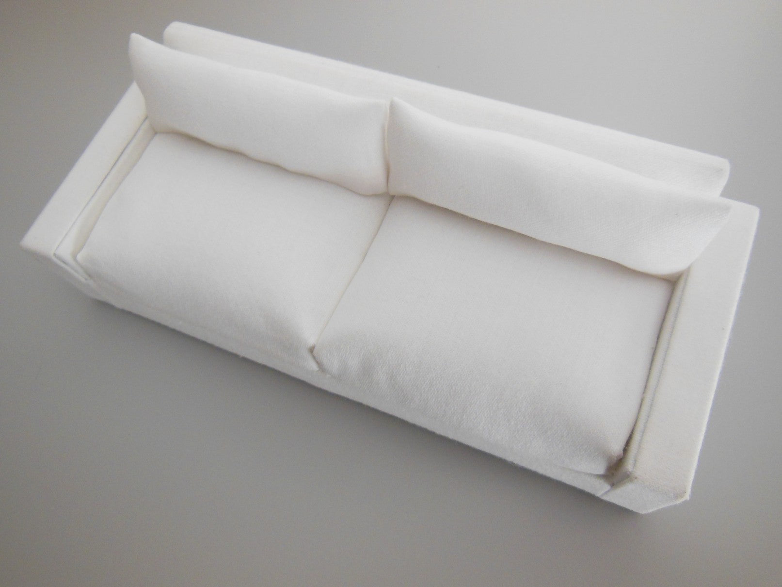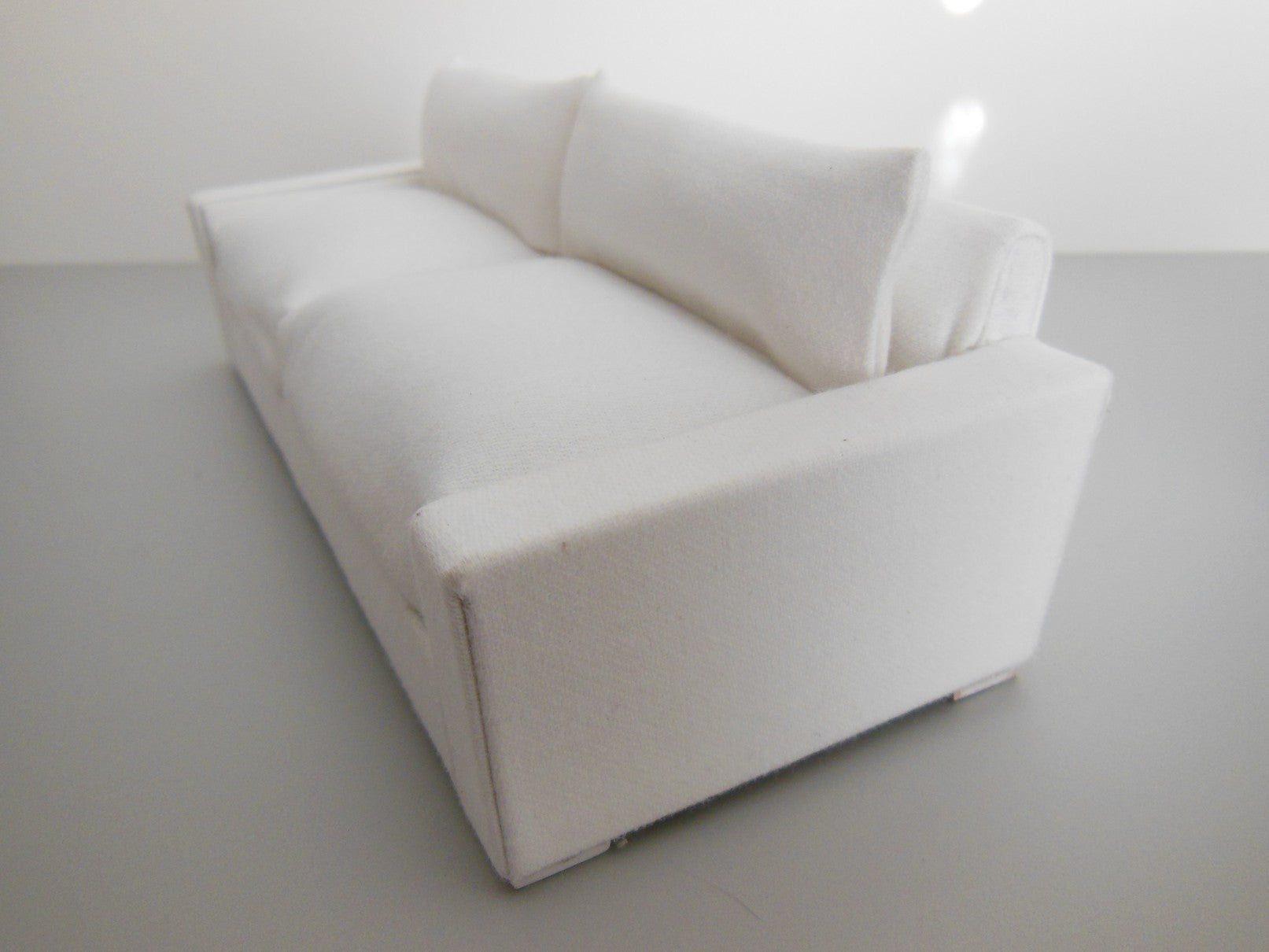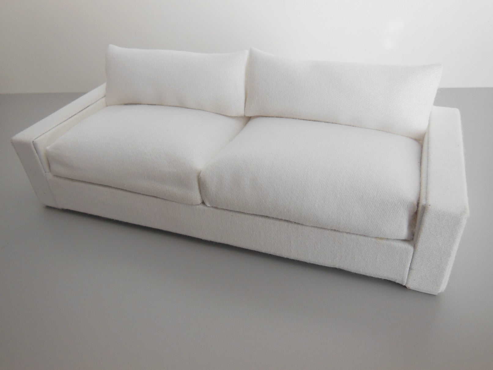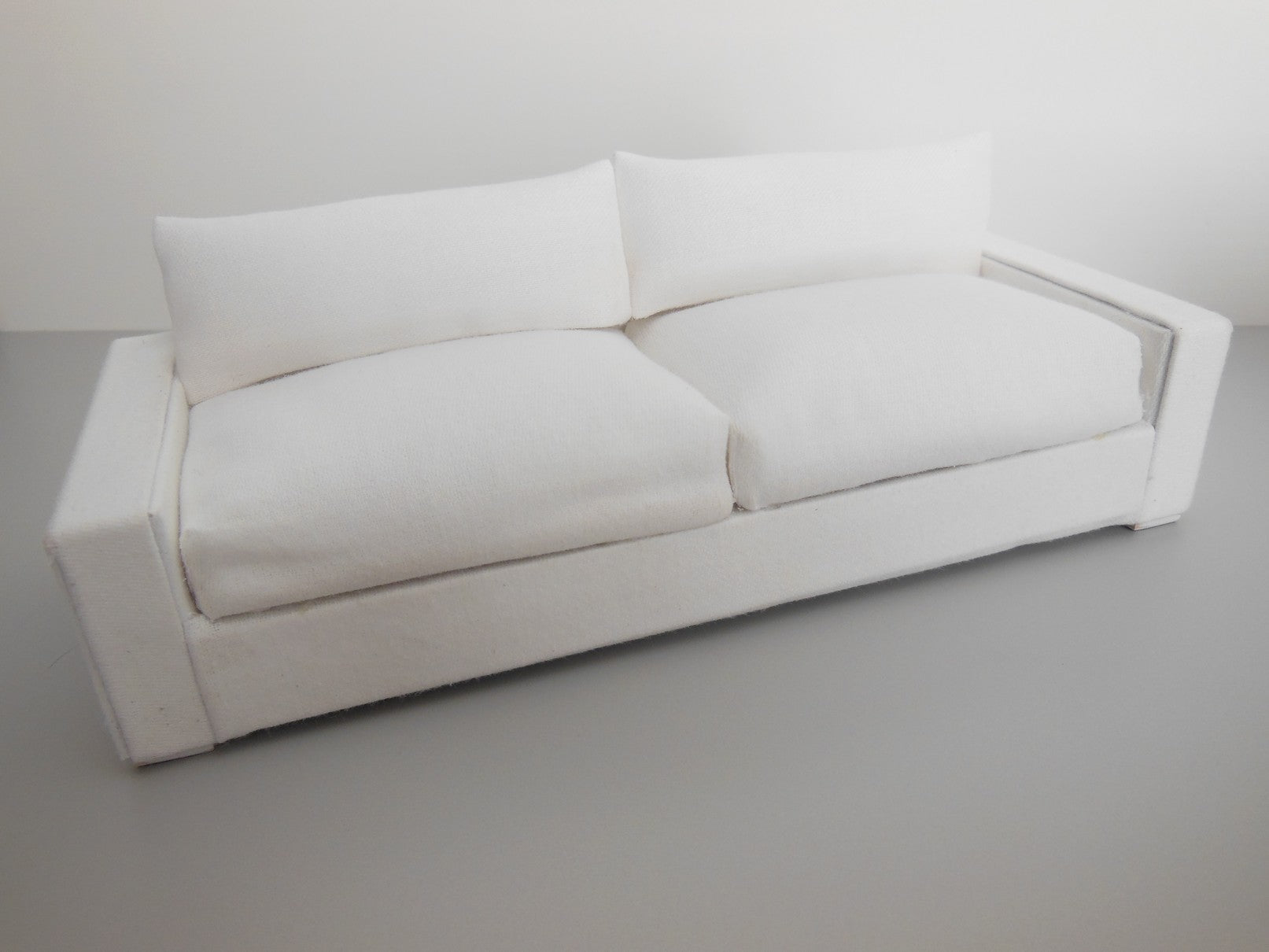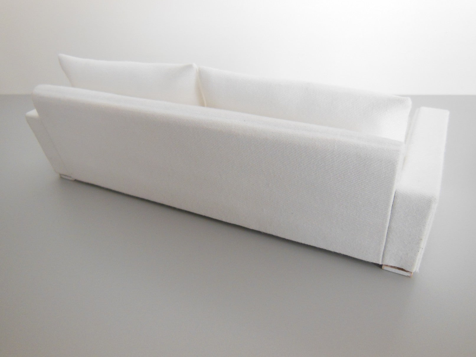 The Davis Sofa is a modern classic style with an angled back. Covered in a linen white colored fabric with light wood block feet. Includes two back pillows in matching fabric.