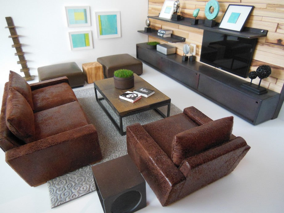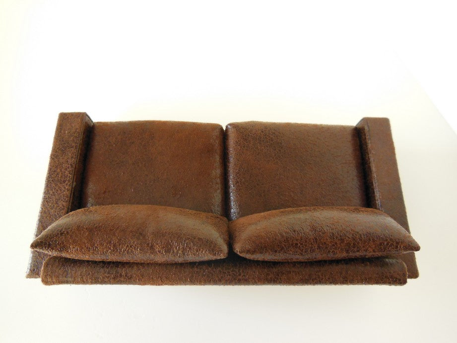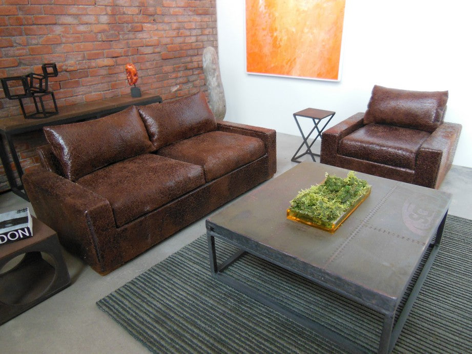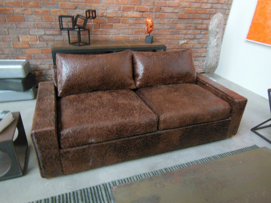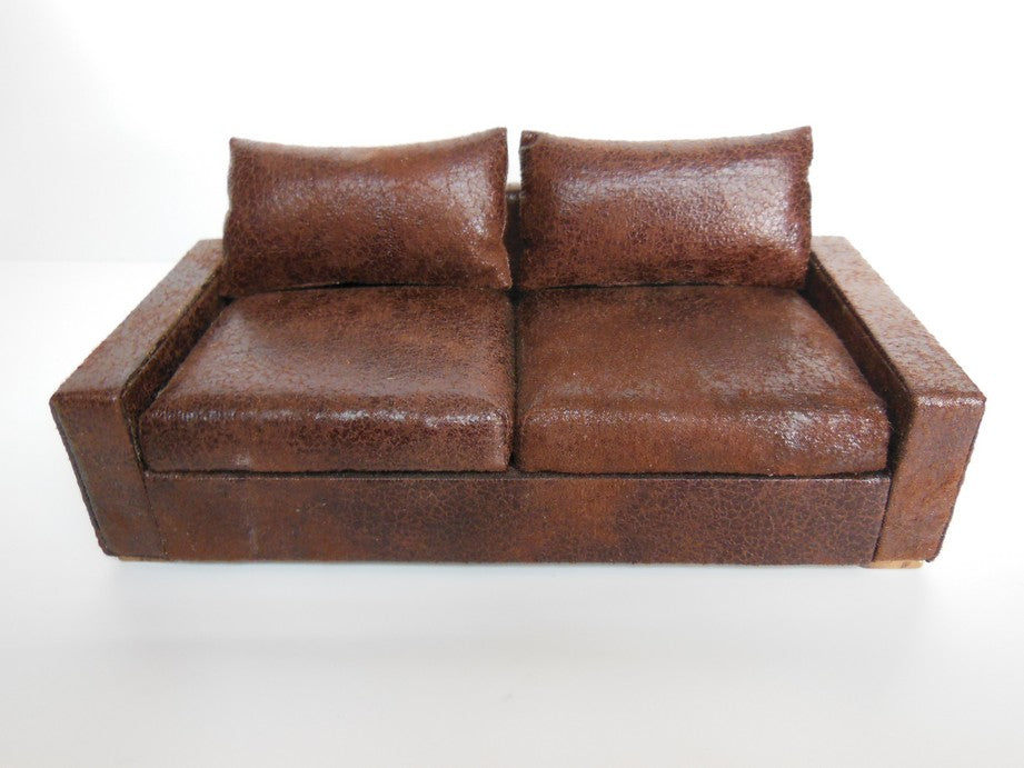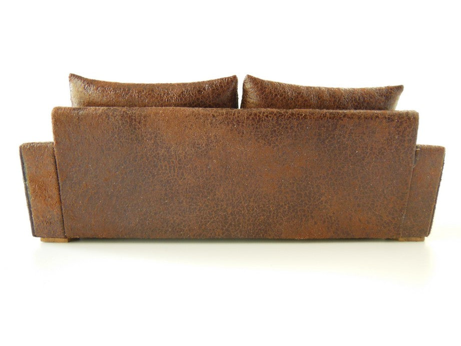 The Davis Sofa is a modern classic style with an angled back. Covered in a vintage brown colored fabric with wood block feet. Includes two back pillows in matching fabric.