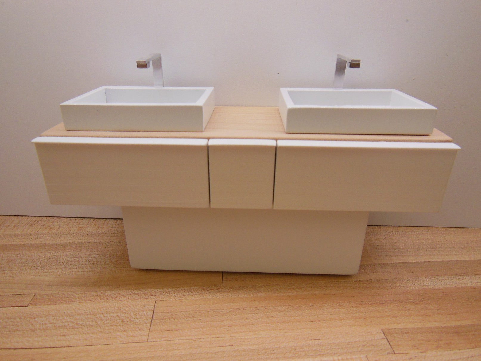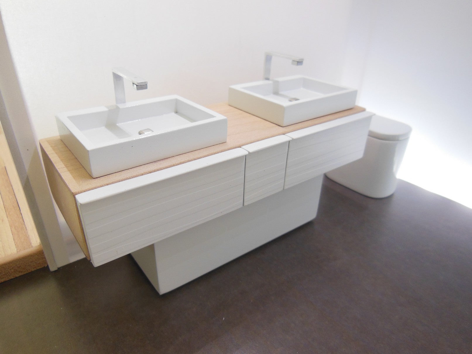 This dual vanity cabinet only features two square sinks with stainless faucets mounted on a birch wood countertop with white wave pattern drawer fronts (NOTE: drawers do not open.)