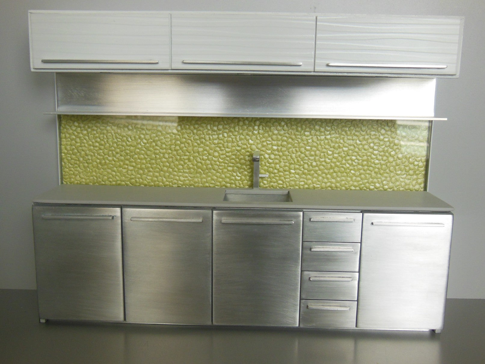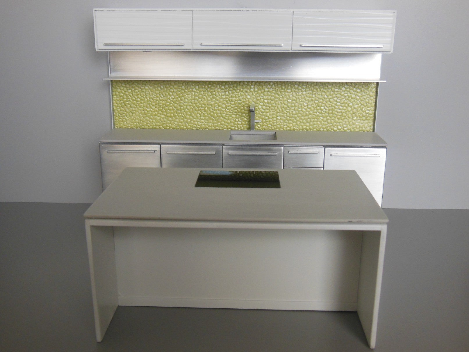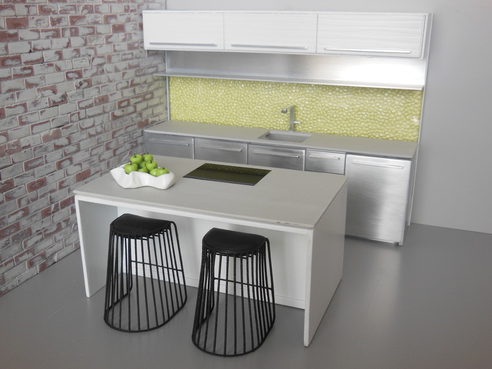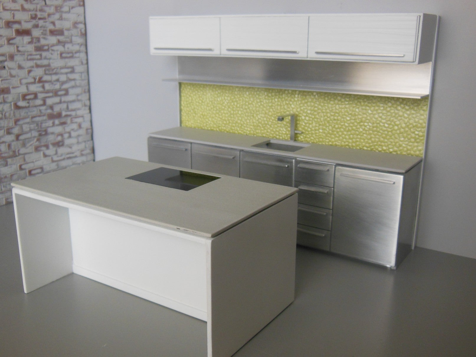 The Essex kitchen is a modern touch for any space complete with a freestanding backwall and island. The backwall upper cabinets are made of a white wave pattern material with the lower cabinets finished in a metal laminate. The backwall also has an open metal storage shelf with a clear Plexiglas backsplash so when in place it can show the existing wall color/finish through. Or you can get creative and create your own colorful backsplash by back-painting the Plexiglas or place a printed piece of paper for a decorative touch (shown with green pebble paper). The countertops are finished in a concrete-like finish (gray plastic). The kitchen includes a single undermount stainless sink with industrial stainless faucet, glass cooktop and lower oven unit (NOTE: cabinets, drawers or appliances do not open). The back wall dimensions are: 9.45 in W x 2.25 in D x 7.25 in H. The island dimensions are: 6 in W x 3.5 in D x 3 in H.