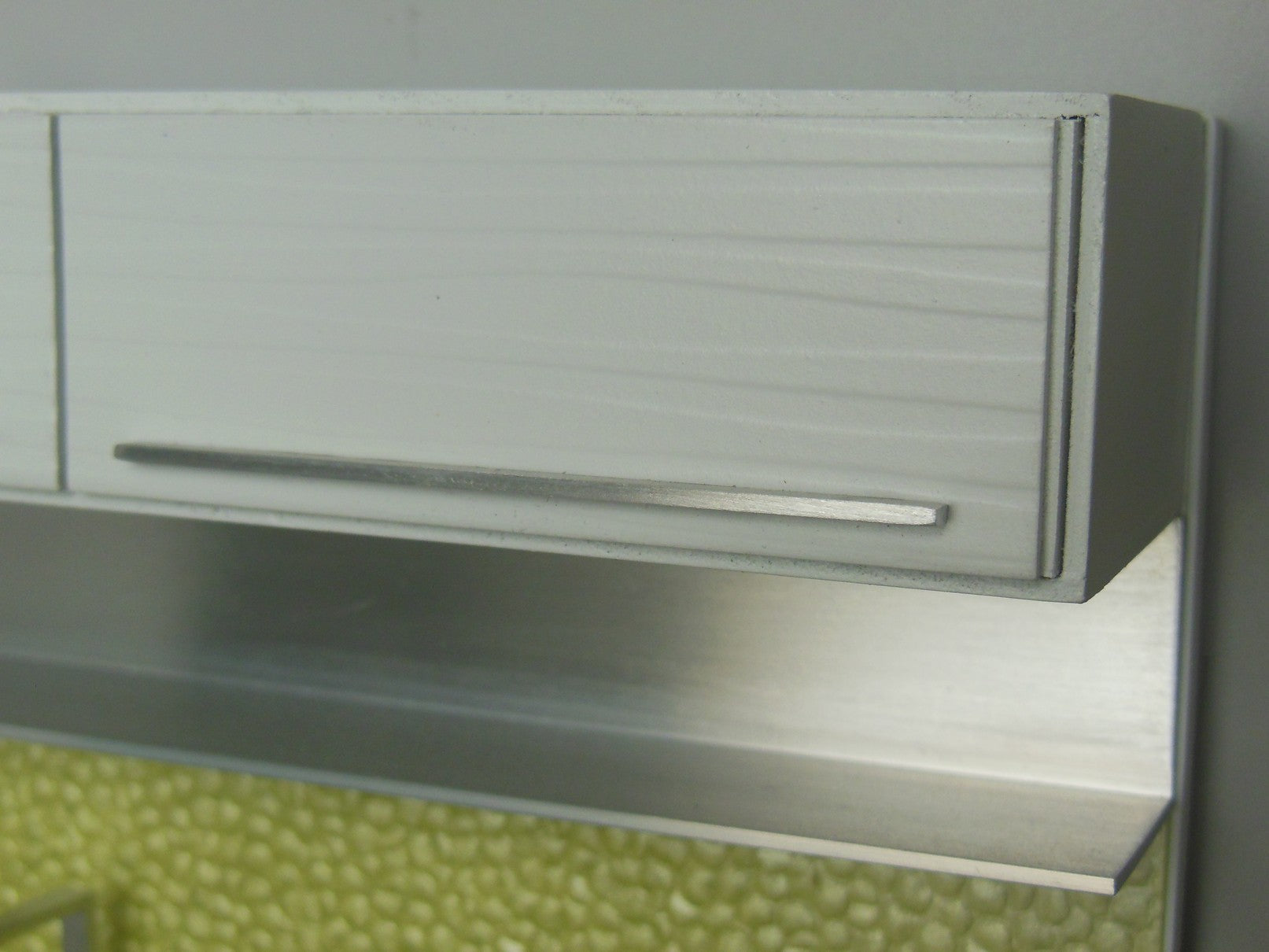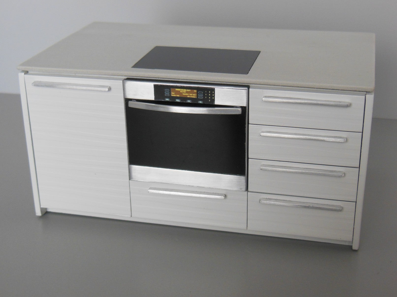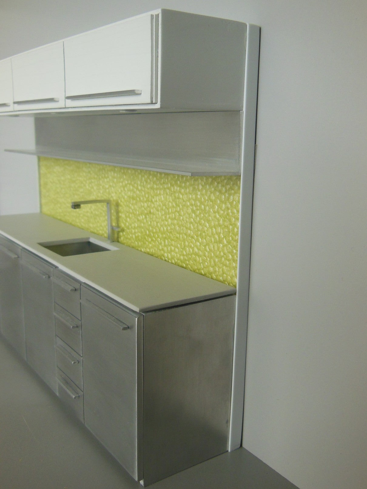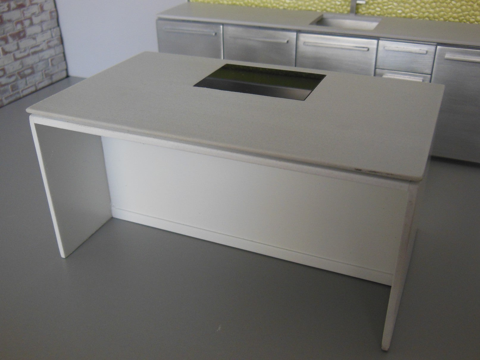 The Essex kitchen is a modern touch for any space complete with a freestanding backwall and island. The backwall upper cabinets are made of a white wave pattern material with the lower cabinets finished in a metal laminate. The backwall also has an open metal storage shelf with a clear Plexiglas backsplash so when in place it can show the existing wall color/finish through. Or you can get creative and create your own colorful backsplash by back-painting the Plexiglas or place a printed piece of paper for a decorative touch (shown with green pebble paper). The countertops are finished in a concrete-like finish (gray plastic). The kitchen includes a single undermount stainless sink with industrial stainless faucet, glass cooktop and lower oven unit (NOTE: cabinets, drawers or appliances do not open). The back wall dimensions are: 9.45 in W x 2.25 in D x 7.25 in H. The island dimensions are: 6 in W x 3.5 in D x 3 in H.