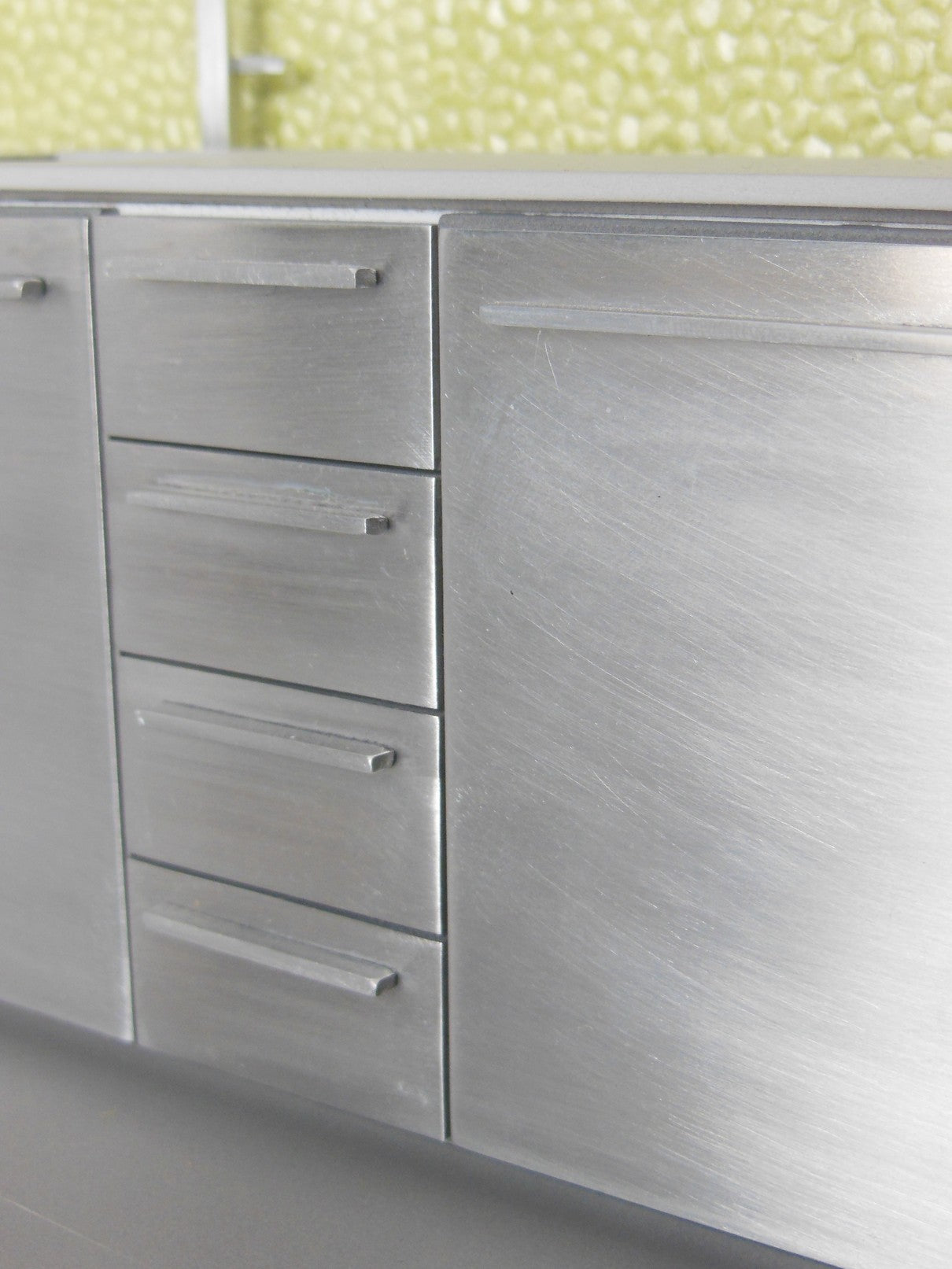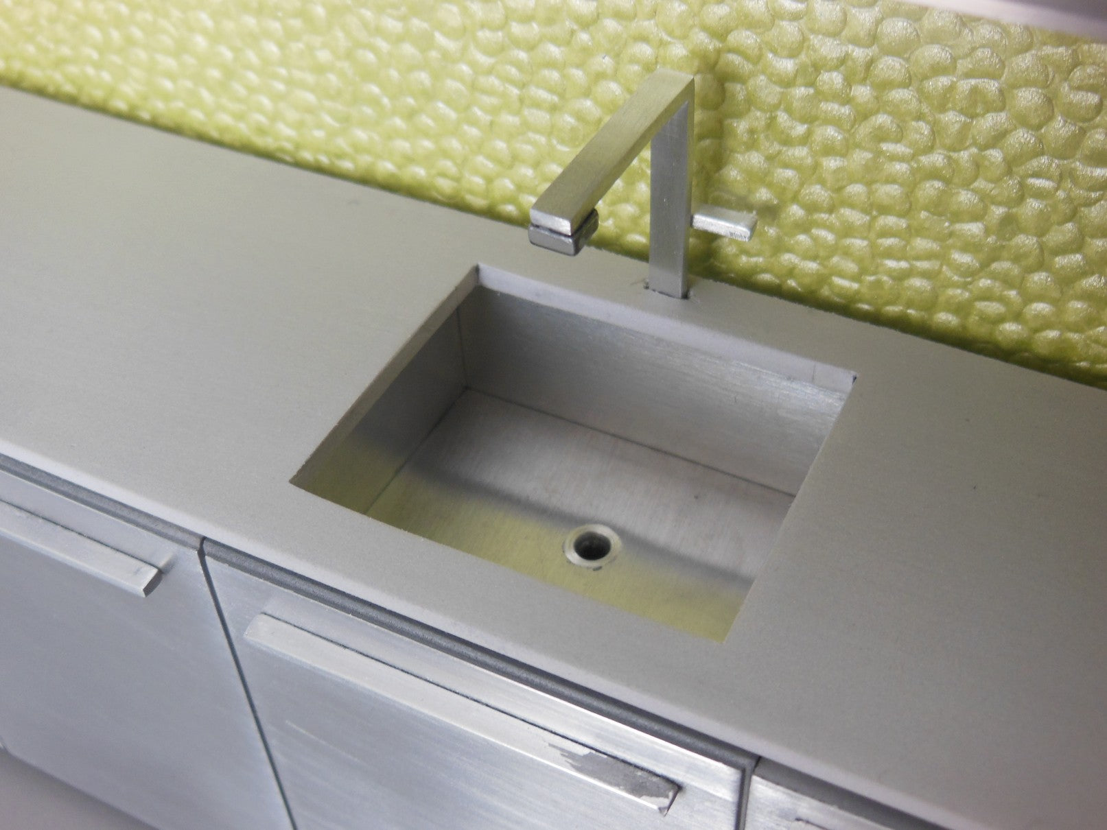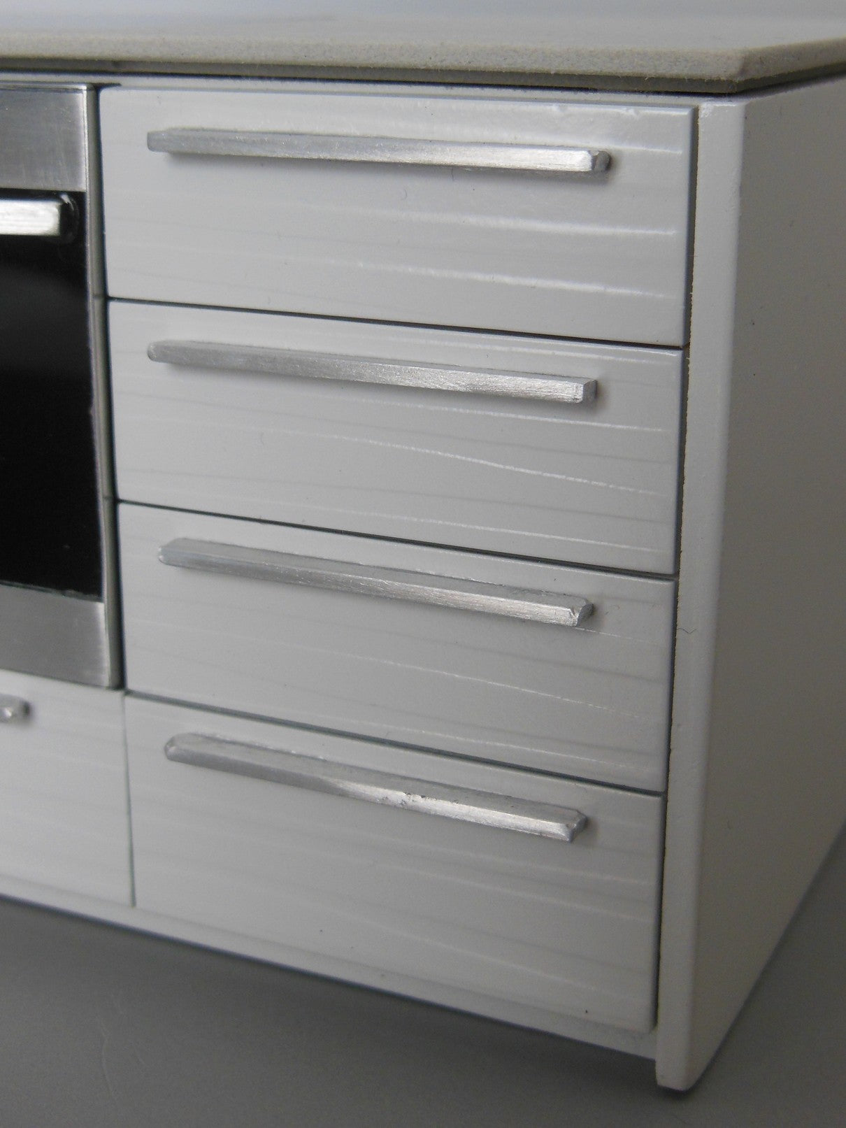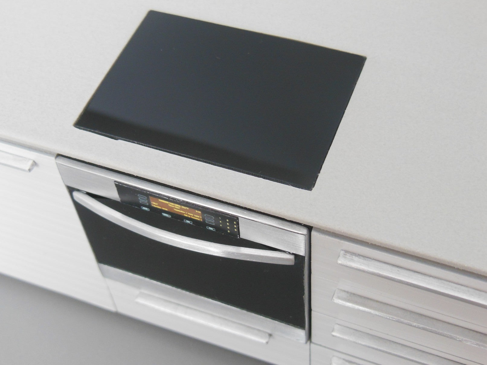 The Essex kitchen is a modern touch for any space complete with a freestanding backwall and island. The backwall upper cabinets are made of a white wave pattern material with the lower cabinets finished in a metal laminate. The backwall also has an open metal storage shelf with a clear Plexiglas backsplash so when in place it can show the existing wall color/finish through. Or you can get creative and create your own colorful backsplash by back-painting the Plexiglas or place a printed piece of paper for a decorative touch (shown with green pebble paper). The countertops are finished in a concrete-like finish (gray plastic). The kitchen includes a single undermount stainless sink with industrial stainless faucet, glass cooktop and lower oven unit (NOTE: cabinets, drawers or appliances do not open). The back wall dimensions are: 9.45 in W x 2.25 in D x 7.25 in H. The island dimensions are: 6 in W x 3.5 in D x 3 in H.