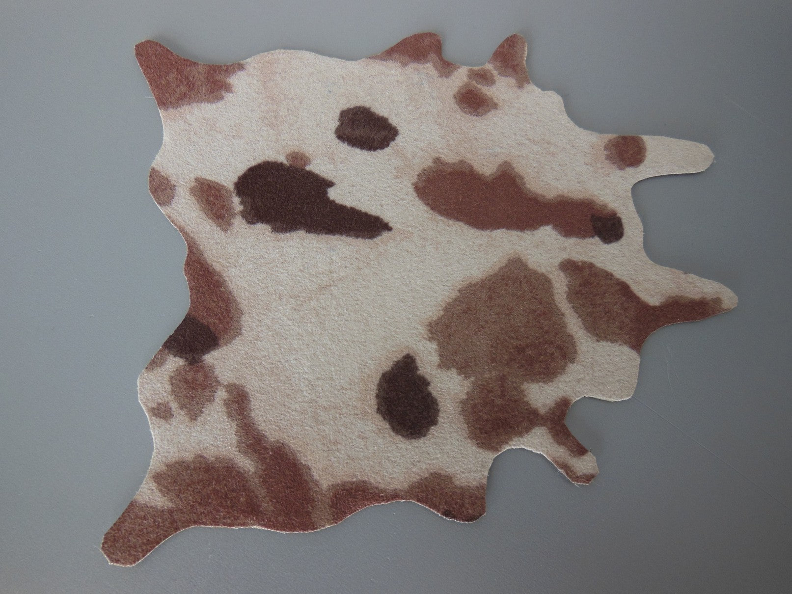 Faux cowhide rug in white/tan/brown. NOTE: Pattern and coloration will vary on each rug.