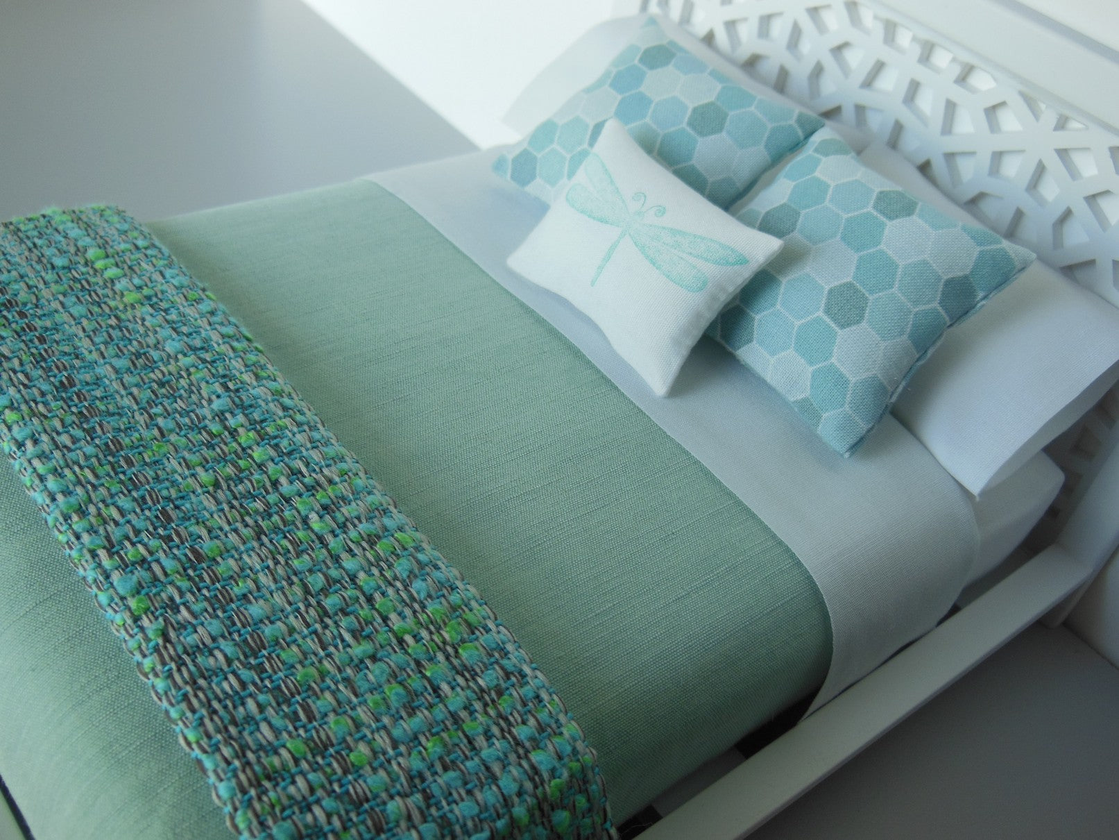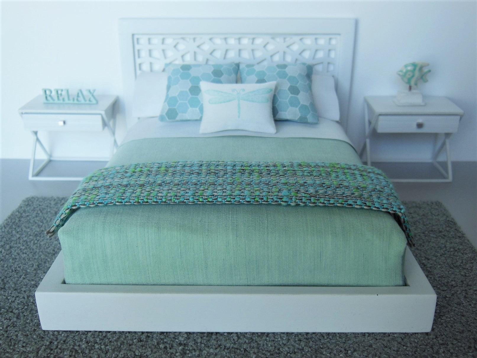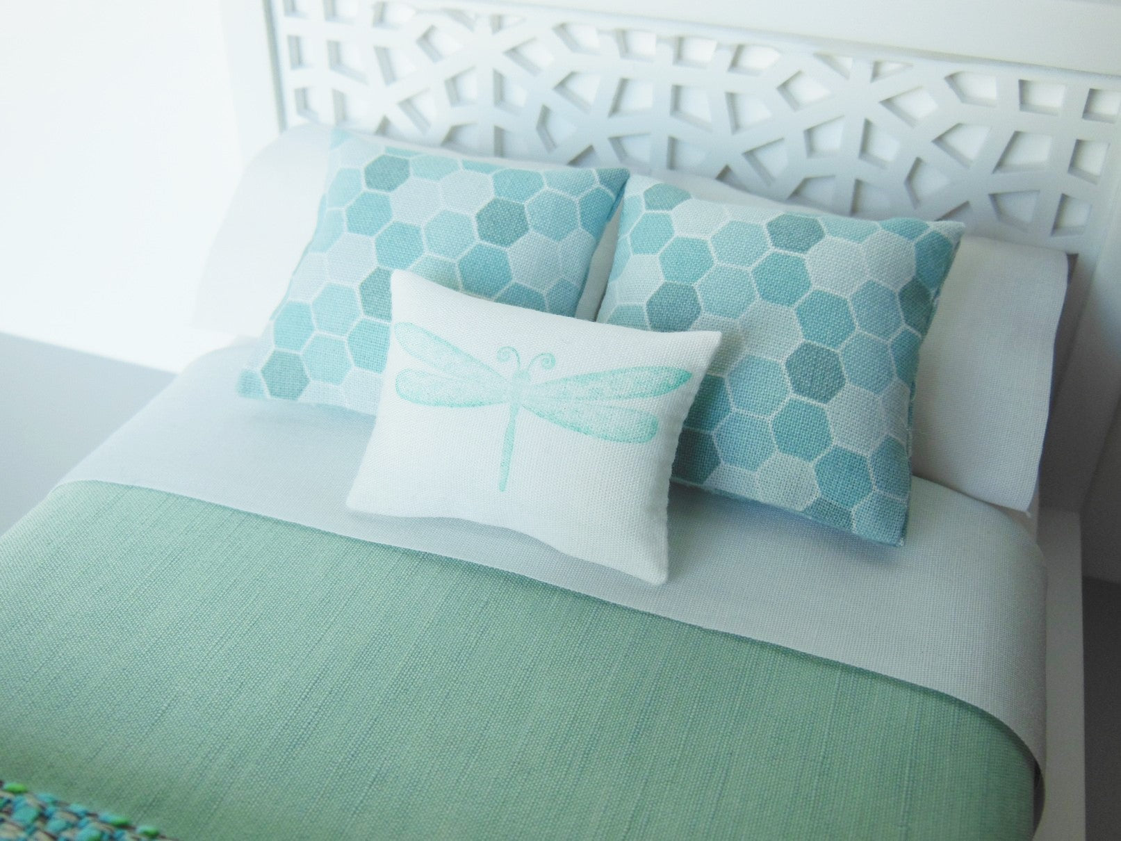 Our fern collection invokes a feeling of being in nature.The collection includes seafoam duvet, white sheet set, two large hexagon blue pillows, medium dragonfly printed rectangle pillow, and oxford caribbean blue throw. Mattress, standard pillows and bed frame sold separately.