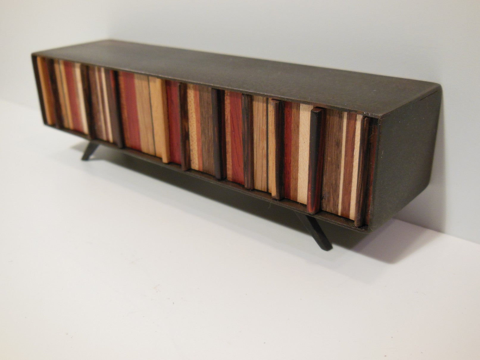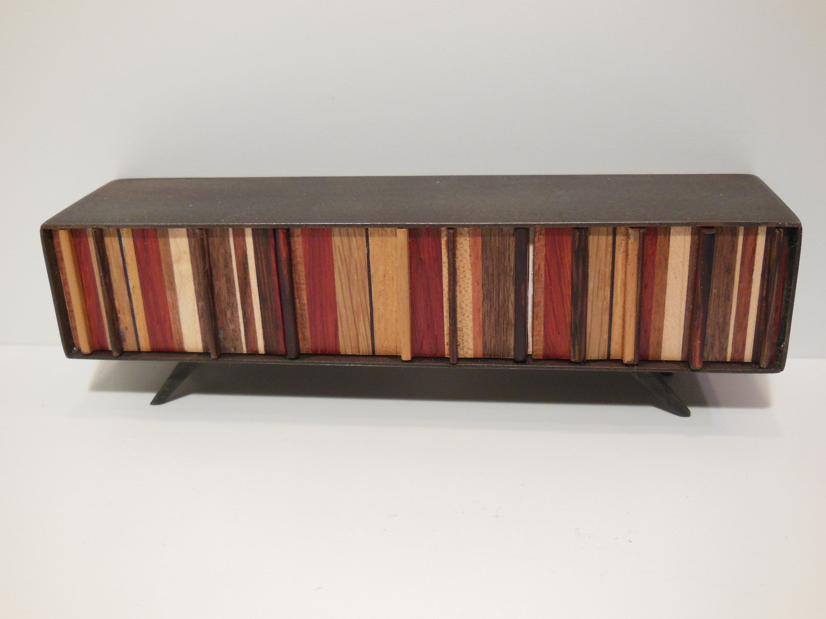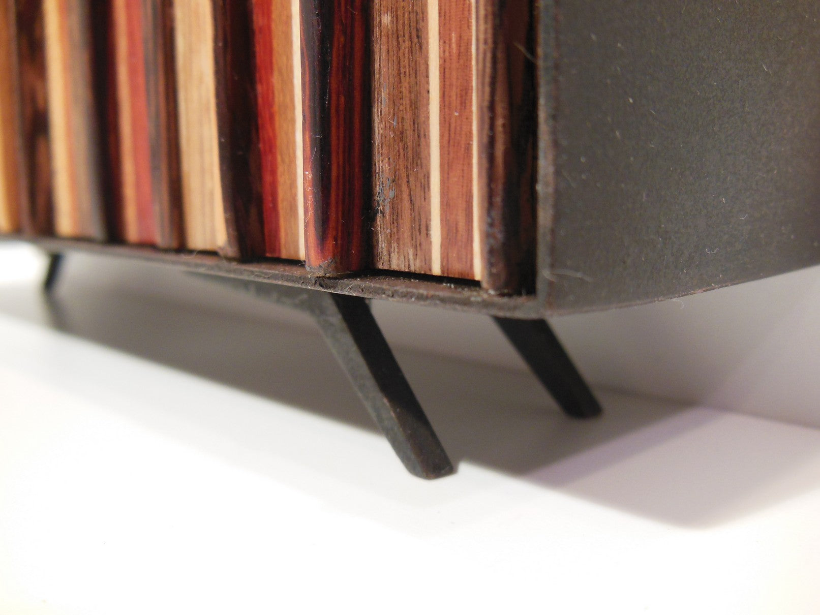 For those who love the M.U.T.T. line, this is a must have piece. The doors are a collection of exotic woods in varying heights. This adds a level of texture and contrast to the simulated steel surround. Burnished black paint over plastic, exotic woods. Doors do not open.