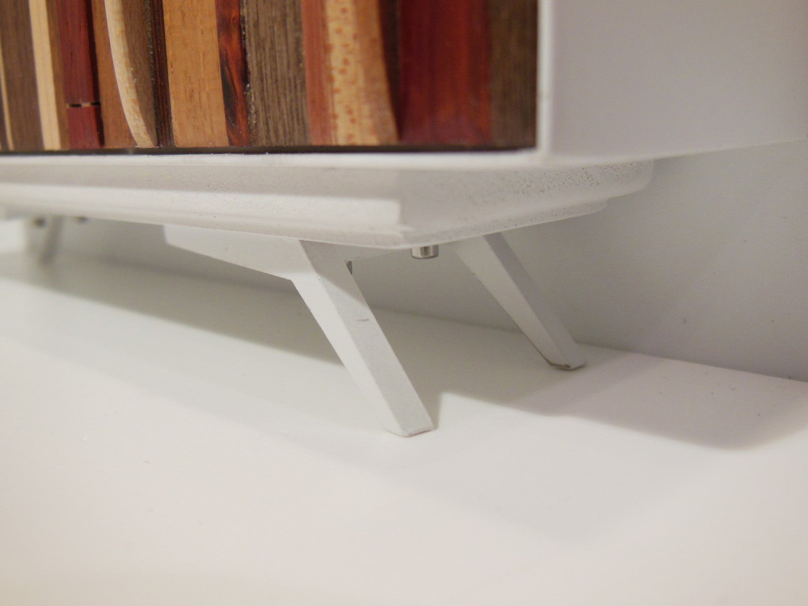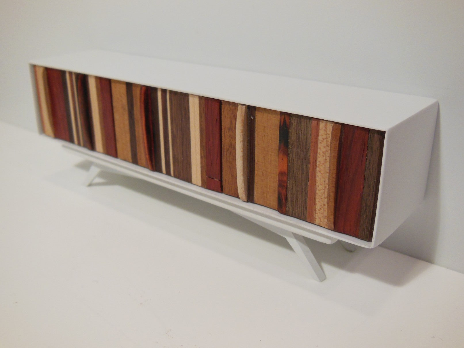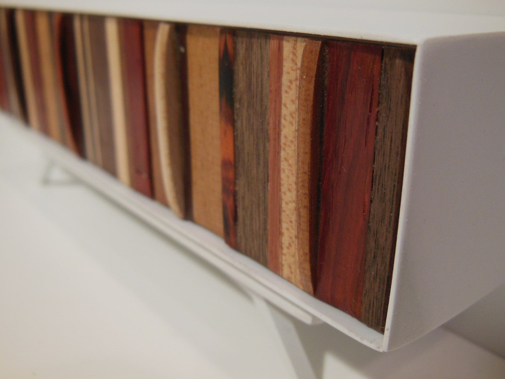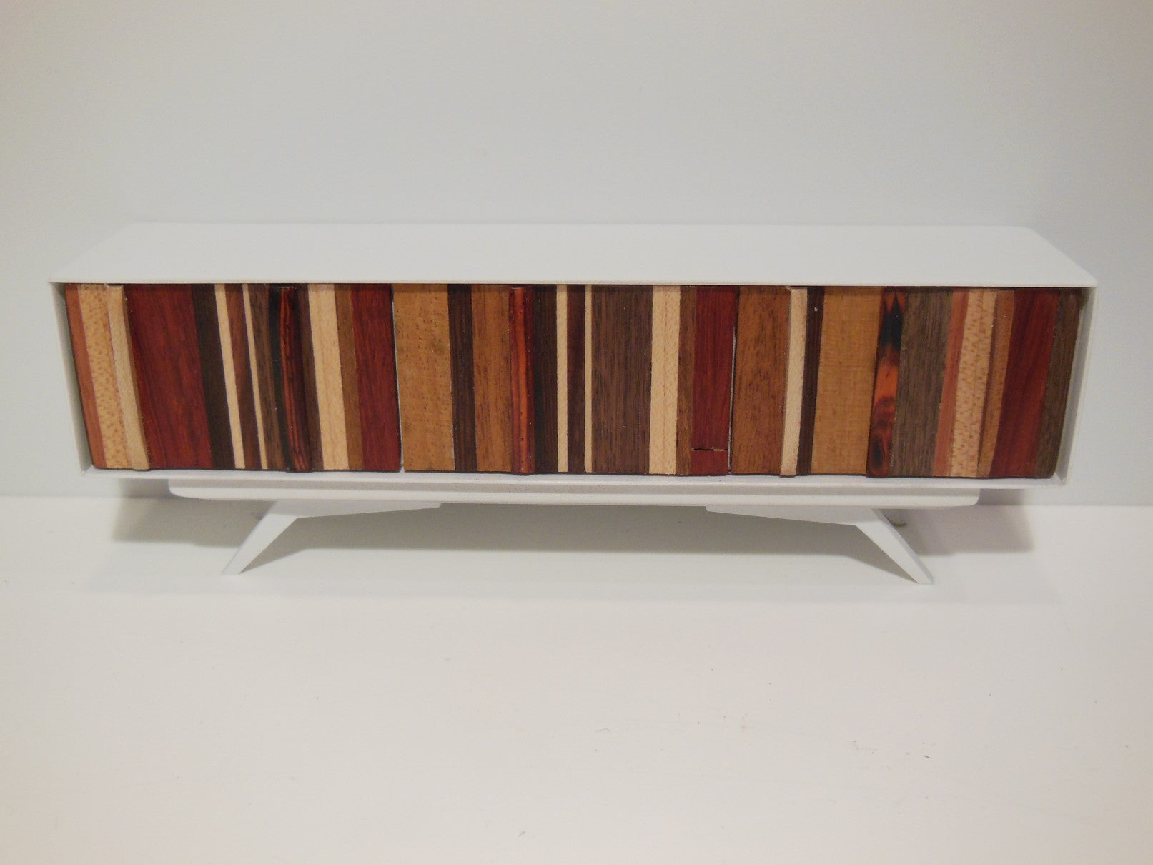 For those who love the M.U.T.T. line, this is a must have piece. The doors are a collection of exotic woods in varying heights. This adds a level of texture and interest to the otherwise simple white surround. Doors do not open.
