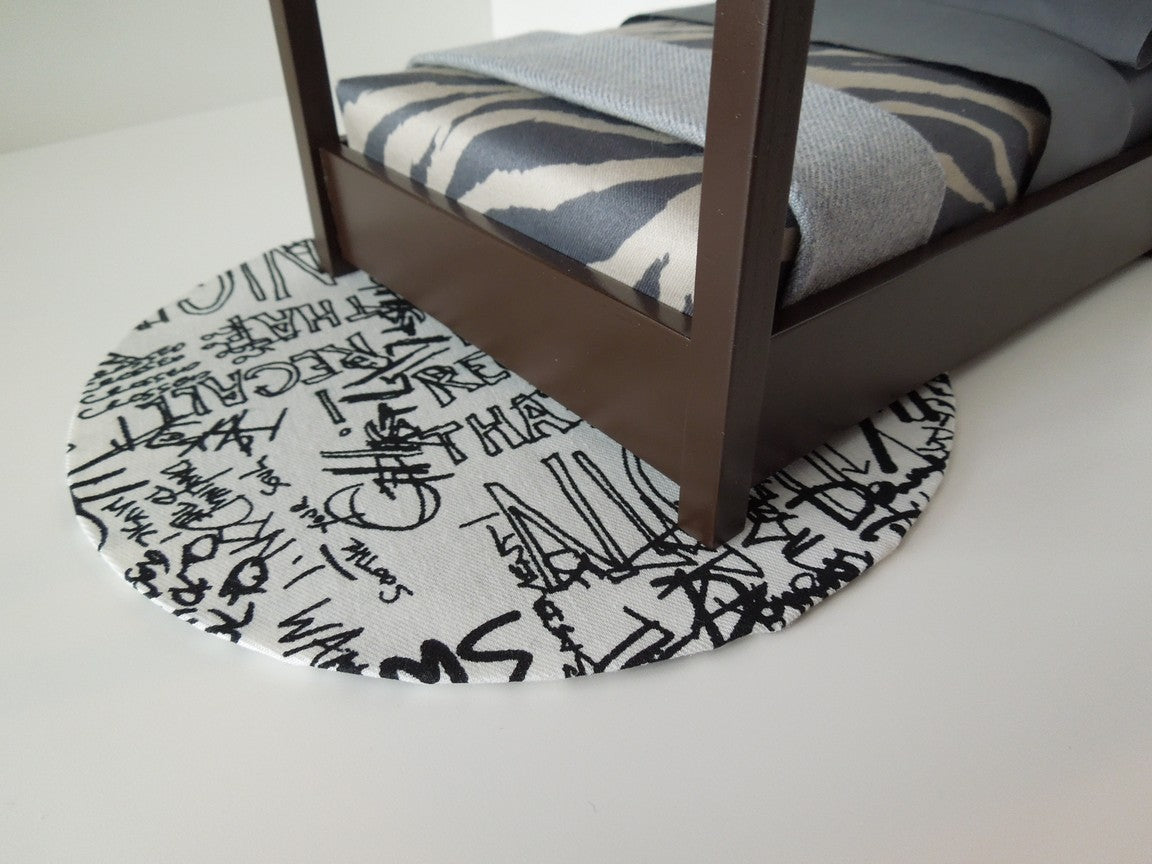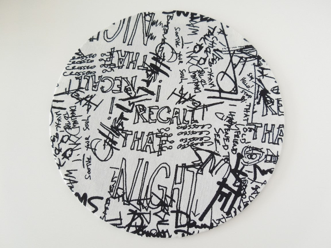 The Graffiti Round Area Rug is constructed of a white canvas background with black random graphics and lettering (NOTE: each piece is unique - graphics and lettering will vary)