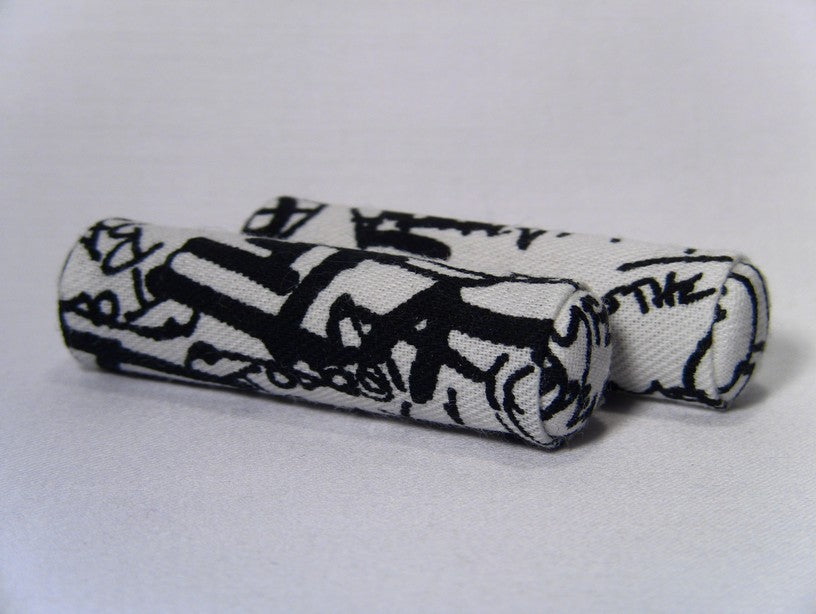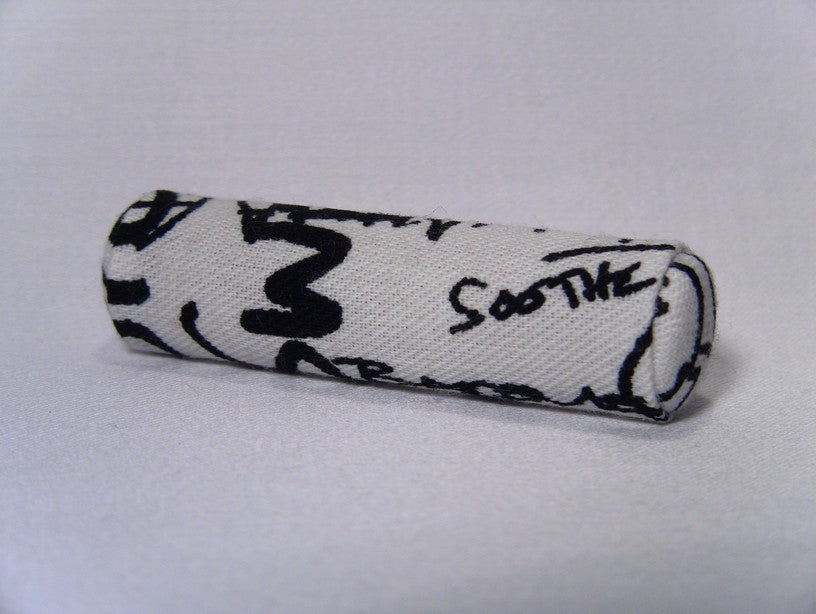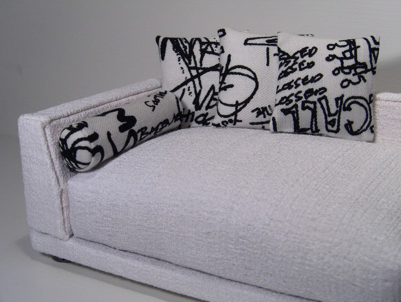 The Graffiti Short Bolster Pillow is constructed of a white fabric with black random graphics and lettering (NOTE: each piece is unique and graphics and lettering will vary).