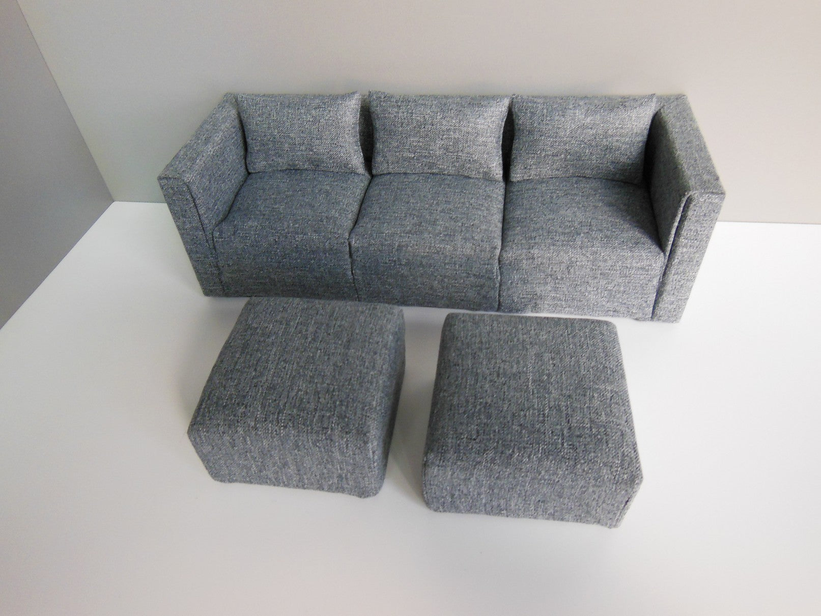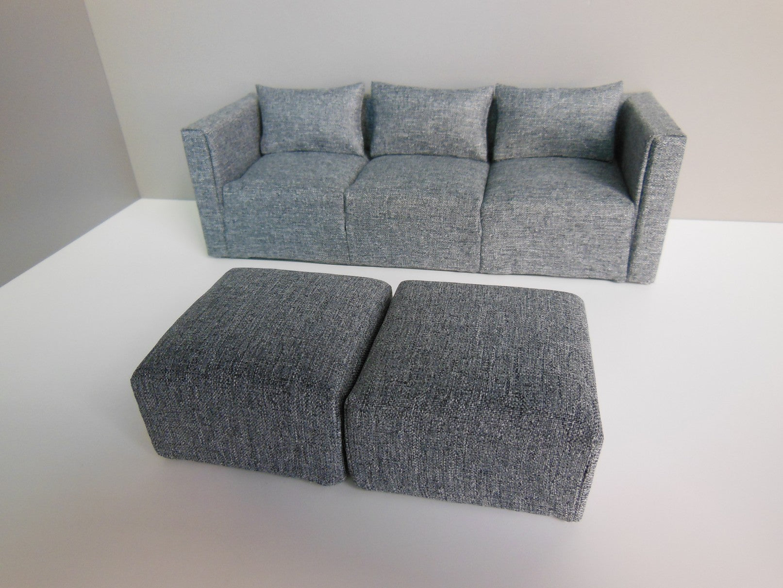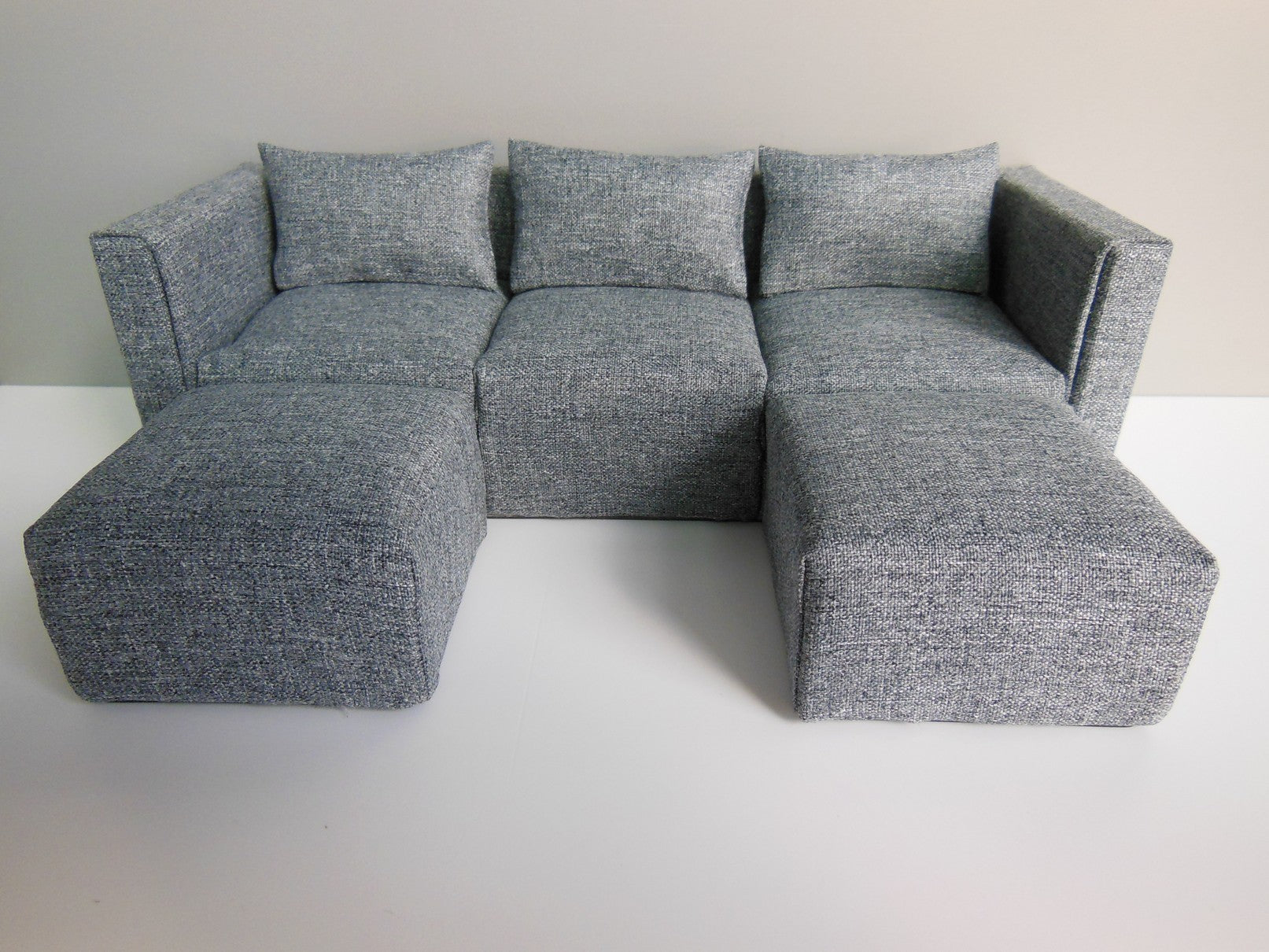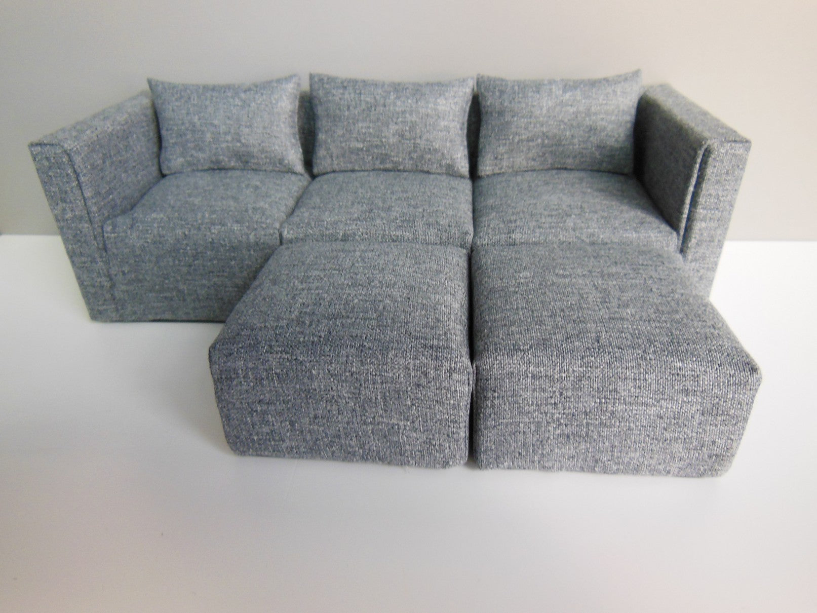 Sectional in gray fabric with 3 back pillows and two matching ottomans. Ottomans can be rearranged for different seating options as shown in pictures. Dimensions do not include the ottomans - only the sofa.