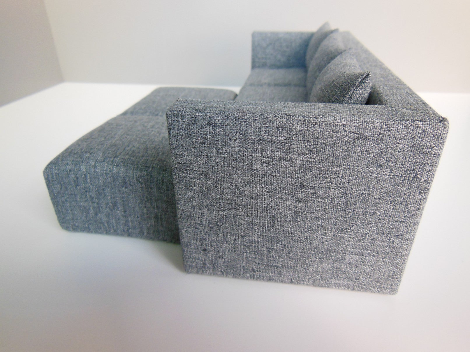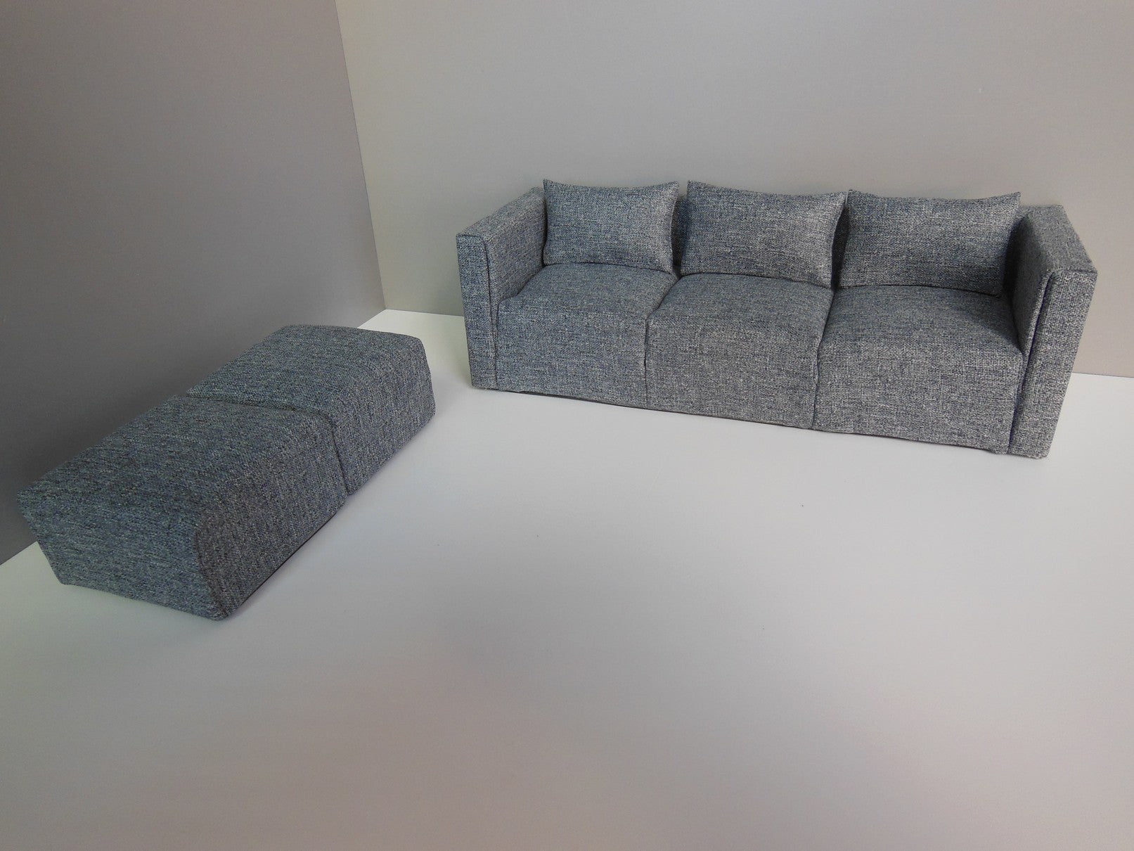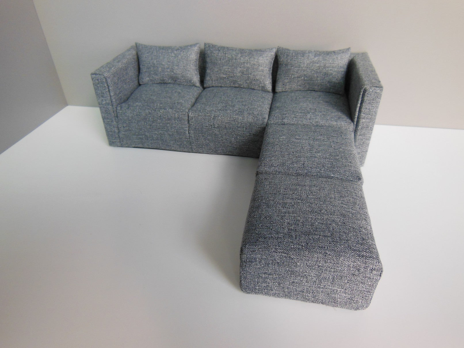 Sectional in gray fabric with 3 back pillows and two matching ottomans. Ottomans can be rearranged for different seating options as shown in pictures. Dimensions do not include the ottomans - only the sofa.