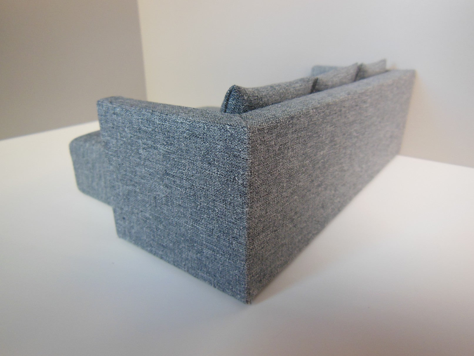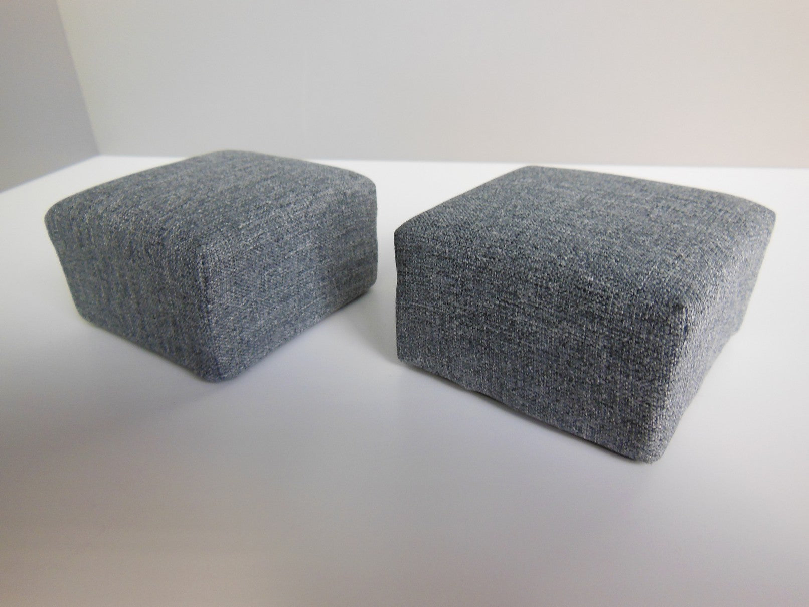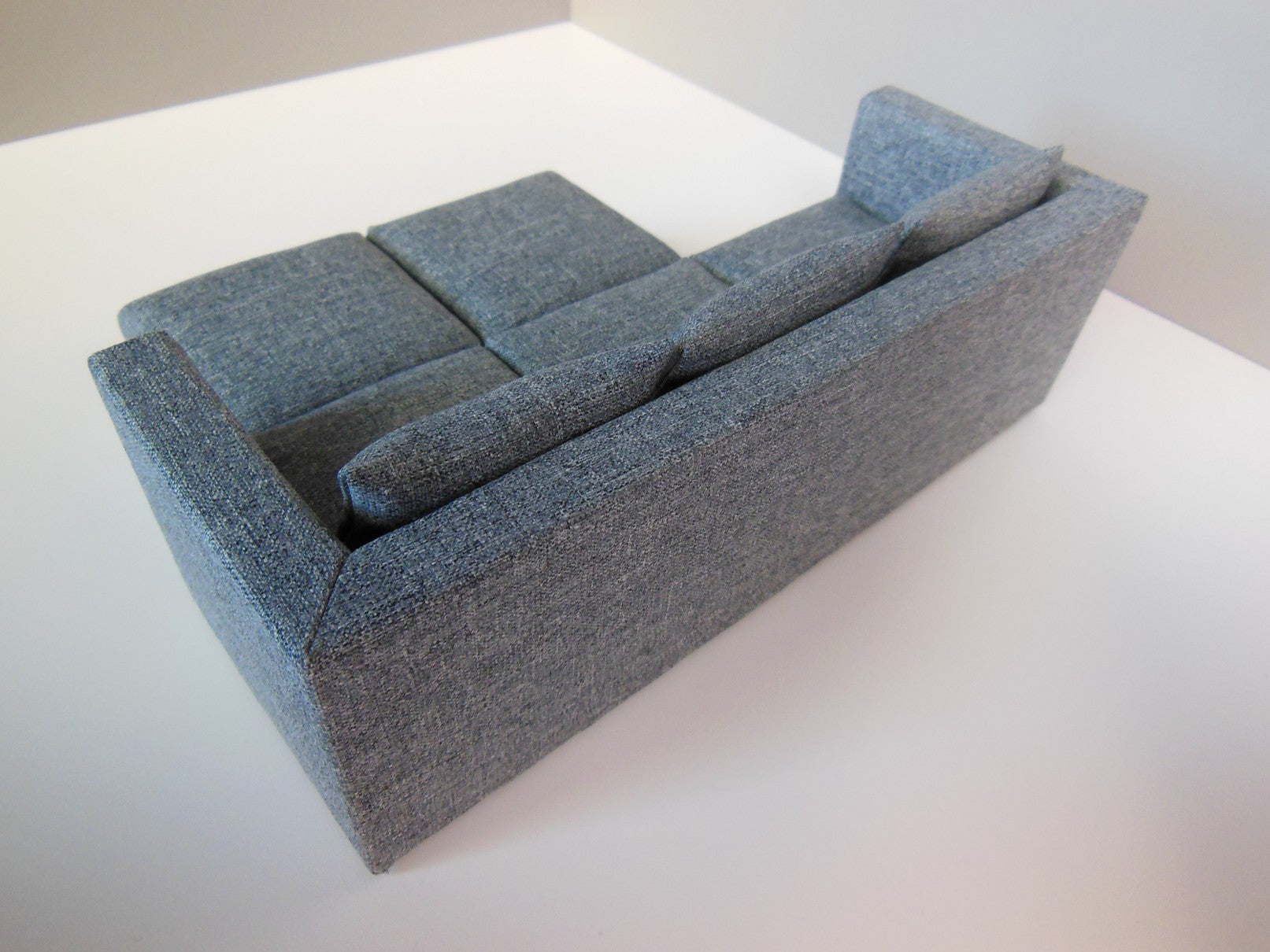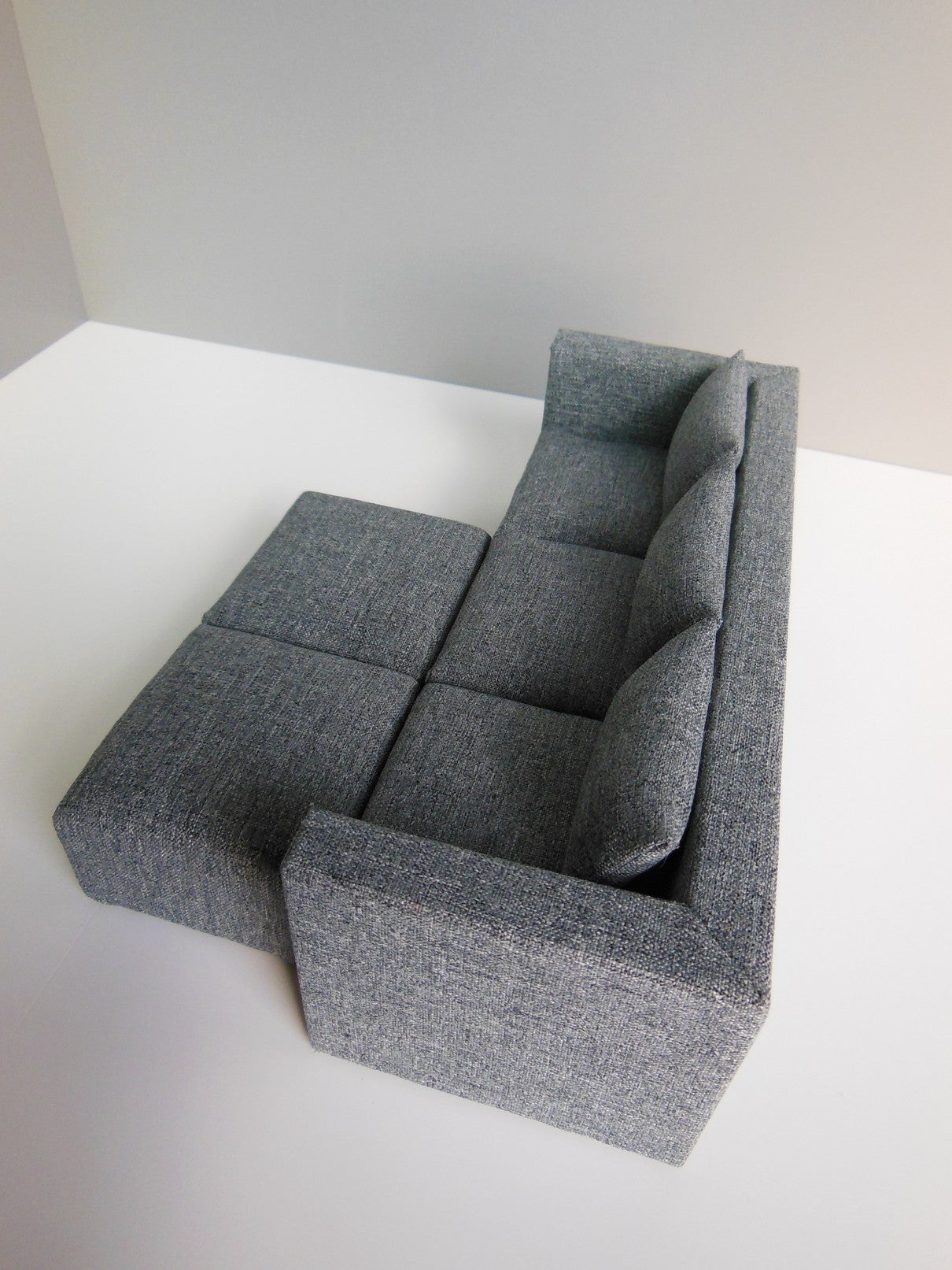 Sectional in gray fabric with 3 back pillows and two matching ottomans. Ottomans can be rearranged for different seating options as shown in pictures. Dimensions do not include the ottomans - only the sofa.
