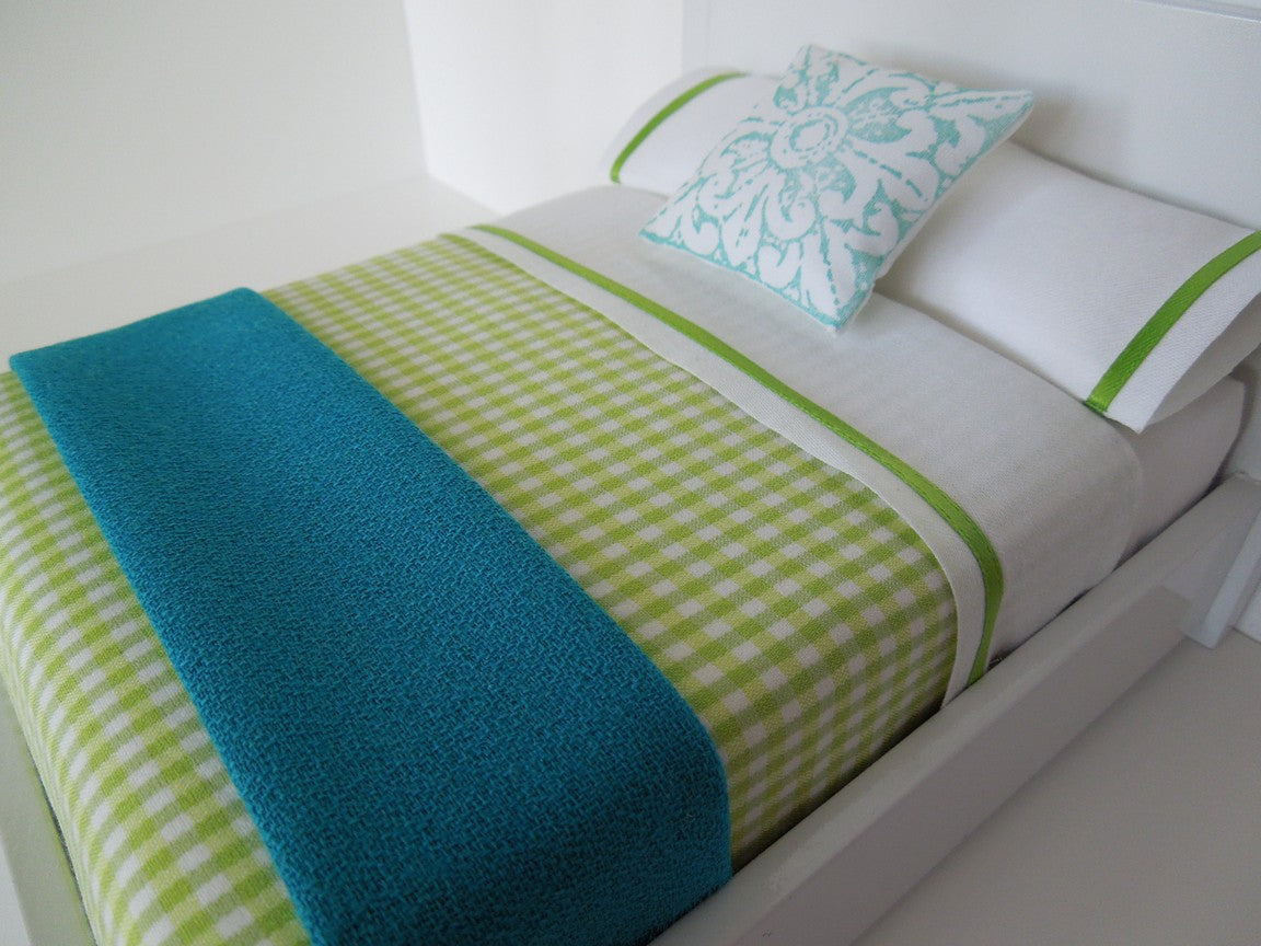 This duvet is constructed of a green and white checked fabric. The duvet pulls over the entire mattress and can either be folded down to expose one of our coordinating sheet sets or fully pulled up for a more finished look. Designed to fit our Essentials queen mattress.