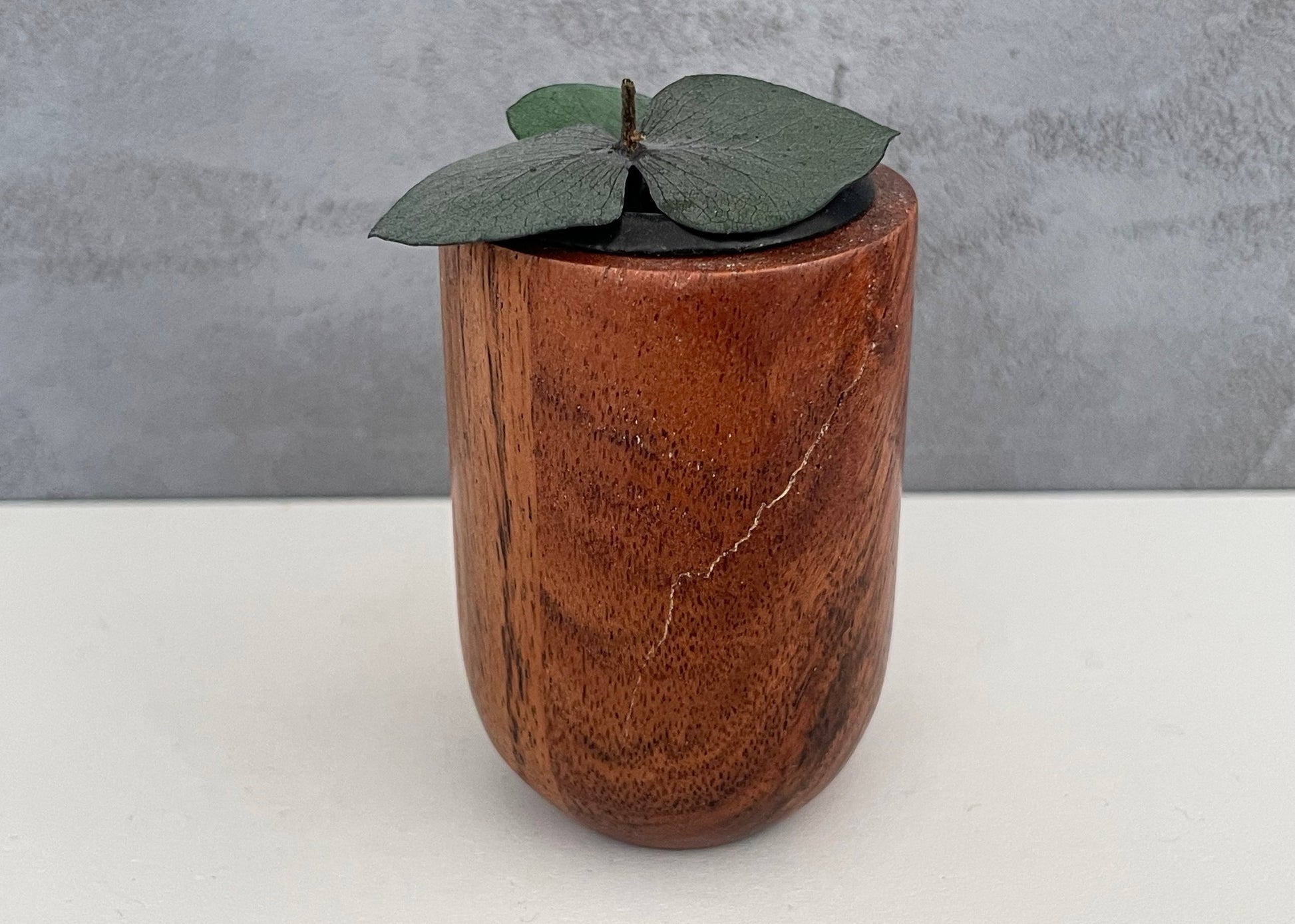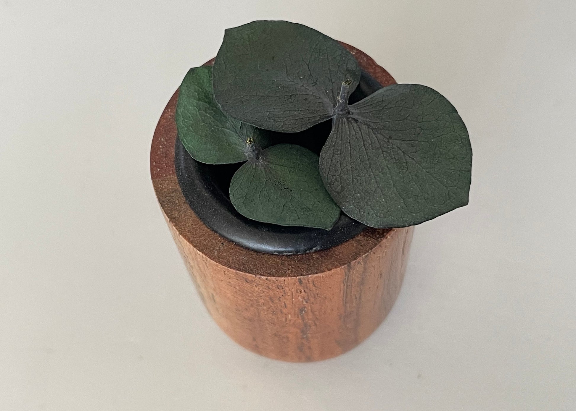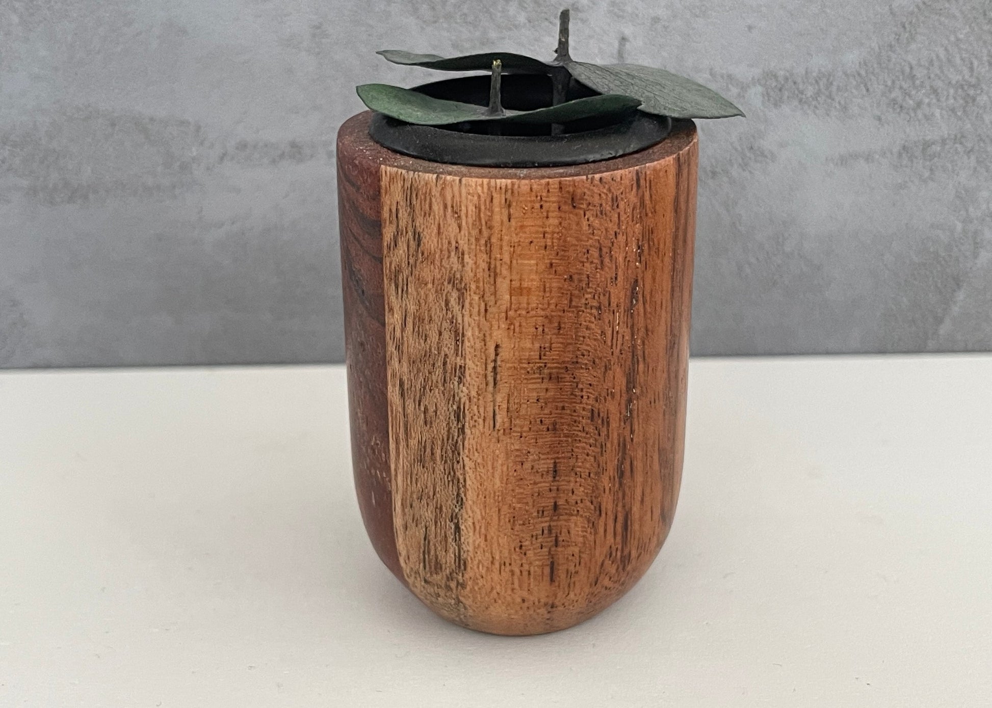 Bring a touch of freshness to your space with this cylindrical wood planter, complete with vibrant greenery. A simple yet stylish accent to brighten any room.