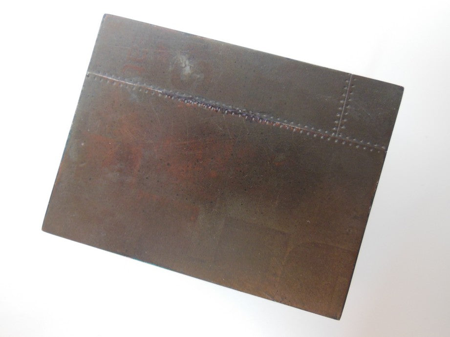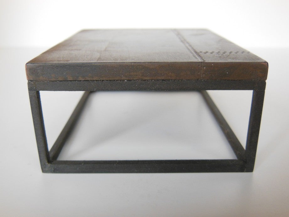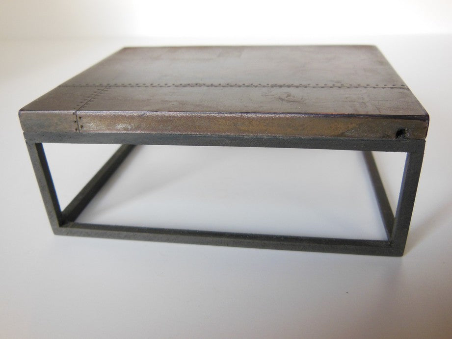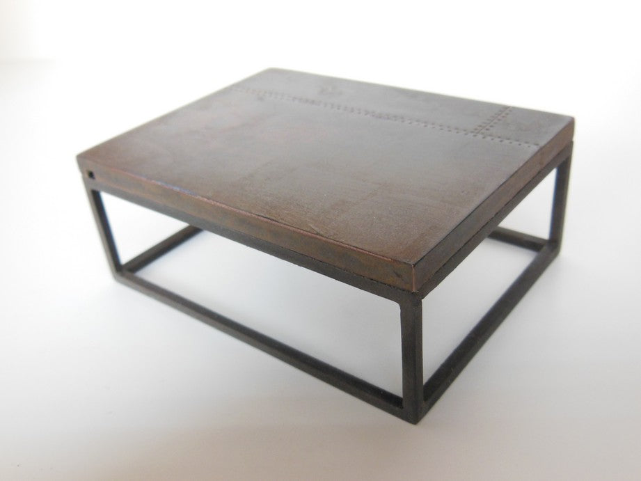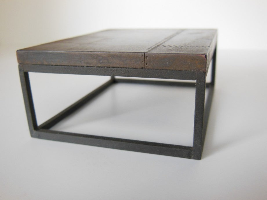 Our Industrial coffee tables are constructed with a frame base and unique top that has random embossed letter/word detailing. The finish on the top is a rusty patina, while the bottom is a burnished cold rolled steel look. Each table is completely unique and will vary in details/patina coloration.