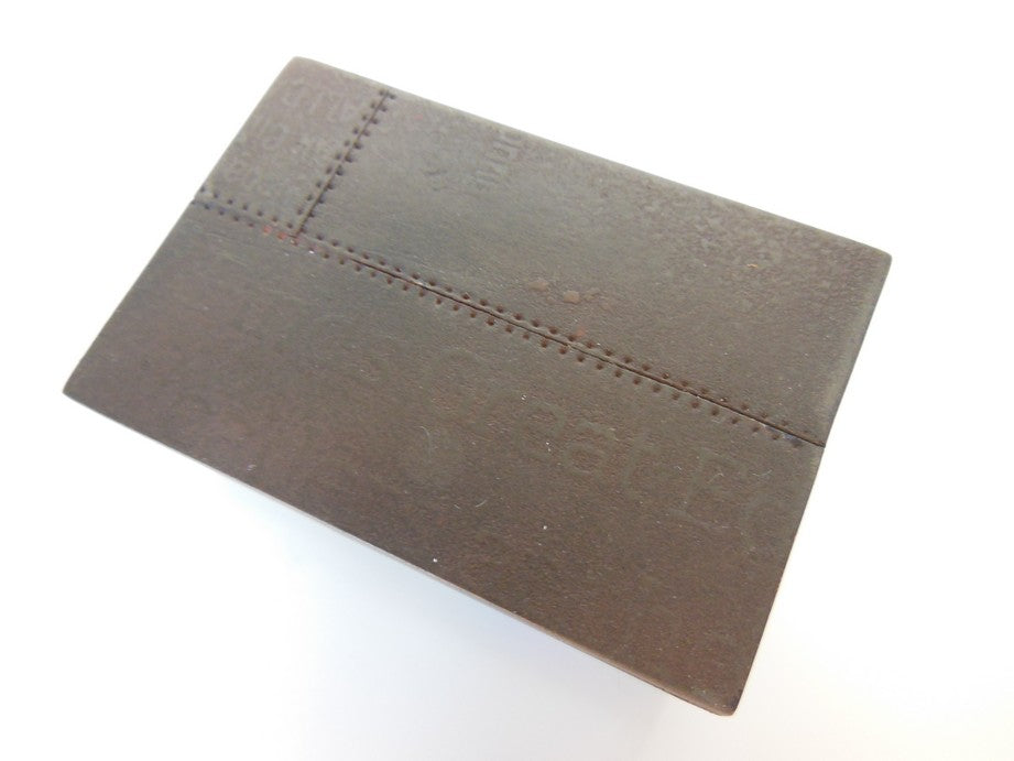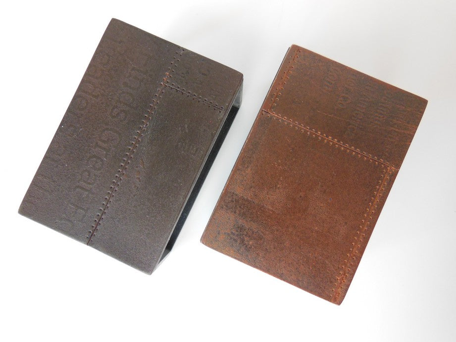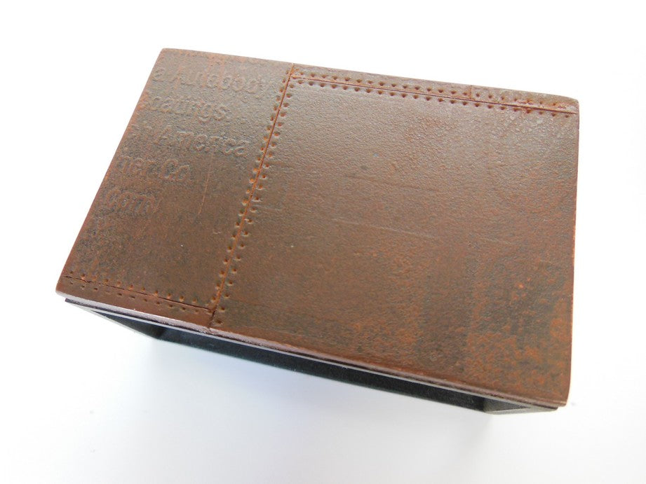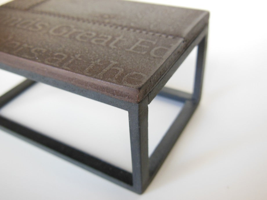 Our Industrial coffee tables are constructed with a frame base and unique top that has random embossed letter/word detailing. The finish on the top is a rusty patina, while the bottom is a burnished cold rolled steel look. Each table is completely unique and will vary in details/patina coloration.