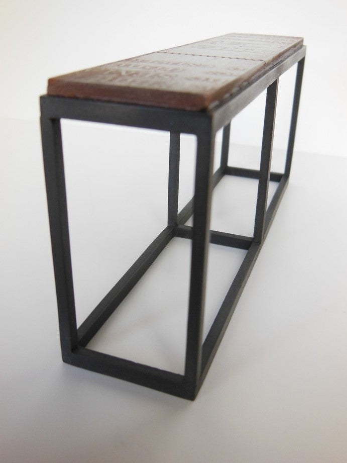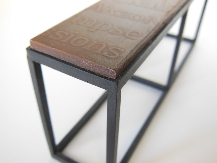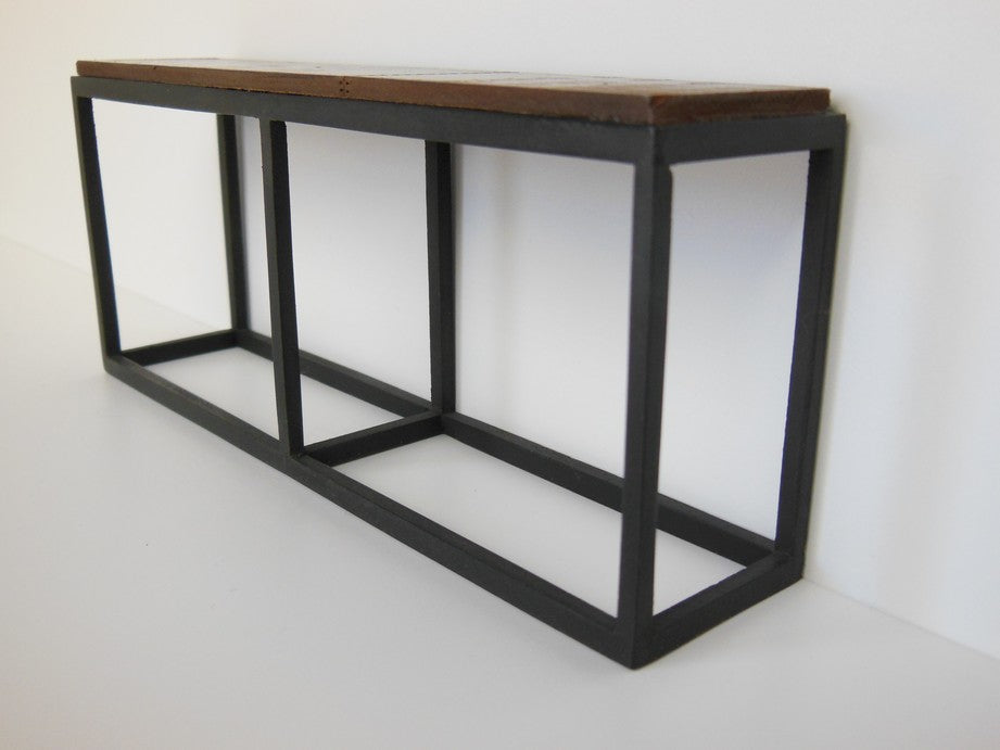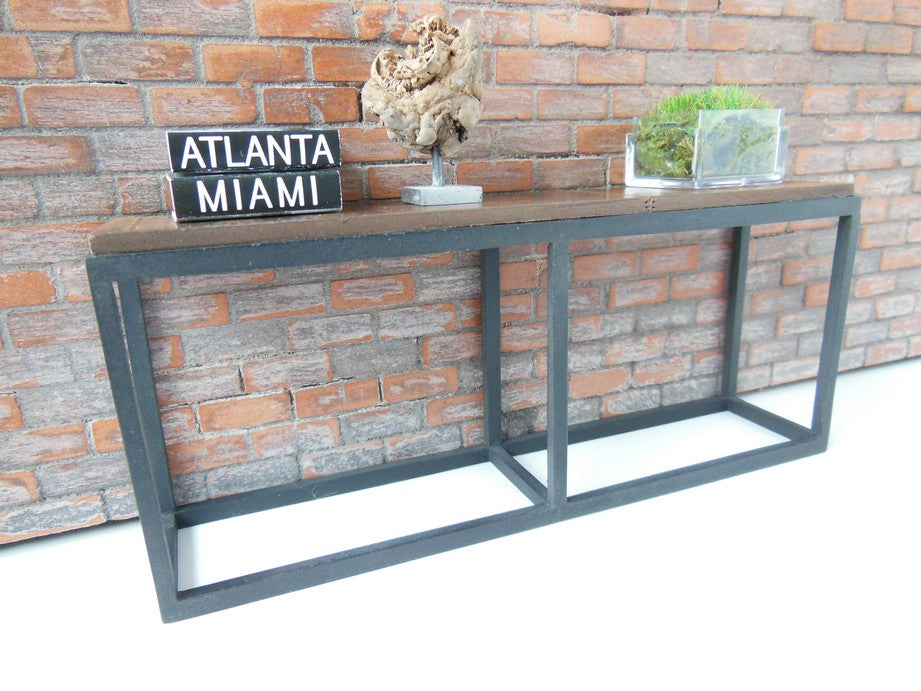 These tables are done in an Industrial style with a cold rolled steel base and rusty patina top. The tops have a variety of detail, including small rivets, and various sections of recycled signs. So each table will have a similar look, but no two will look exactly the same.
