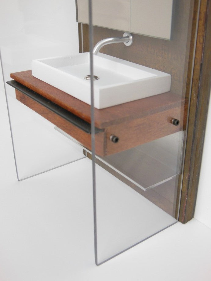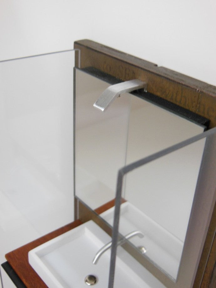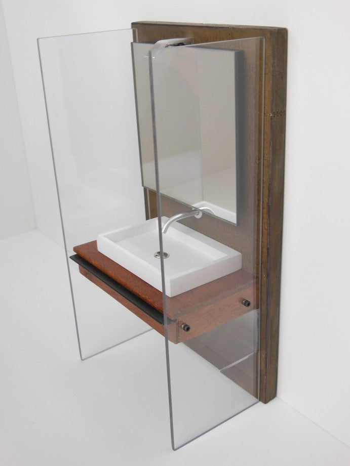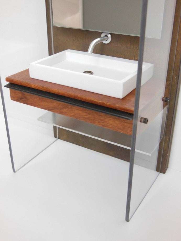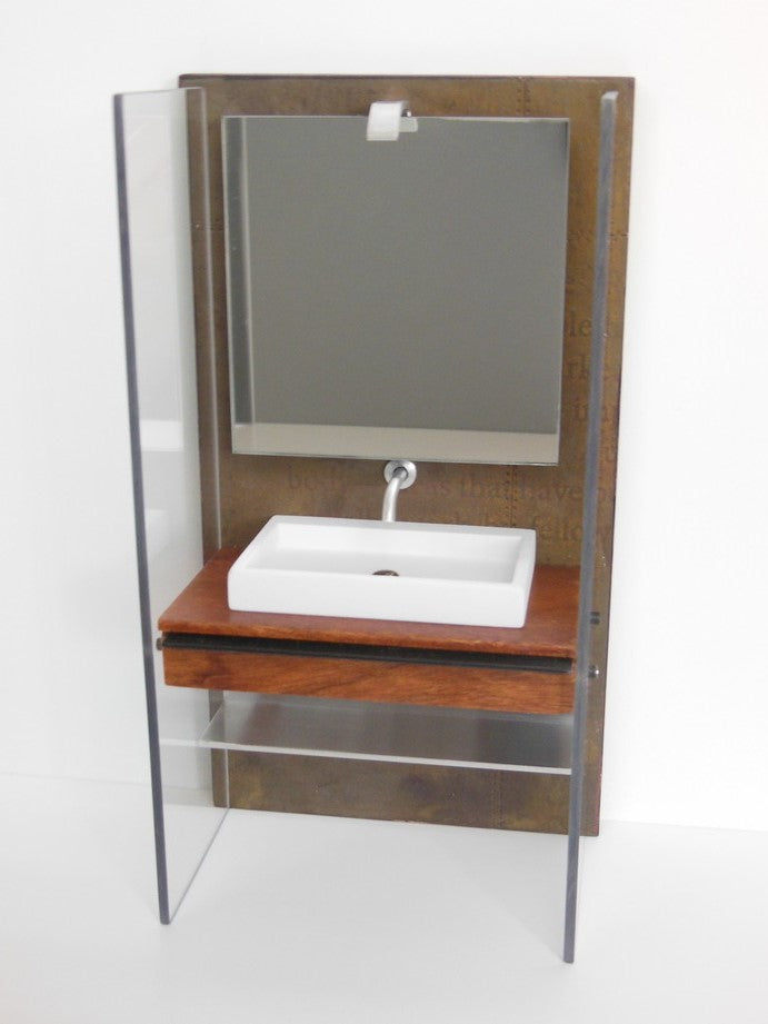 Our Industrial Single Vanity includes: single Kohler style white sink (made of enameled wood), stainless wall mounted faucet, single wall mounted mirror, Mahogany wood vanity with black steel drawer handle, lower aluminum shelf, and privacy panels (NOTE: drawer does not open). The back wall has a rusted patina finish (NOTE: each back wall is unique and will vary). Nickel-lithium battery lighting kit is included (NOTE: For international orders the battery will not be included due to shipping restrictions).