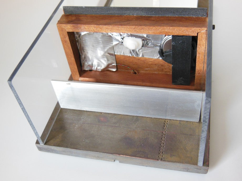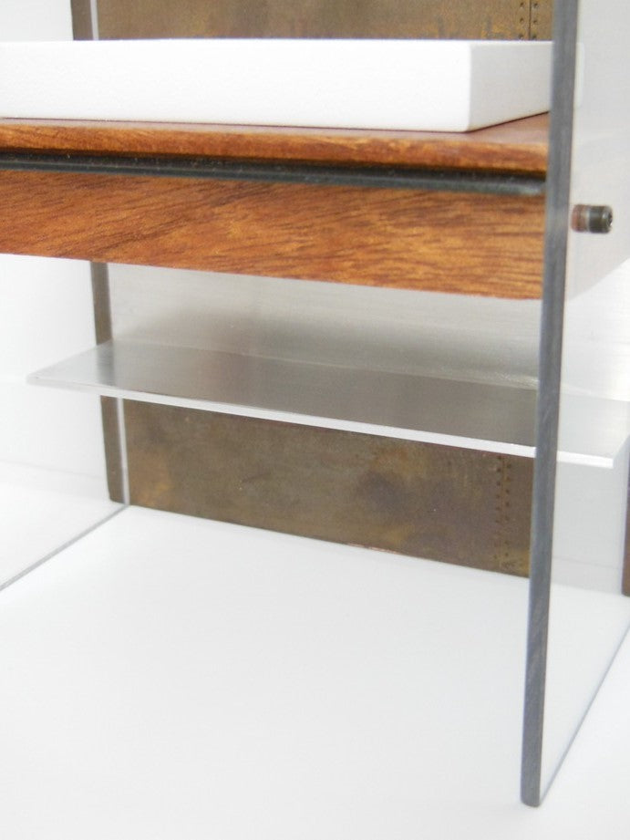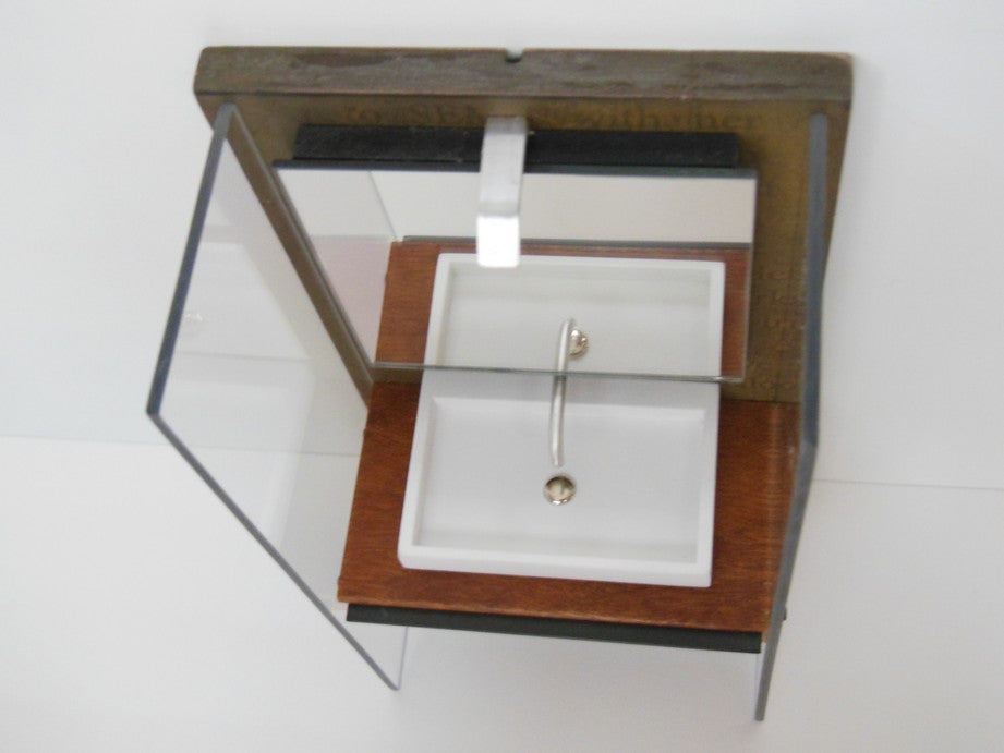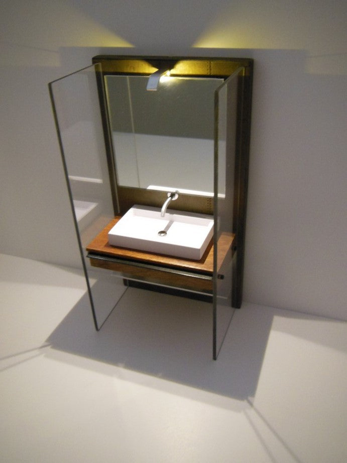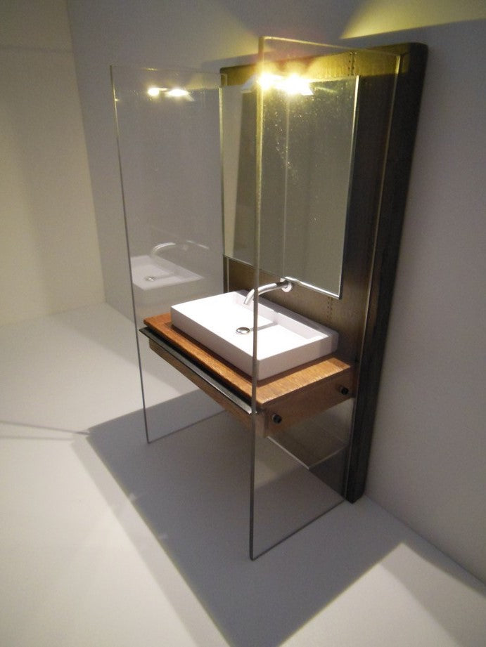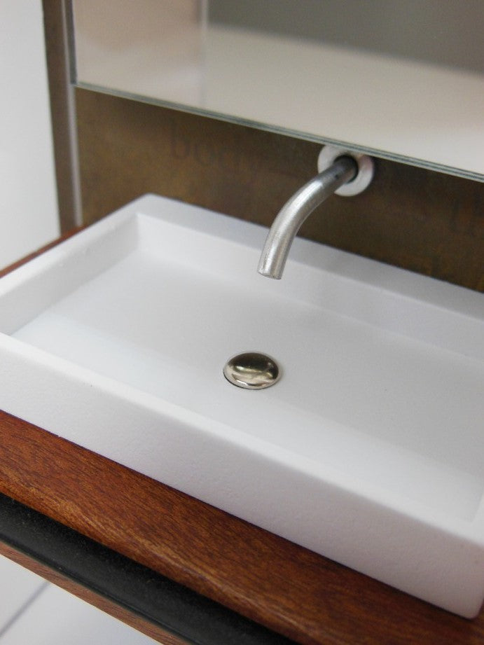Our Industrial Single Vanity includes: single Kohler style white sink (made of enameled wood), stainless wall mounted faucet, single wall mounted mirror, Mahogany wood vanity with black steel drawer handle, lower aluminum shelf, and privacy panels (NOTE: drawer does not open). The back wall has a rusted patina finish (NOTE: each back wall is unique and will vary). Nickel-lithium battery lighting kit is included (NOTE: For international orders the battery will not be included due to shipping restrictions).