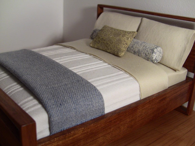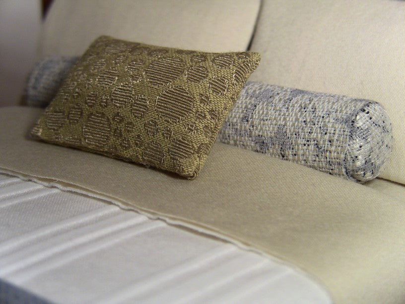 The fresh and crisp look of our Interlude Collection includes our white wide band duvet, desert sand sheet set, cream / blue long bolster pillow, medium gold circle rectangle pillow, and cashmere blue-gray throw. Mattress, standard pillows and bed frame sold separately.