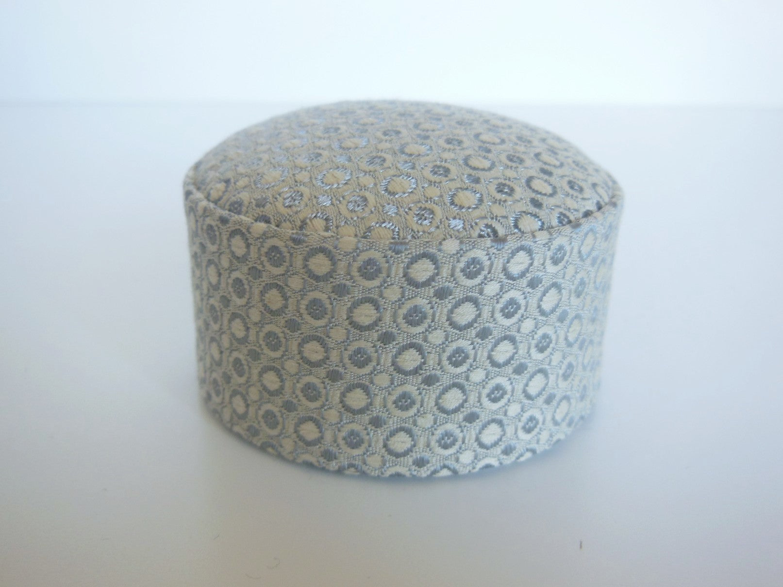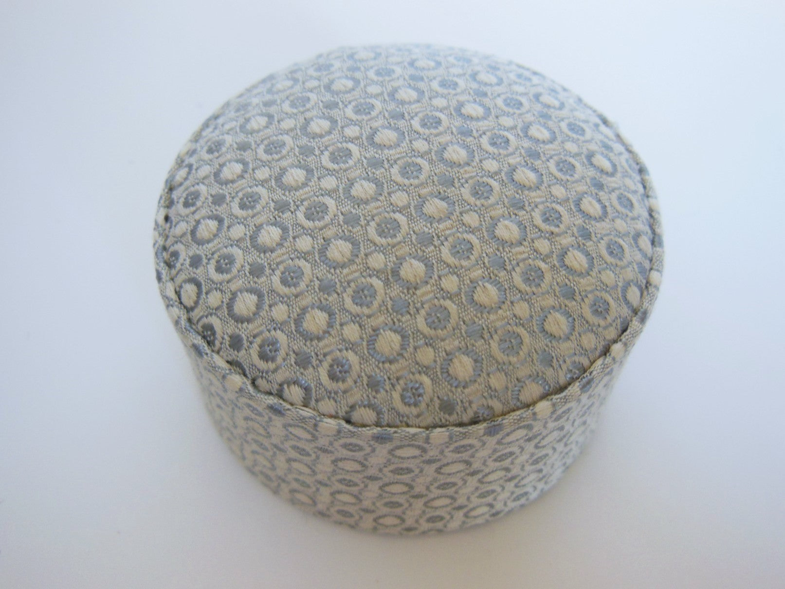 Round ottoman covered in a cream-colored and blue metallic fabric adds a nice polished look to any room plus additional seating.
