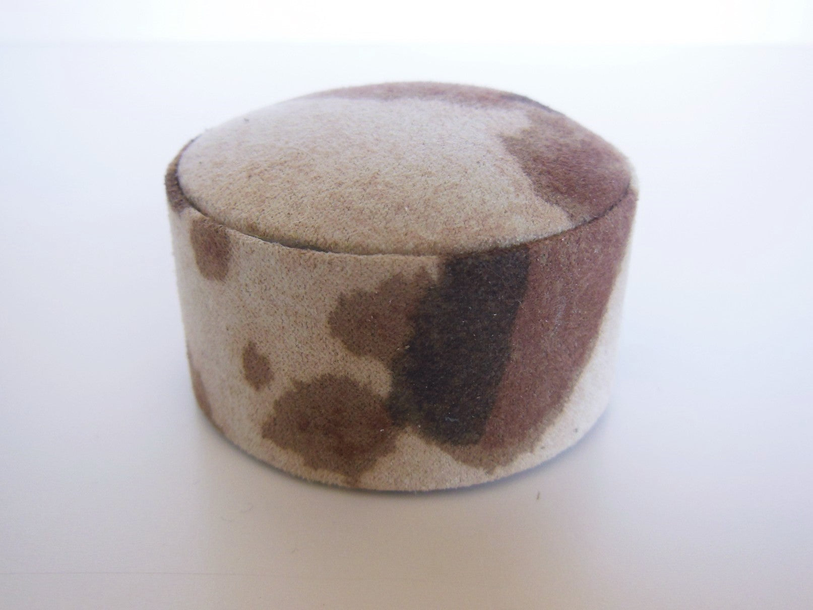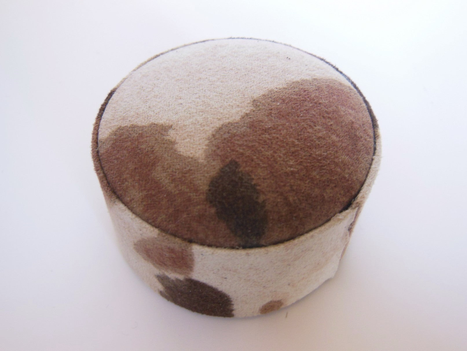 Round ottoman covered in a faux tan/brown/cream pony hide fabric adds a nice polished look to any room plus additional seating.